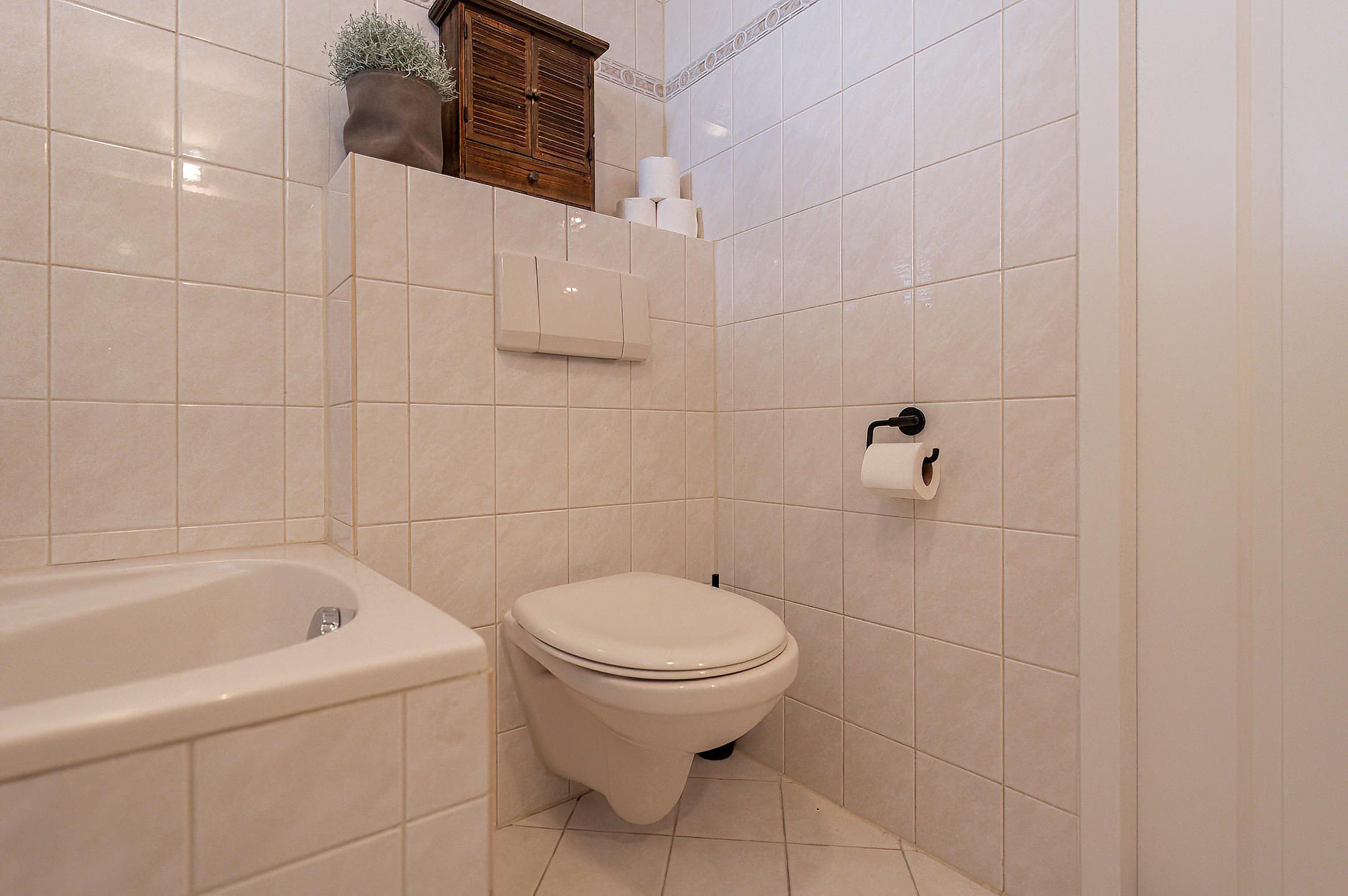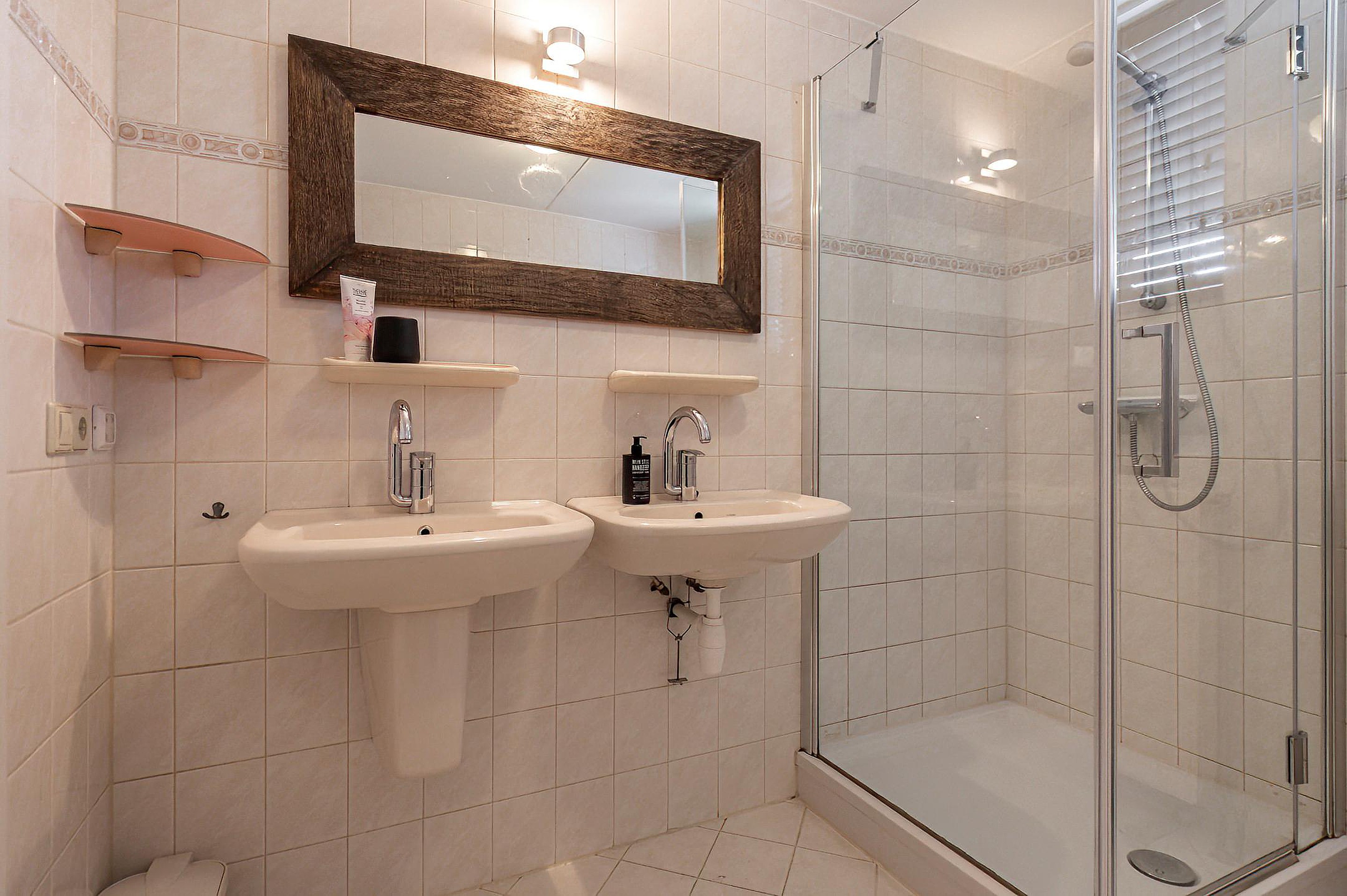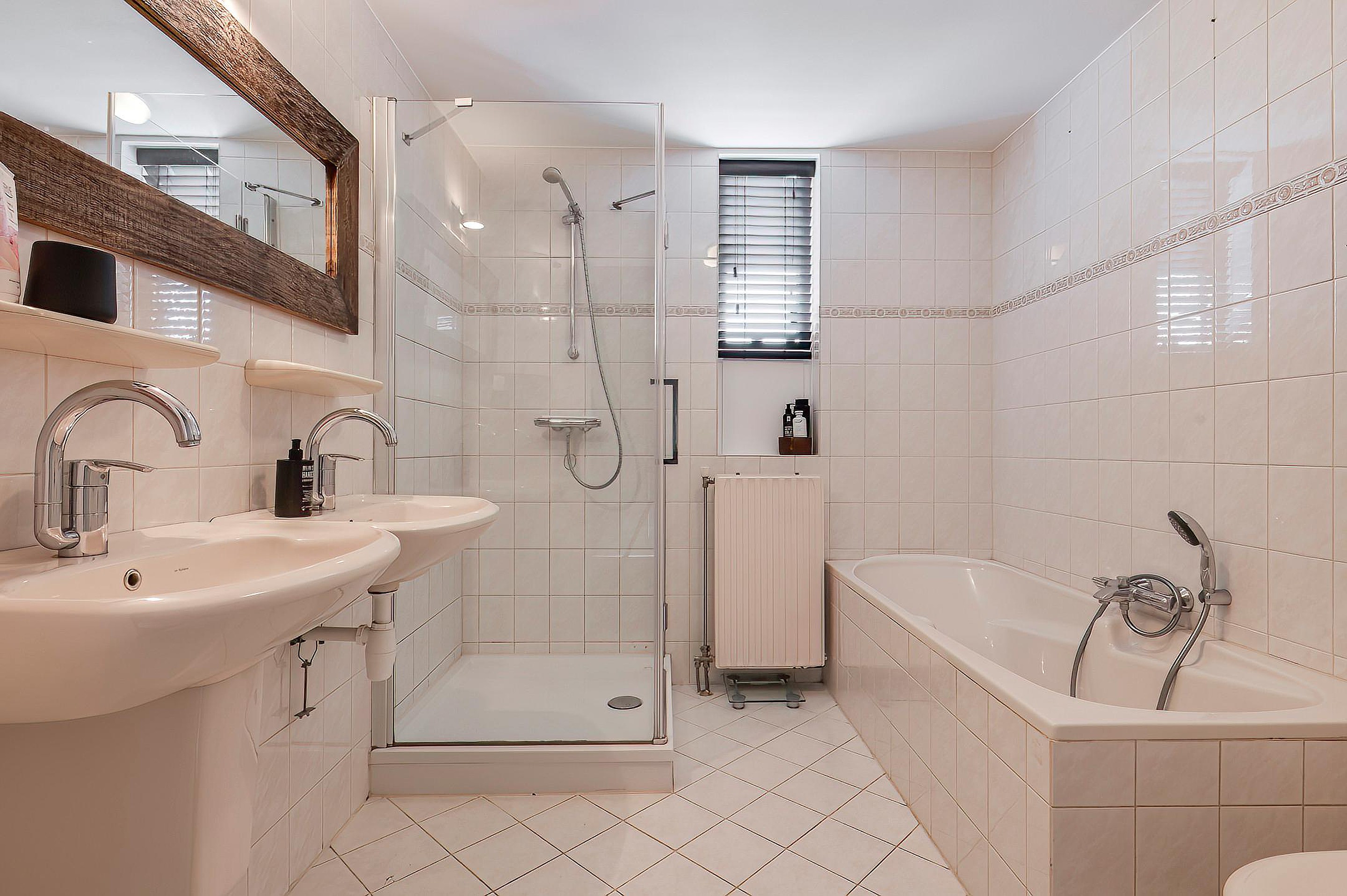 De badkamer is helemaal compleet. We treffen er een dubbele wastafel, ligbad, douchecabine en een 2e toilet aan.