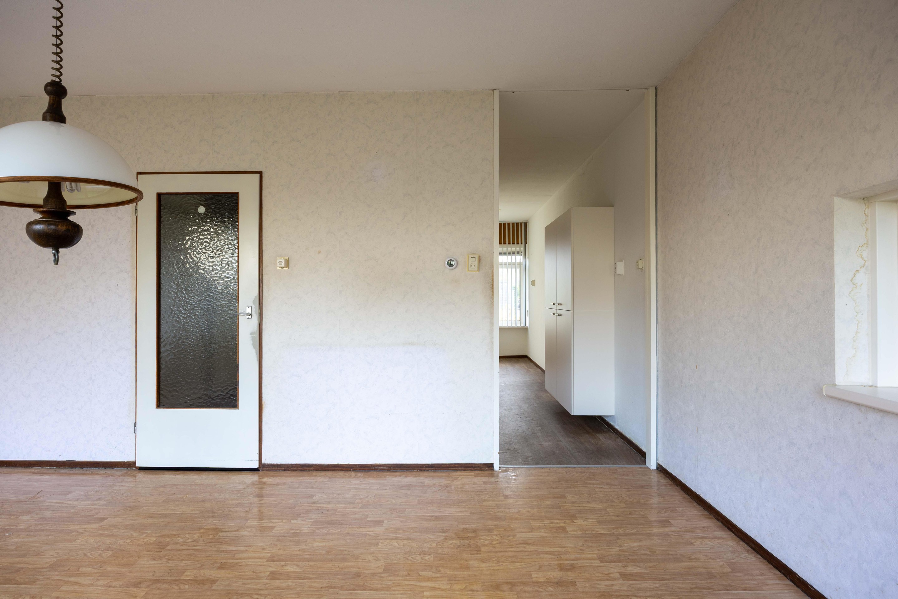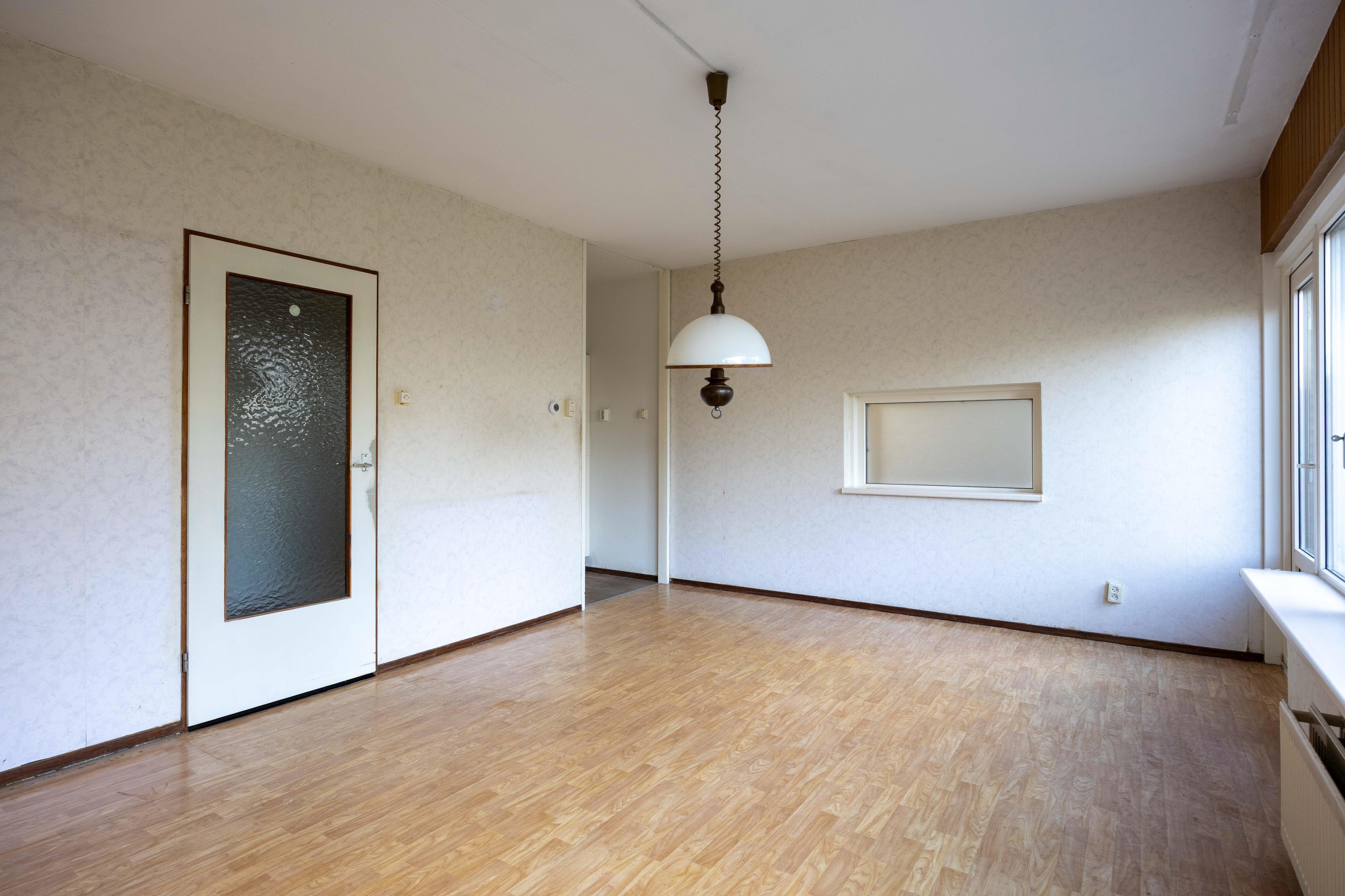 De halfopen keuken bevindt zich aan de zijkant en biedt uitzicht op de voortuin. Hier kun je eventueel een modernere keukenopstelling realiseren of de ruimte uitbreiden tot afgesloten woonkeuken — er is voldoende potentie voor wie graag zelf de handen uit de mouwen steekt.