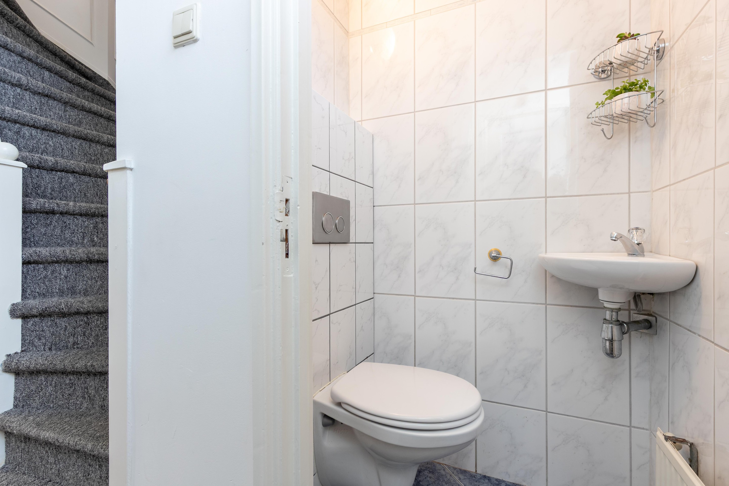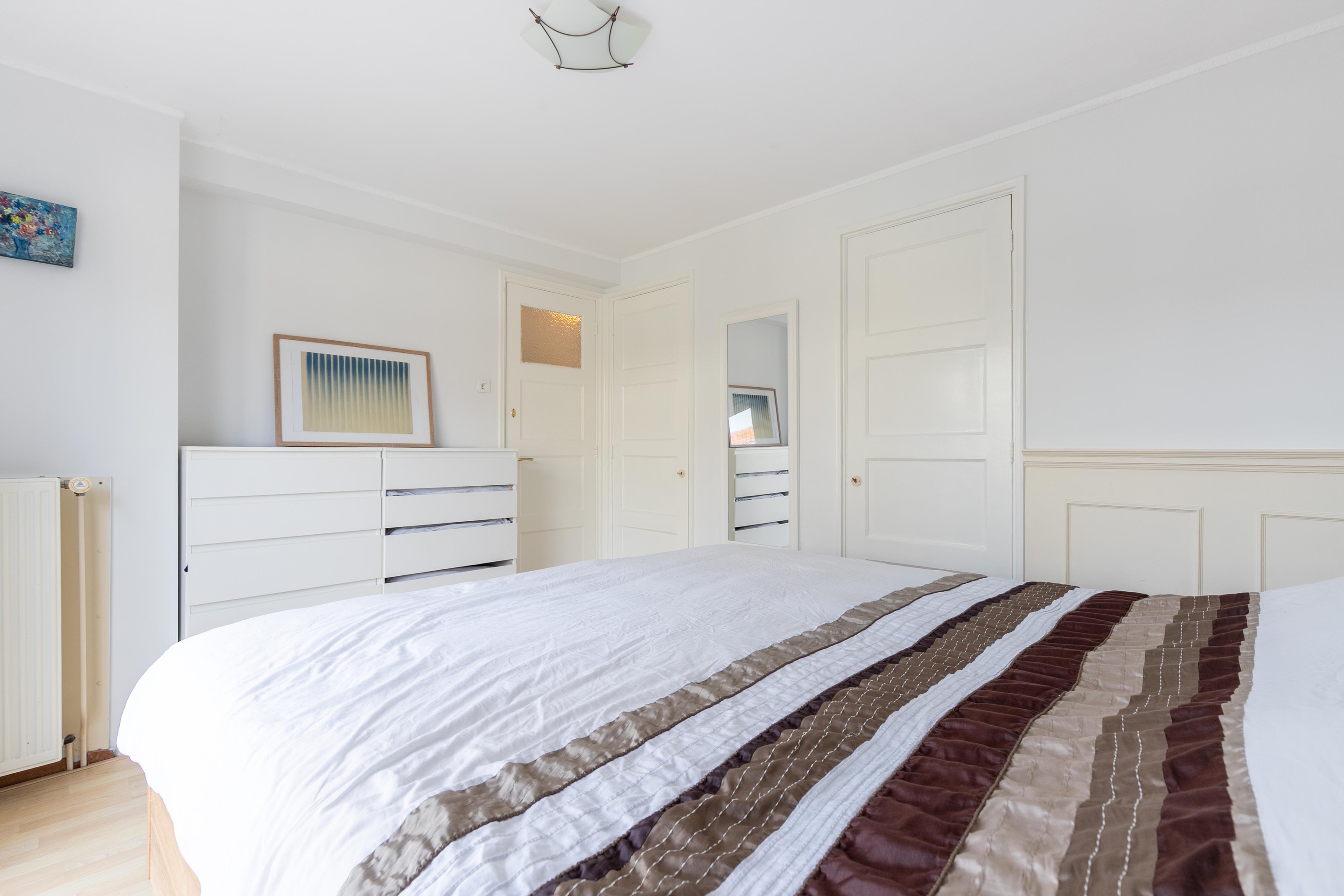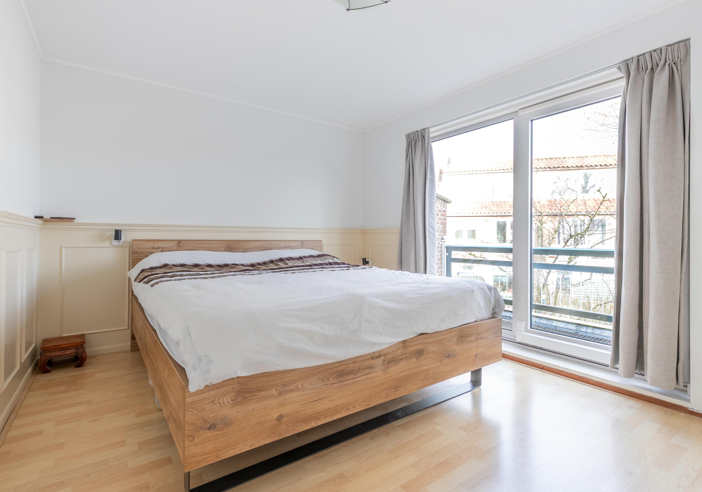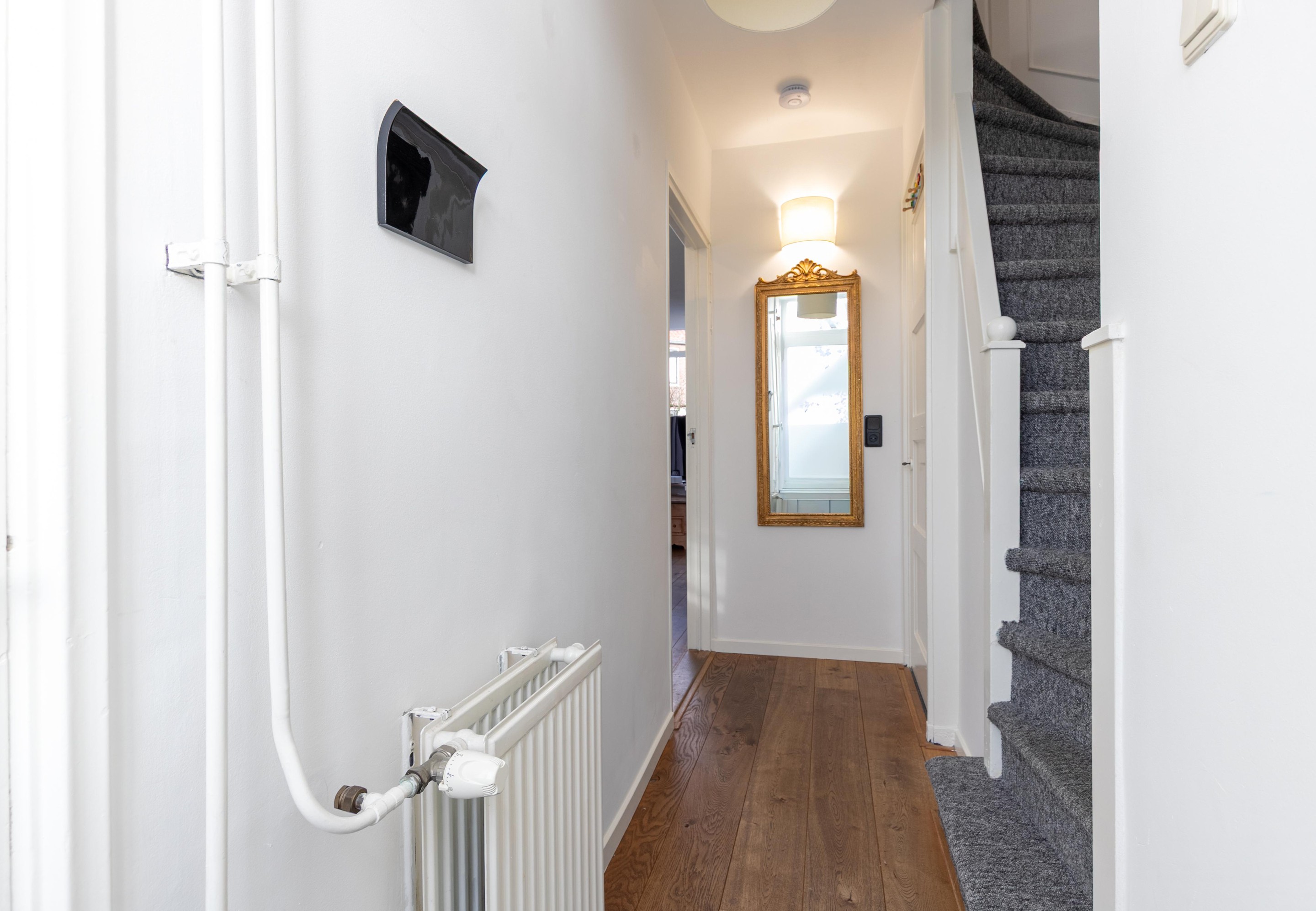 Eerste verdieping Overloop met toegang tot alle vertrekken. Slaapkamer aan de voorzijde voorzien van een vaste kast. Aparte wasruimte met opstelling van de c.v.-combiketel (2021). Royale slaapkamer aan de achterzijde met 2 vaste kasten, schuifpui met toegang tot het balkon. Nette badkamer voorzien van een bad-/douchecombinatie, wastafel in meubel, tweede toilet en designradiator.