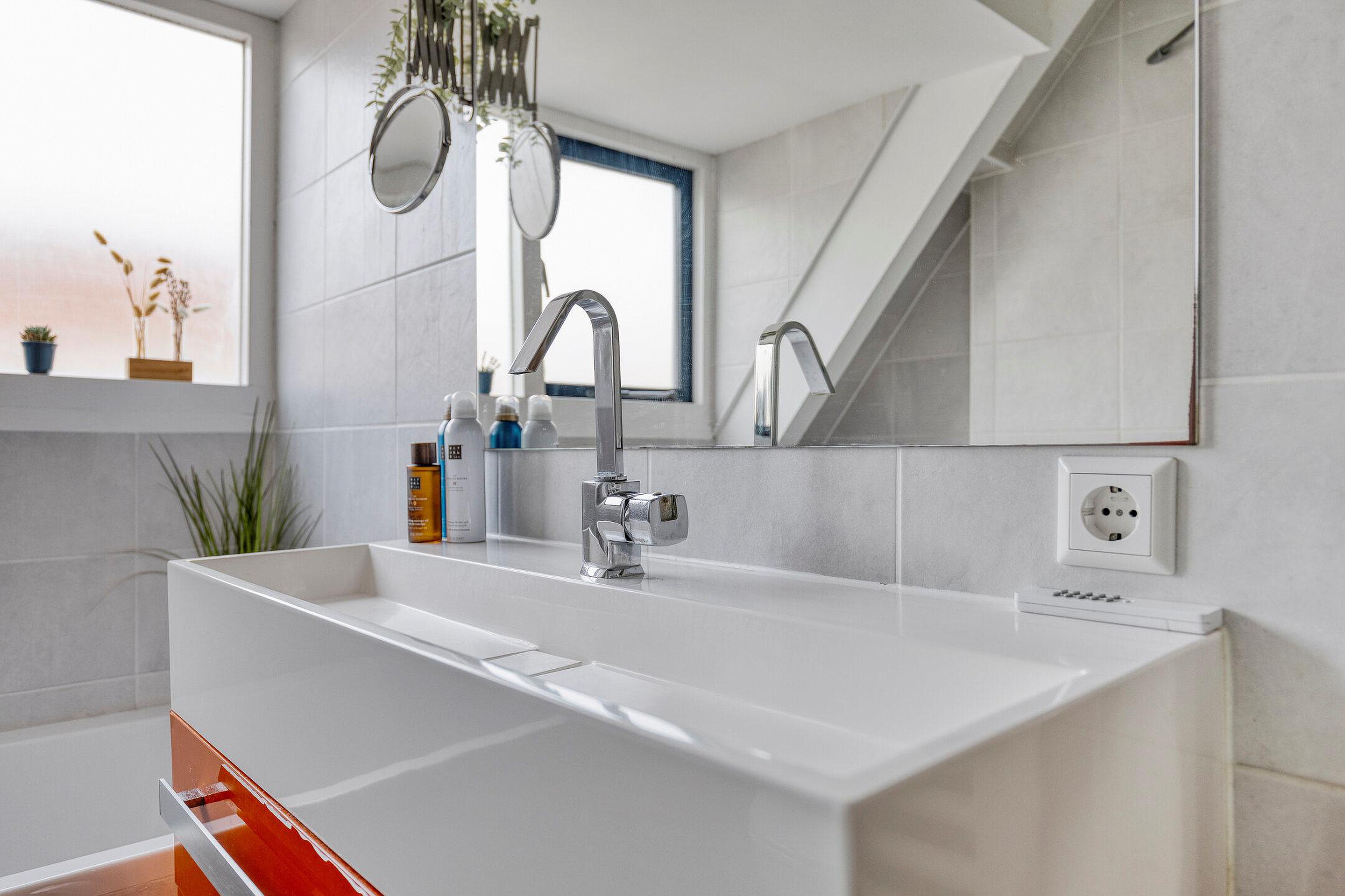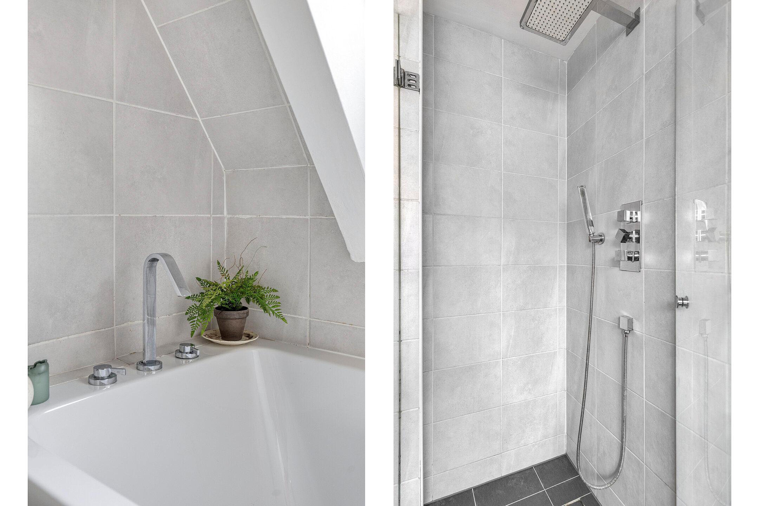 Op de eerste etage kom je op een nette overloop met weer die mooie paneeldeuren. De moderne badkamer is compleet uitgerust met een ligbad, aparte douche en breed wastafelmeubel.