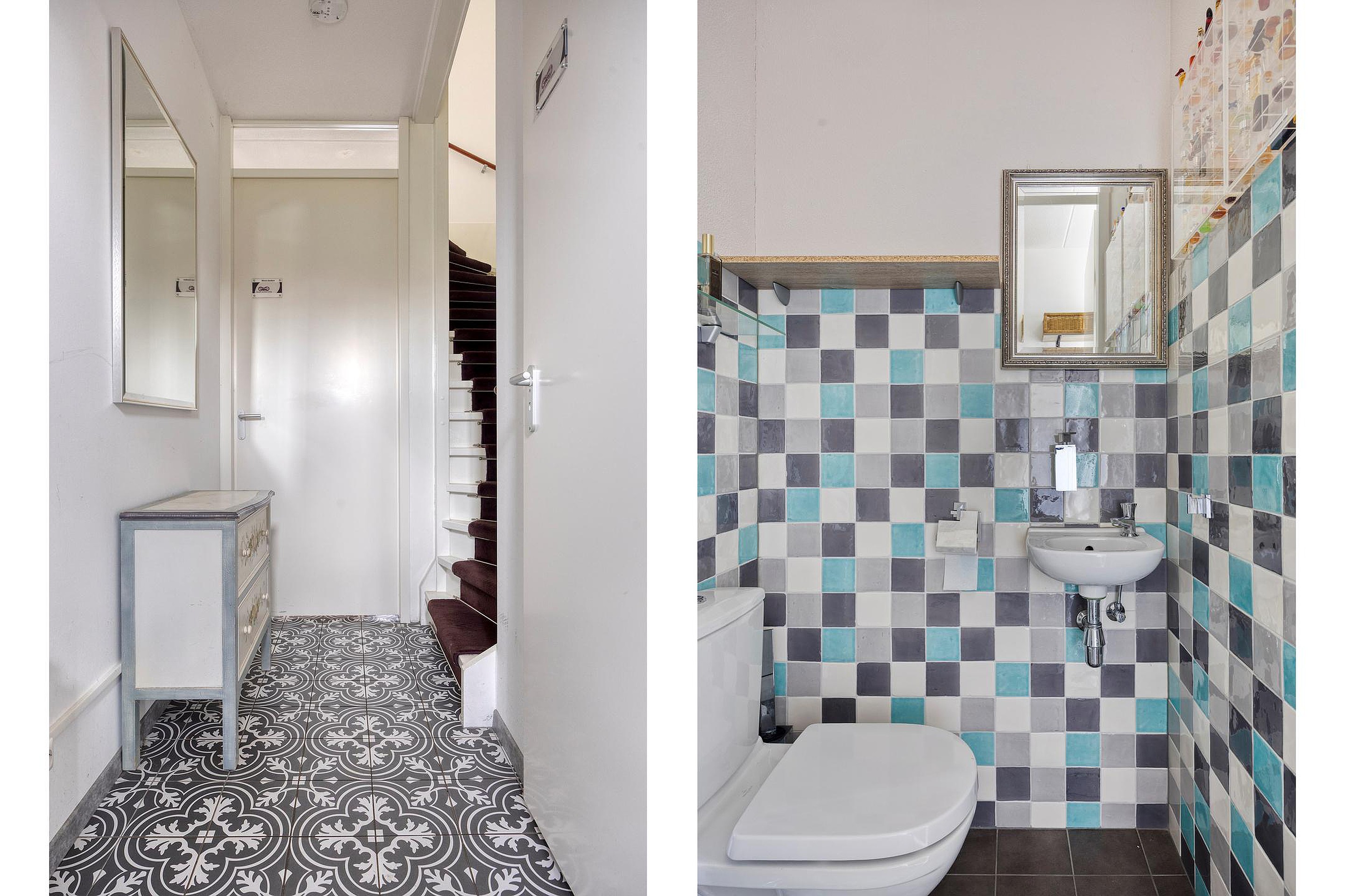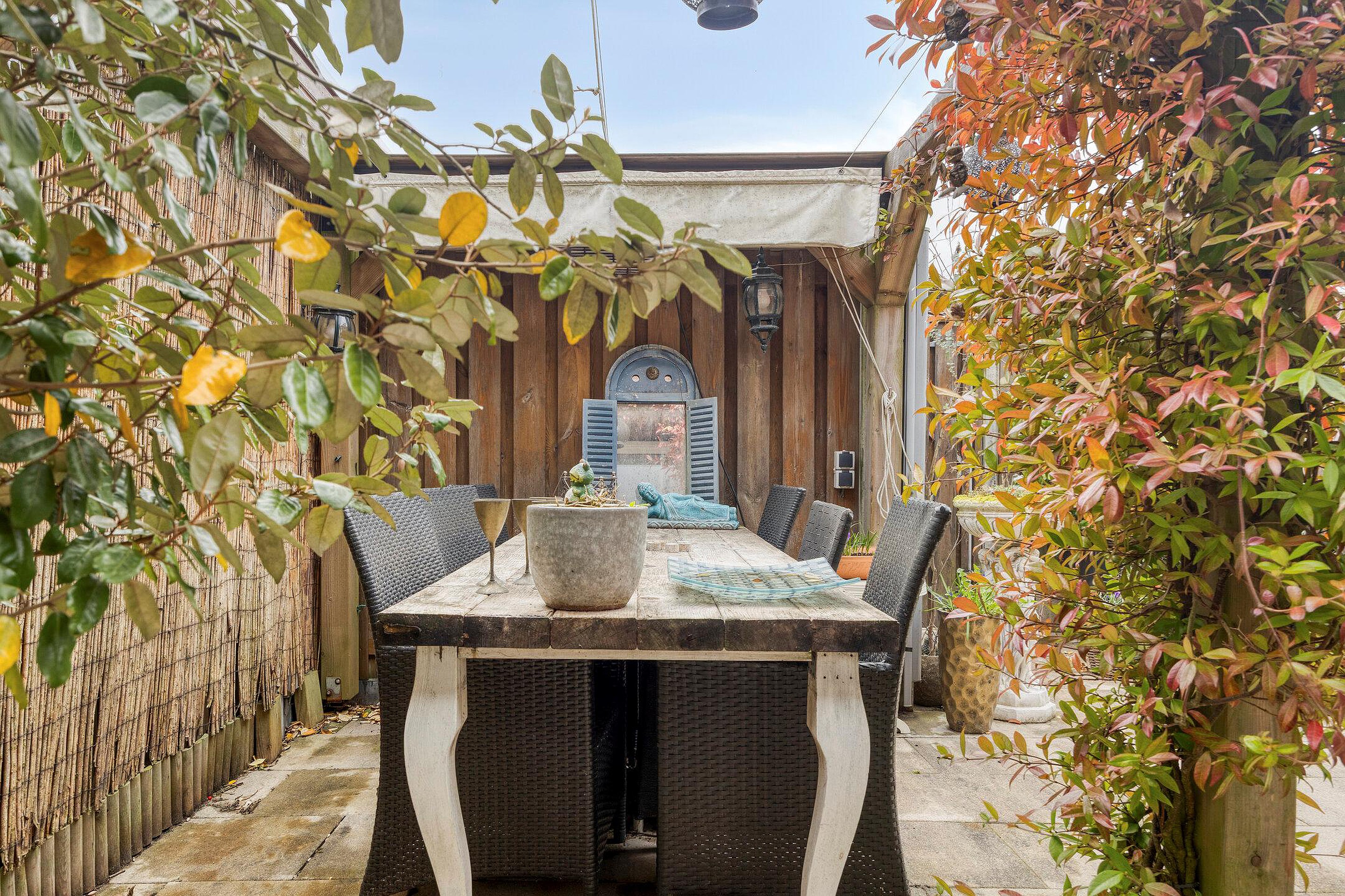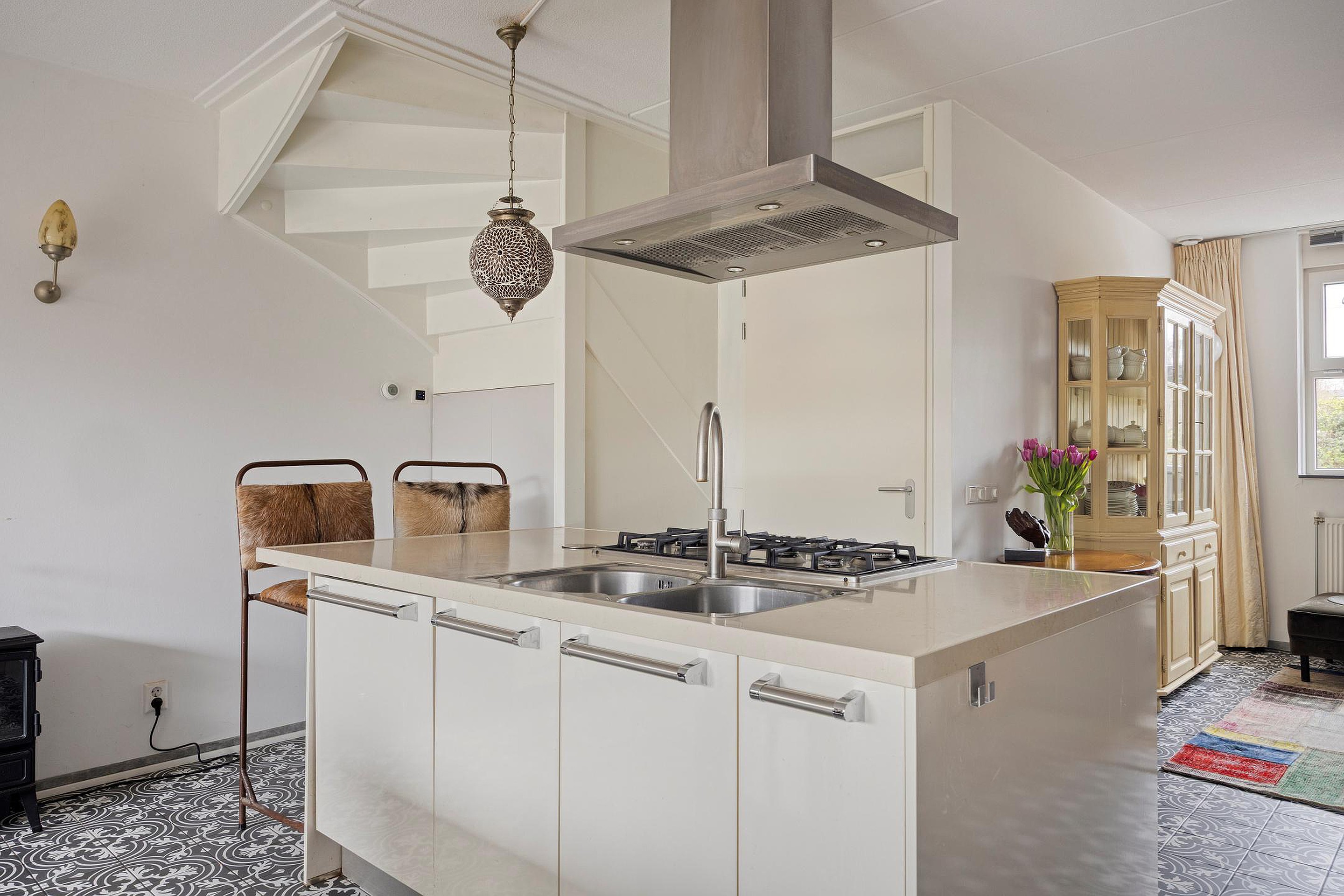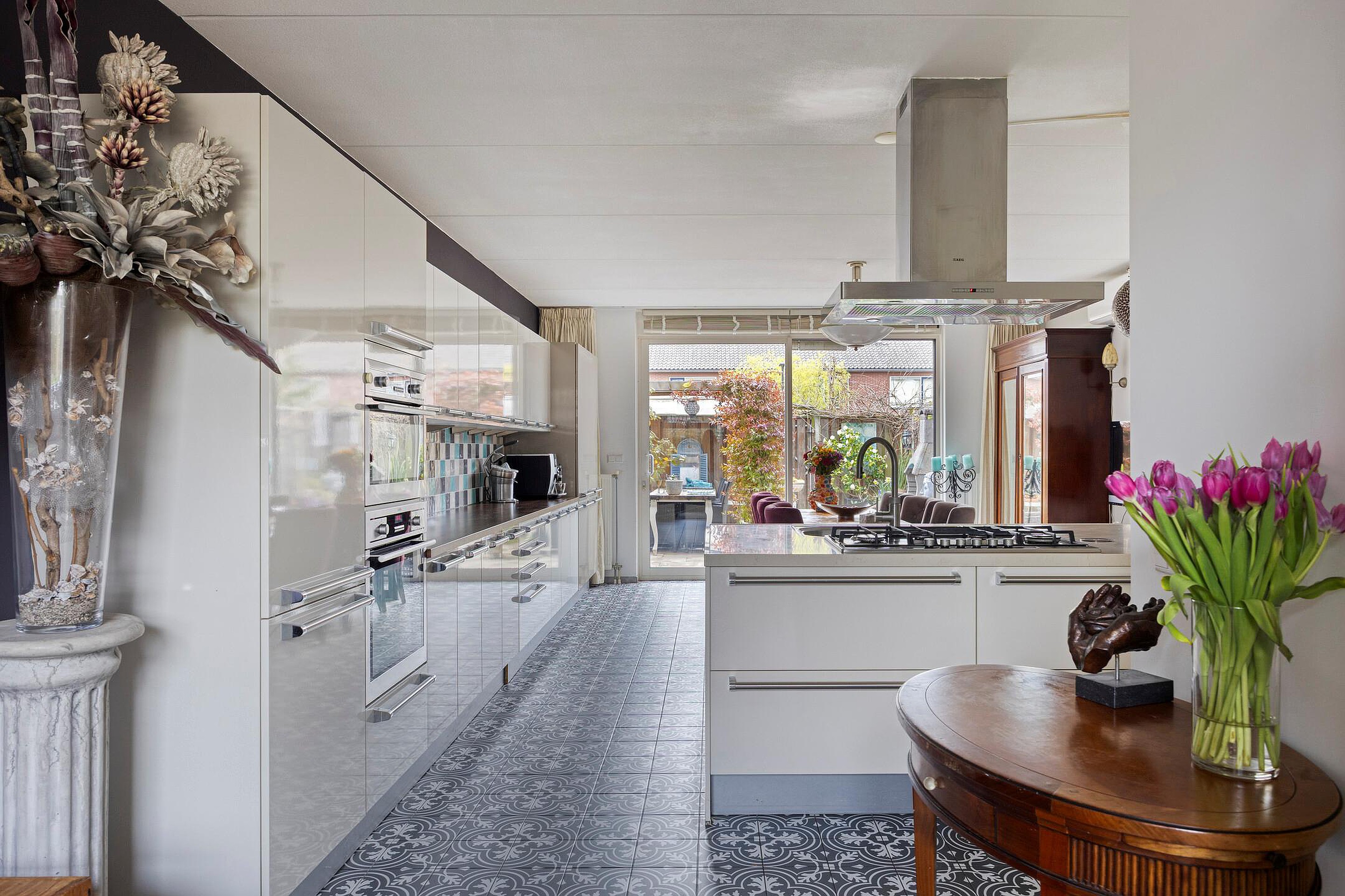 Begane grond Entree woning, hal met meterkast en een moderne toiletruimte met hangend closet + fonteintje. Royale uitgebouwde keukenruimte voorzien van airconditioning. Er is genoeg ruimte voor een grote eettafel in deze gezellige woonkeuken. Beeldt u zich eens in hoe fijn deze plek in huis kan zijn wanneer u vrienden of familie hebt uitgenodigd voor een diner... De niet alledaagse keuken beschikt o.a. over een kookeiland met granieten werkblad, 6-pitskookplaat, rvs afzuigkap, vaatwasser en een eetbar. Aan de lange zijde bevindt zich een kastenwand met houten werkblad, koelkast, vriezer, combi magnetron en een combi oven. Handige opbergruimte vindt u in de trapkast. Door de grote raampartij geniet u van optimaal uitzicht op de achtertuin. Aan de voorzijde van de woning vindt u de intieme living. De hal, living en woonkeuken zijn afgewerkt met een Portugese tegelvloer die zorgt voor een karakteristieke, warme en mediterrane uitstraling. Zonliefhebbers opgelet! Via de schuifpui in de woonkamer bereikt u de heerlijk zonnige achtertuin gelegen op het zuidwesten. Het elektrisch bedienbare zonnescherm, de terrasverwarmer, de houten berging en de achterom zorgen voor comfort. De houten pergola met harmonica schaduwdoek geeft structuur en sfeer aan deze aantrekkelijke tuin. Uw eigen parkeerplaats bevindt zich op het achtergelegen terrein.