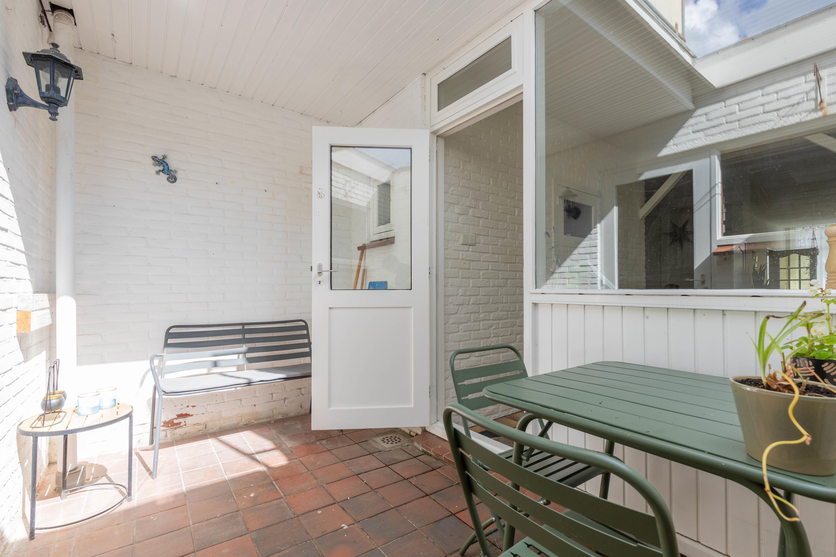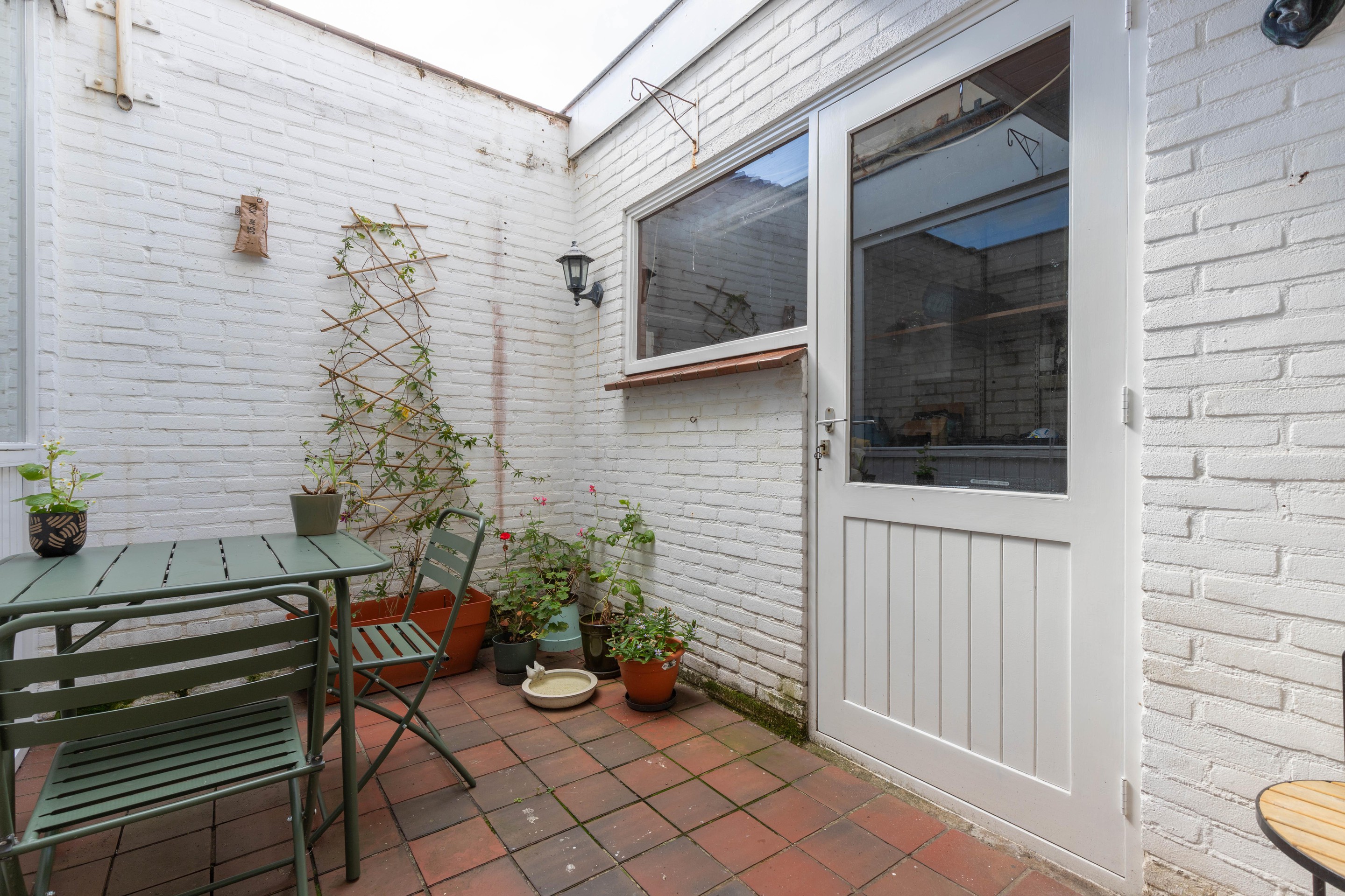 Aan de achterzijde van de woning is een ruimte met opstelplaats van de wasmachine, C.V. en wastafel. Vanuit deze ruimte is er toegang op het zonnige dakterras.