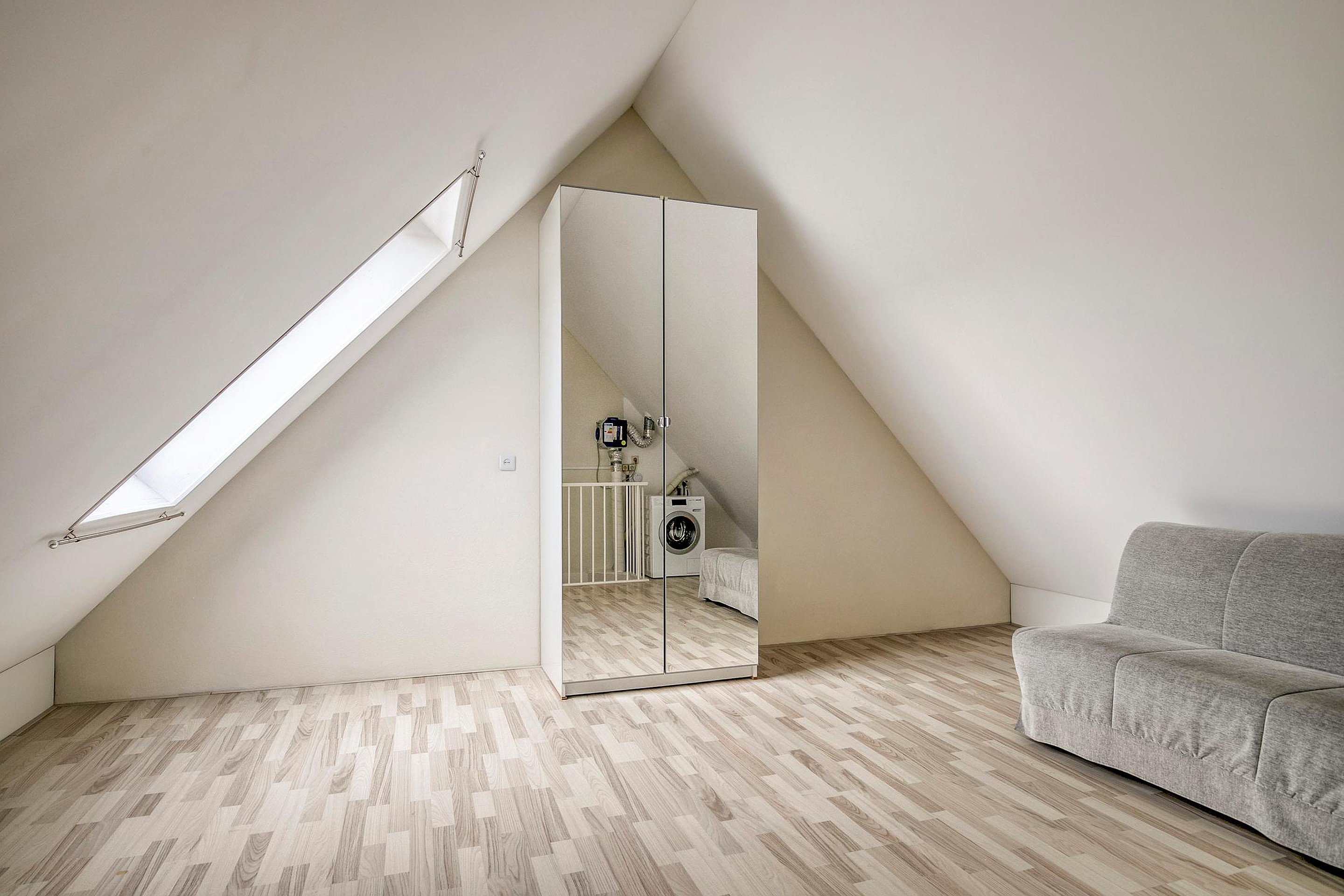 Royale zolderverdieping met wasmachineaansluiting, opstelplaats voor de mechanische ventilatie-unit (2017) en een dakraam.