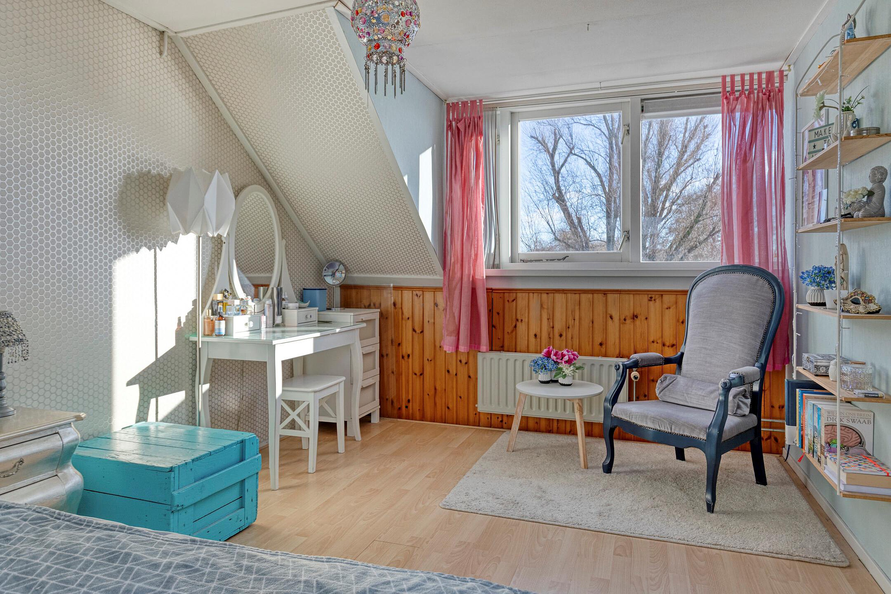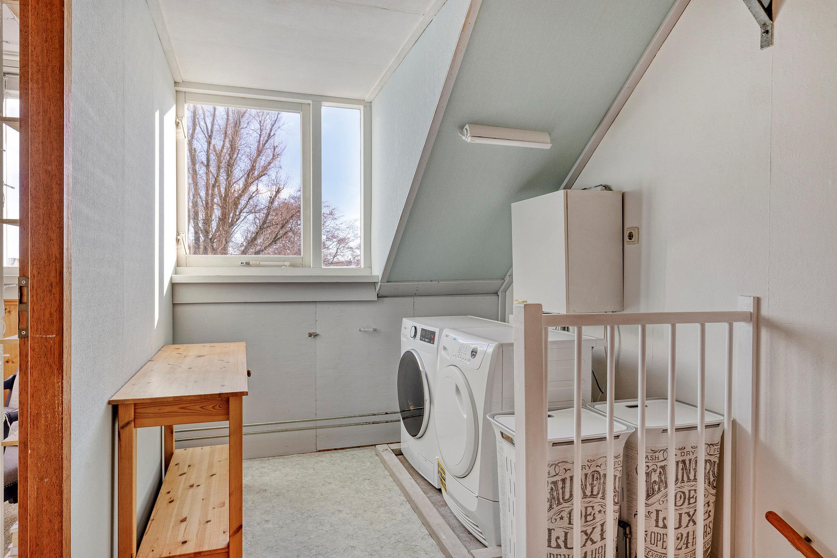 Overloop met wasmachineaansluiting en opstelplaats voor de mechanische ventilatie-unit. De ruime zolder(slaap)kamer beschikt over een dakkapel en een dakraam. Handige opbergruimte vindt u achter de knieschotten.