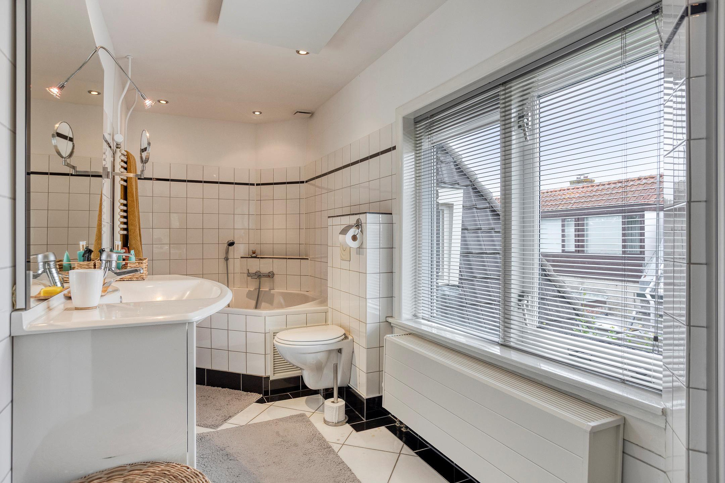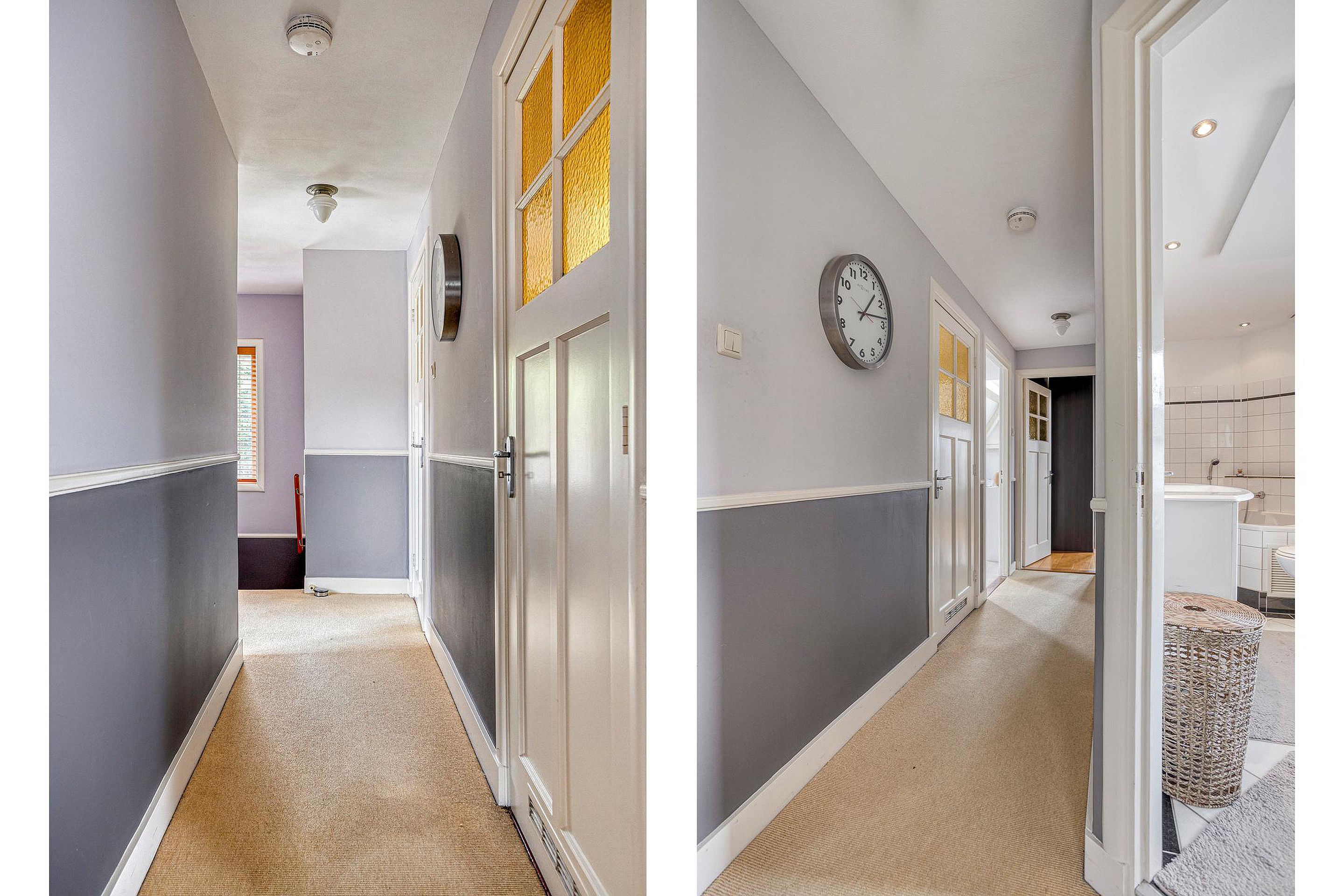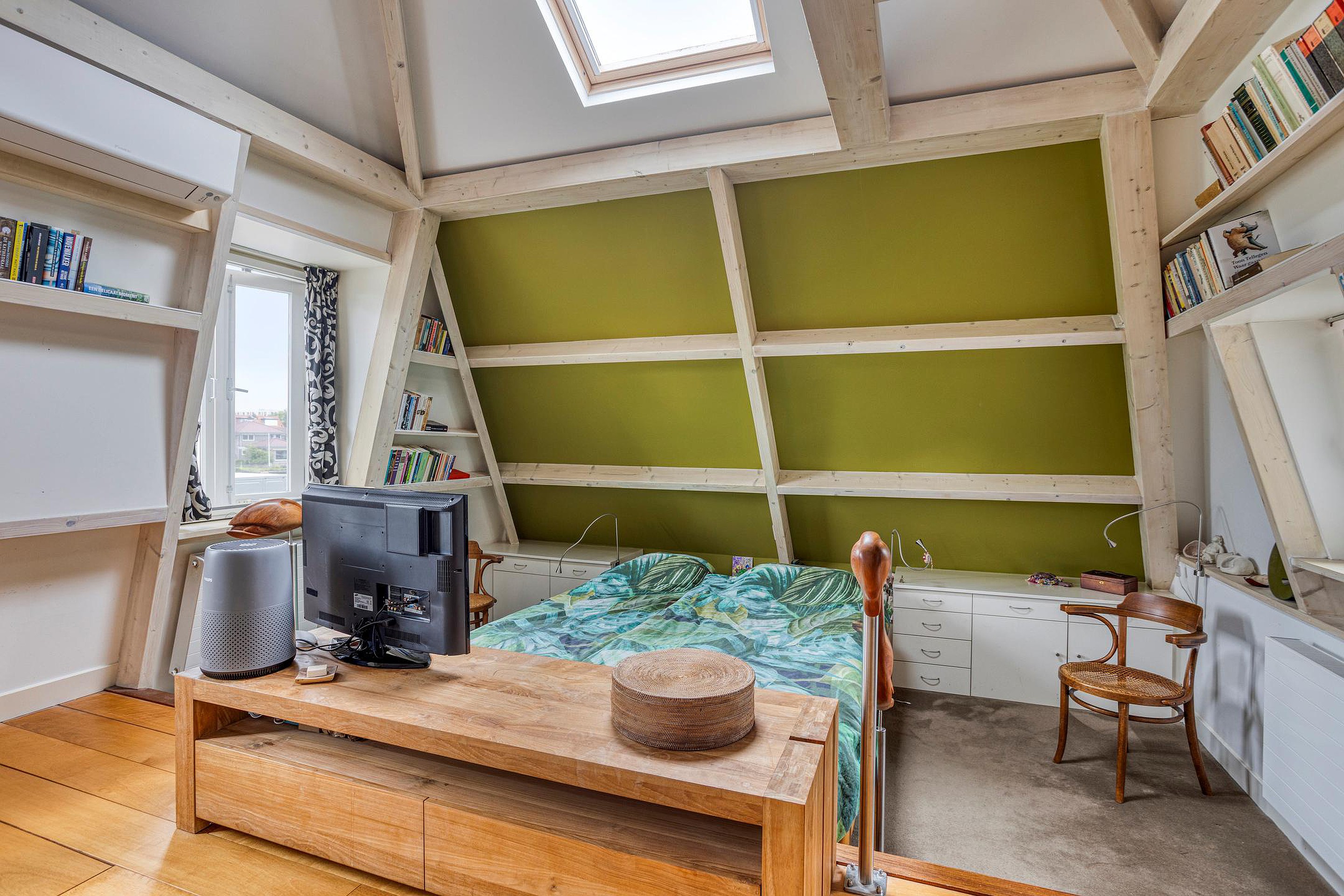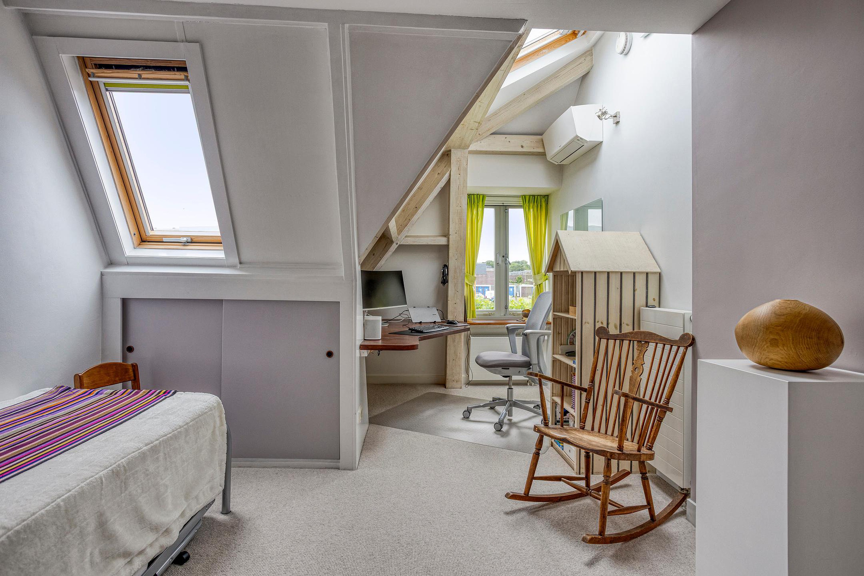 Overloop. Aan de voorzijde van de woning vindt u de ruime ouderslaapkamer met vaste kast en groen uitzicht. Aan de achterzijde van de woning bevinden zich twee sfeervolle slaapkamers met dakramen en uitzicht op de Oude Rijn. De badkamer beschikt over een douche, ligbad, wastafelmeubel, 2e hangend closet en een infra rood paneel aan het plafond.