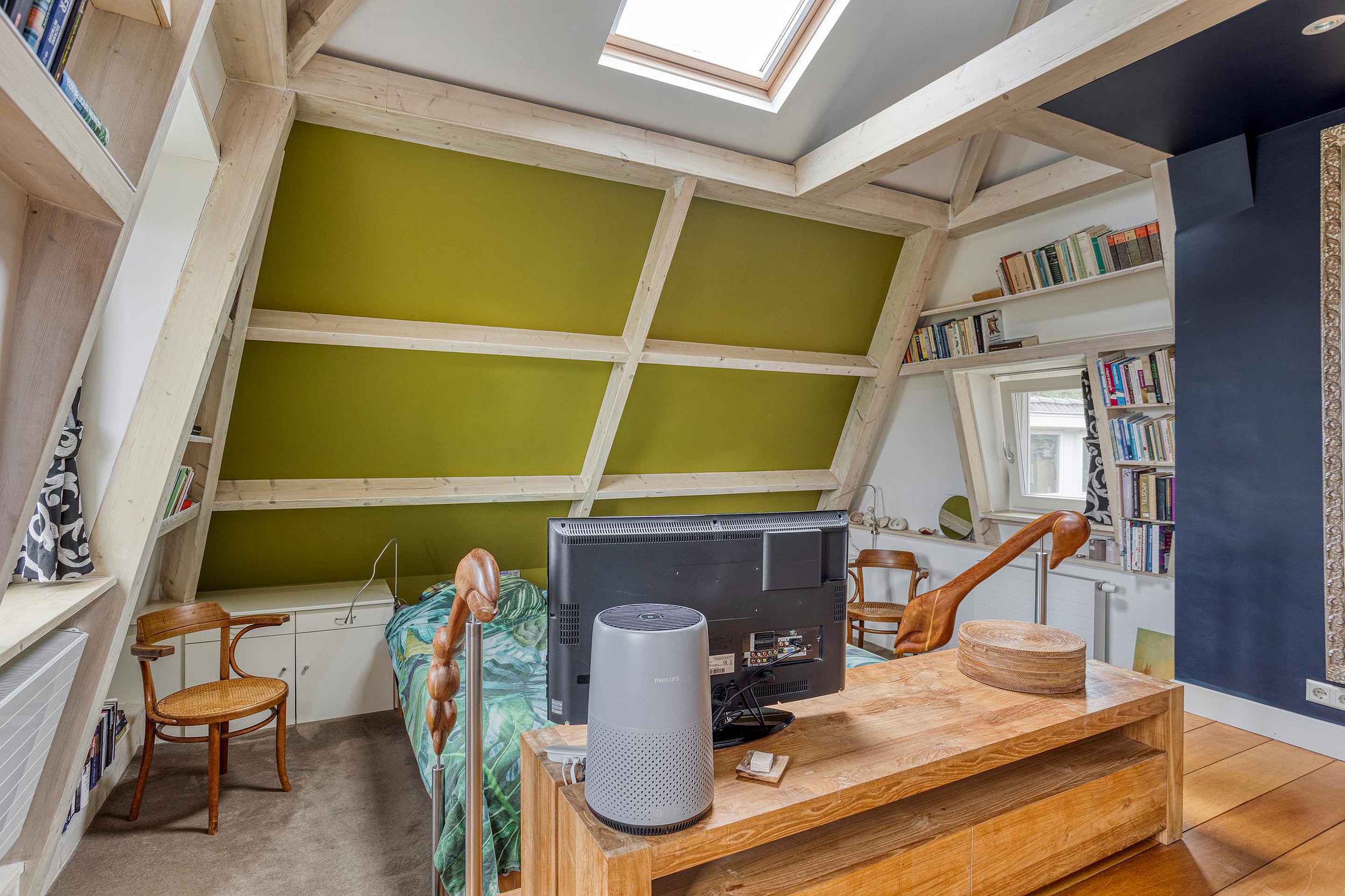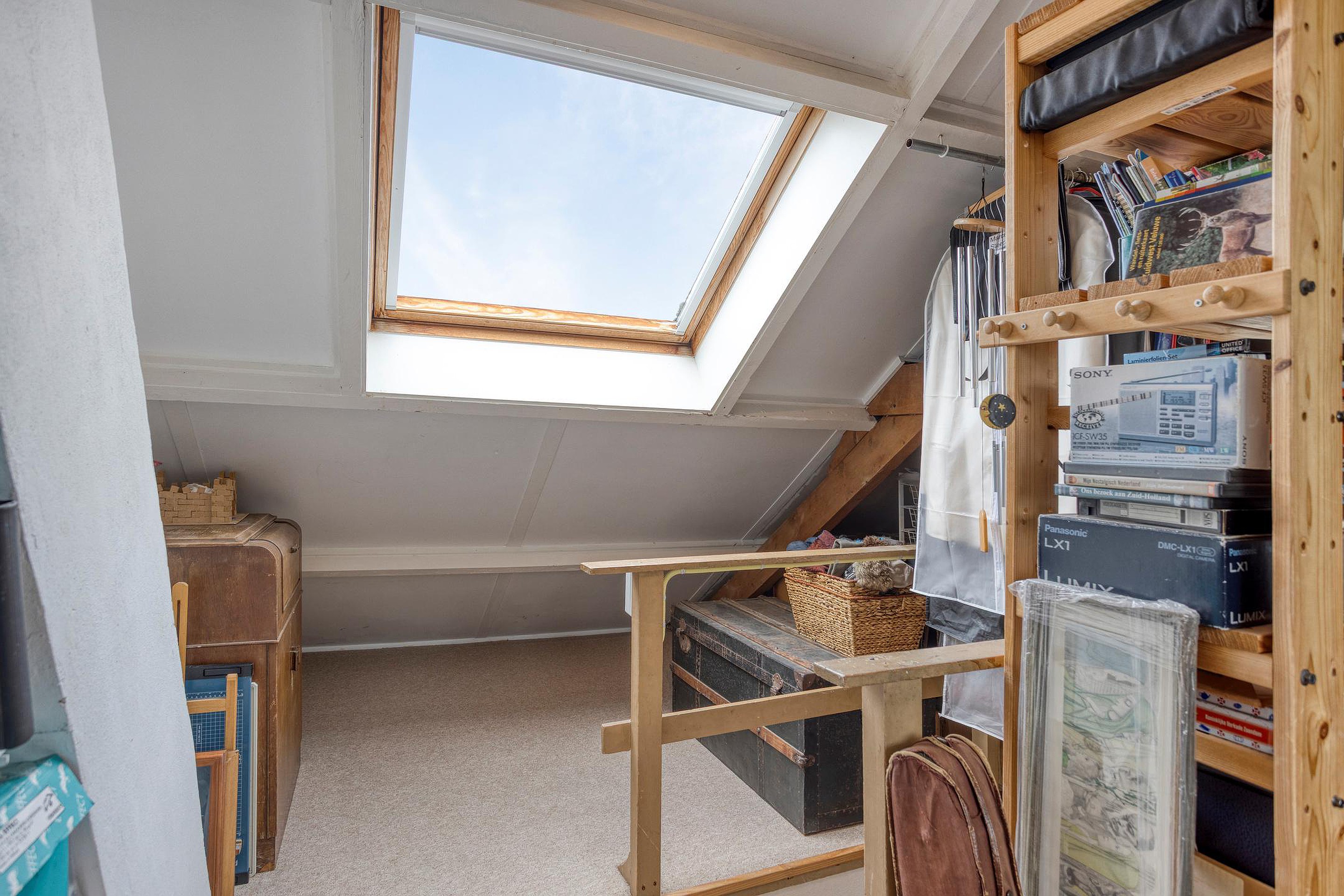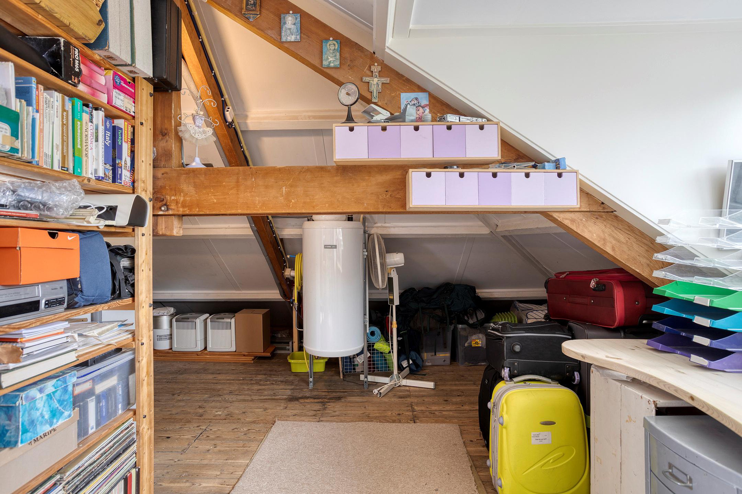 Zolderverdieping met dakkapel, dakraam en opstelplaats voor de boiler (180 L./2023) en lucht/water-warmtepompinstallatie (2023).