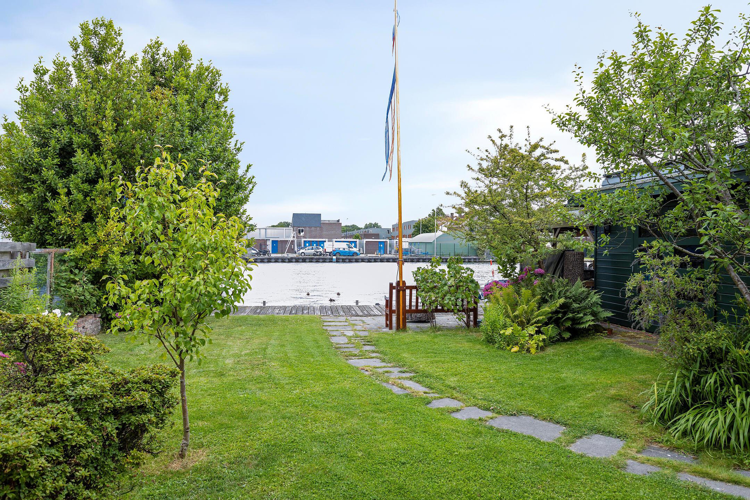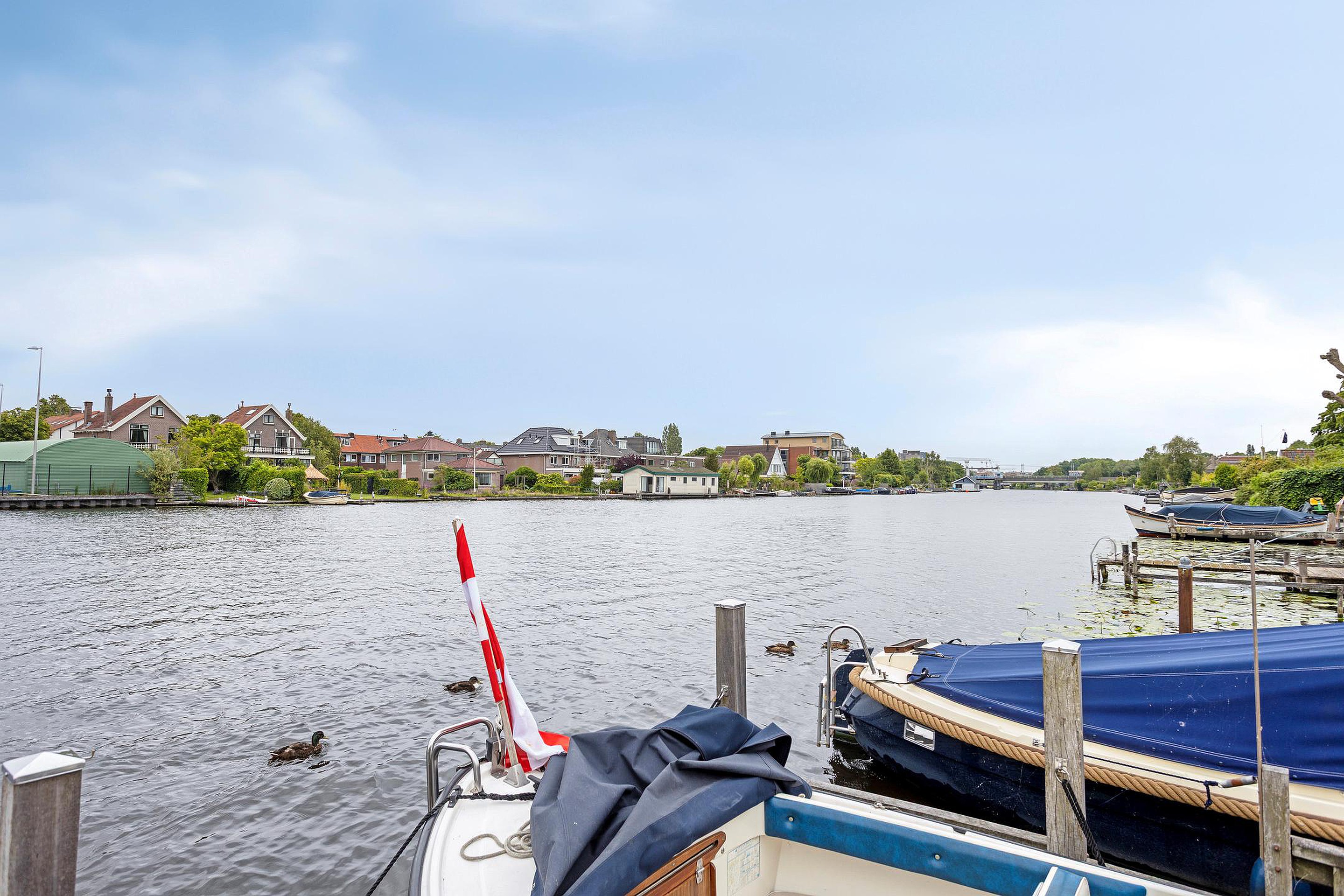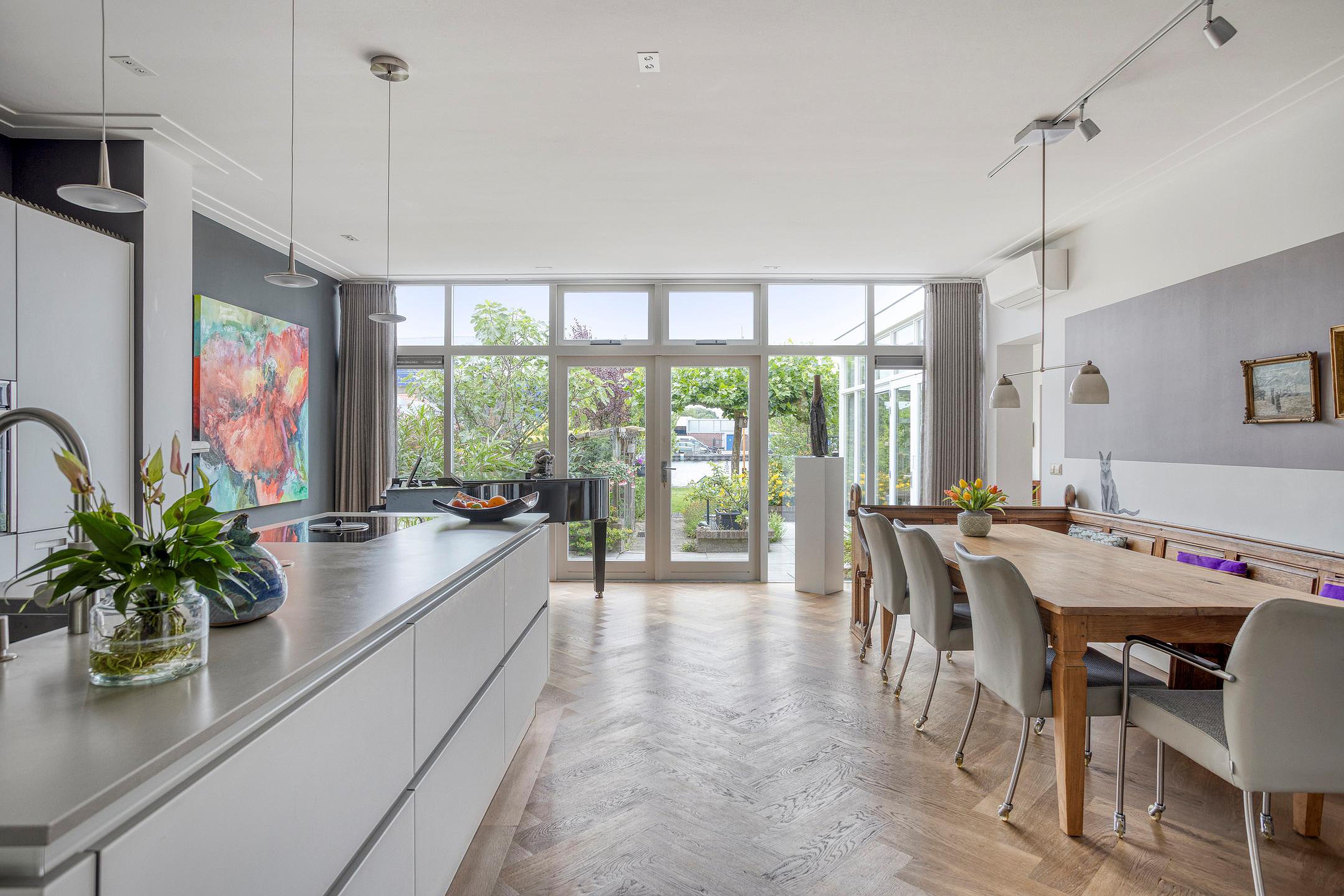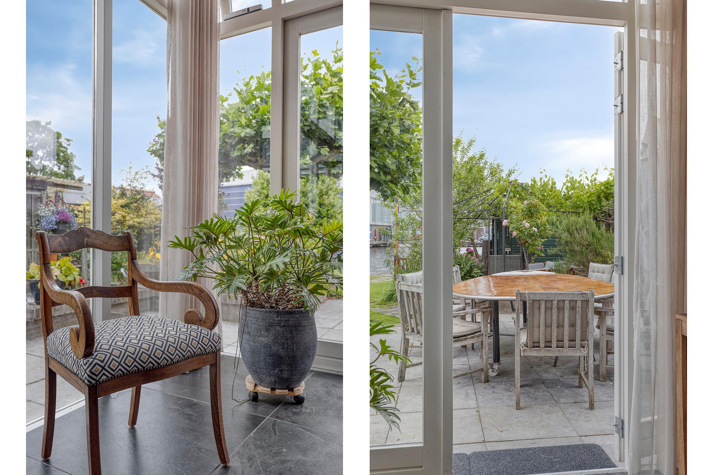 Begane grond Ruime voortuin. Parkeren op eigen terrein inclusief oplaadpunt voor elektrische auto's (ter overname). Aangebouwde stenen garage met dubbele openslaande deuren. Aan de zijkant van de woning bevindt zich de entree. Entree woning, hal, meterkast, toiletruimte, separate wasruimte en de trapopgang naar de eerste verdieping. Leuke (originele) details zoals de granito vloer in de entreehal, paneeldeuren en glas-in-loodramen. Woonkamer ensuite met erker, vaste kasten en voorzien van airconditioning. Vanuit de woonkamer heeft u uitzicht op groen. Door de open haard geniet u het gehele jaar door van een sfeervol vuurtje. De woonkamer en de royale uitgebouwde leefkeuken worden gescheiden door middel van schuifdeuren (schuifseparatie). Er is genoeg ruimte voor een grote eettafel in deze fijne ruimte. De grote raampartij zorgt voor veel daglicht en aantrekkelijk uitzicht. Fijne plek in huis wanneer u vrienden of familie hebt uitgenodigd voor een diner. De luxe keuken (2017) zal het hart van de echte keukenprins(es) zeker sneller doen kloppen! Kookeiland met inductiekookplaat inclusief geïntegreerde afzuiging (Bora) en Quooker. De apparatenkast met koel/vriescombinatie, combi stoomoven (Neff), combi oven inclusief warmtelade en vaatwasser maakt het geheel compleet. De woonkamer en leefkeuken zijn afgewerkt met een in visgraat patroon gelegde eikenhouten vloer. De in 2011 aangebouwde tuinkamer is afgewerkt met een tegelvloer en uitermate geschikt is als thuiswerkplek/kantoor en/of hobbyruimte. Door grote raampartij is deze ruimte opvallend licht en geniet u van optimaal zicht op de achtertuin. Ook vanuit de tuinkamer is de garage bereikbaar. De woonkamer, leefkeuken en tuinkamer zijn voorzien van vloerverwarming. Tuin en water(sport)liefhebbers opgelet! De opvallend diepe en zonnige achtertuin met buitendouche (warm water d.m.v. een boiler), houten berging en volière (kippenhok) is gelegen aan het water (Oude Rijn) en biedt u de mogelijkheid om met uw boot aan te meren (ligplaatsvergunning vereist). Door z'n ruime afmeting en ligging van de tuin kunt u de hele dag van de zon genieten. Beeld u eens in… Het is zomer. U komt thuis. Even bijkomen, genieten van de zon en de dag doorspreken onder het genot van een gekoeld drankje met uitzicht op o.a. voorbijkomende (plezier)vaart. Vanuit uw tuin stapt u in uw boot en vaart u bijvoorbeeld naar het bruisende centrum van Leiden, recreatiegebied Vlietland of de Kagerplassen. Onwerkelijk?