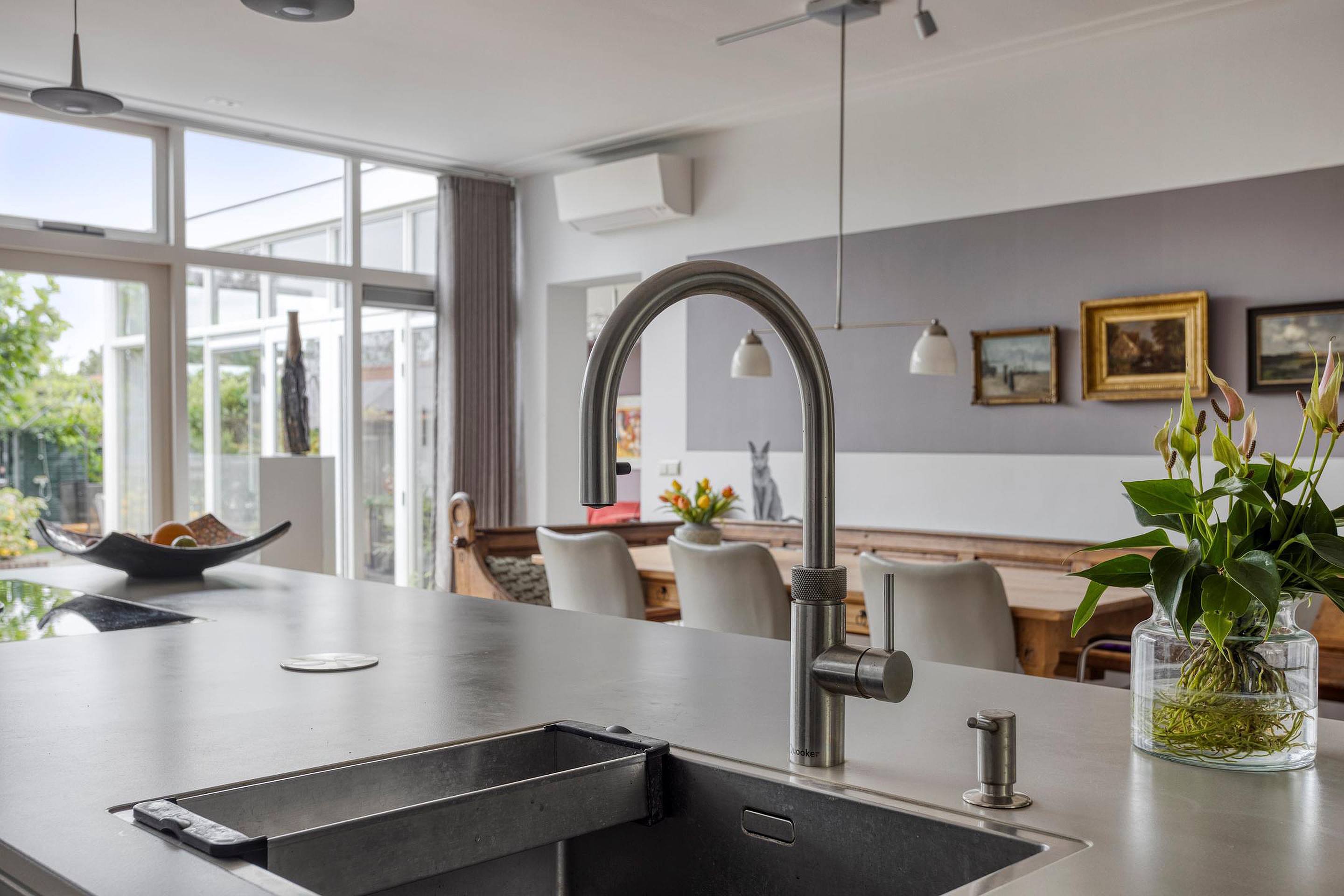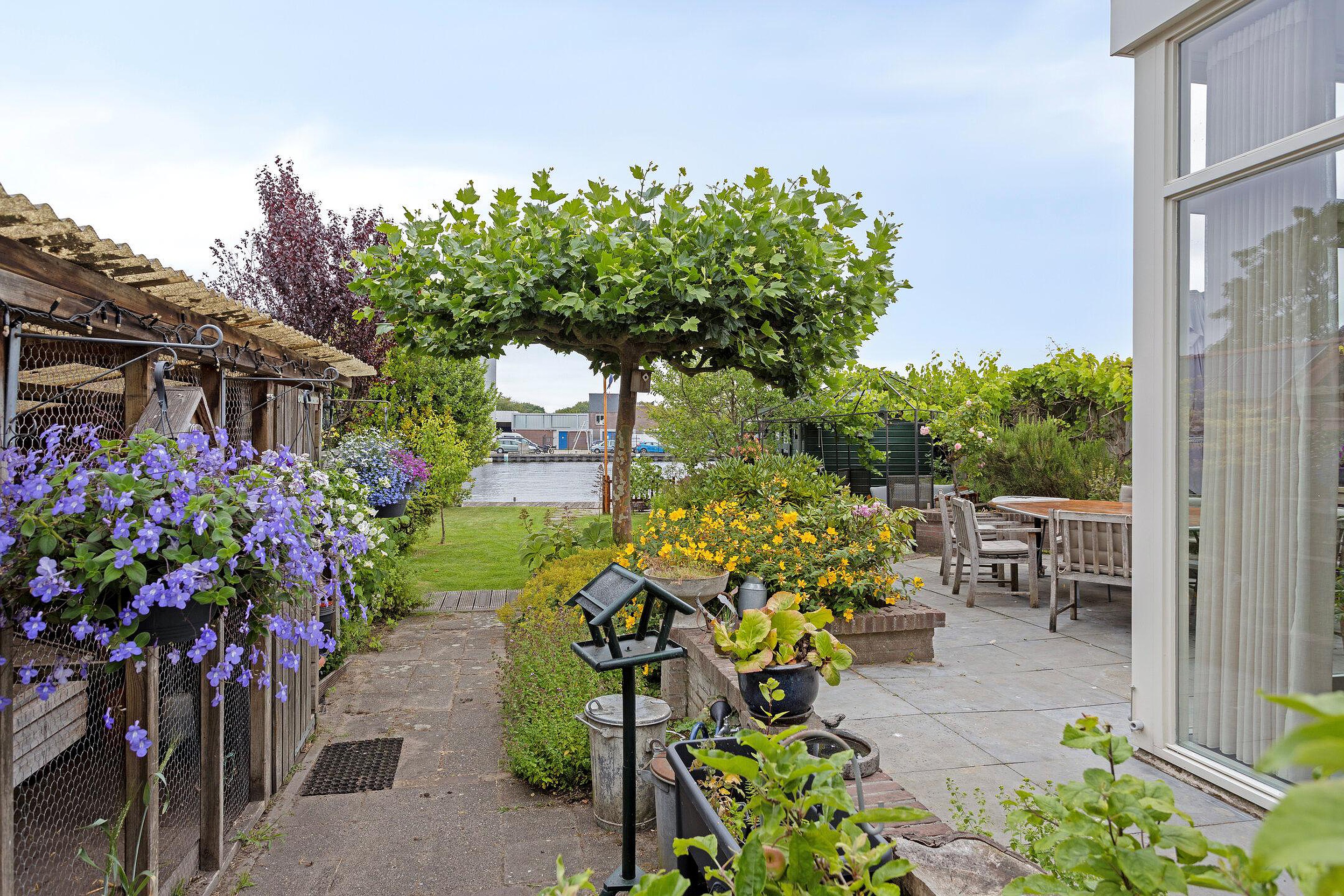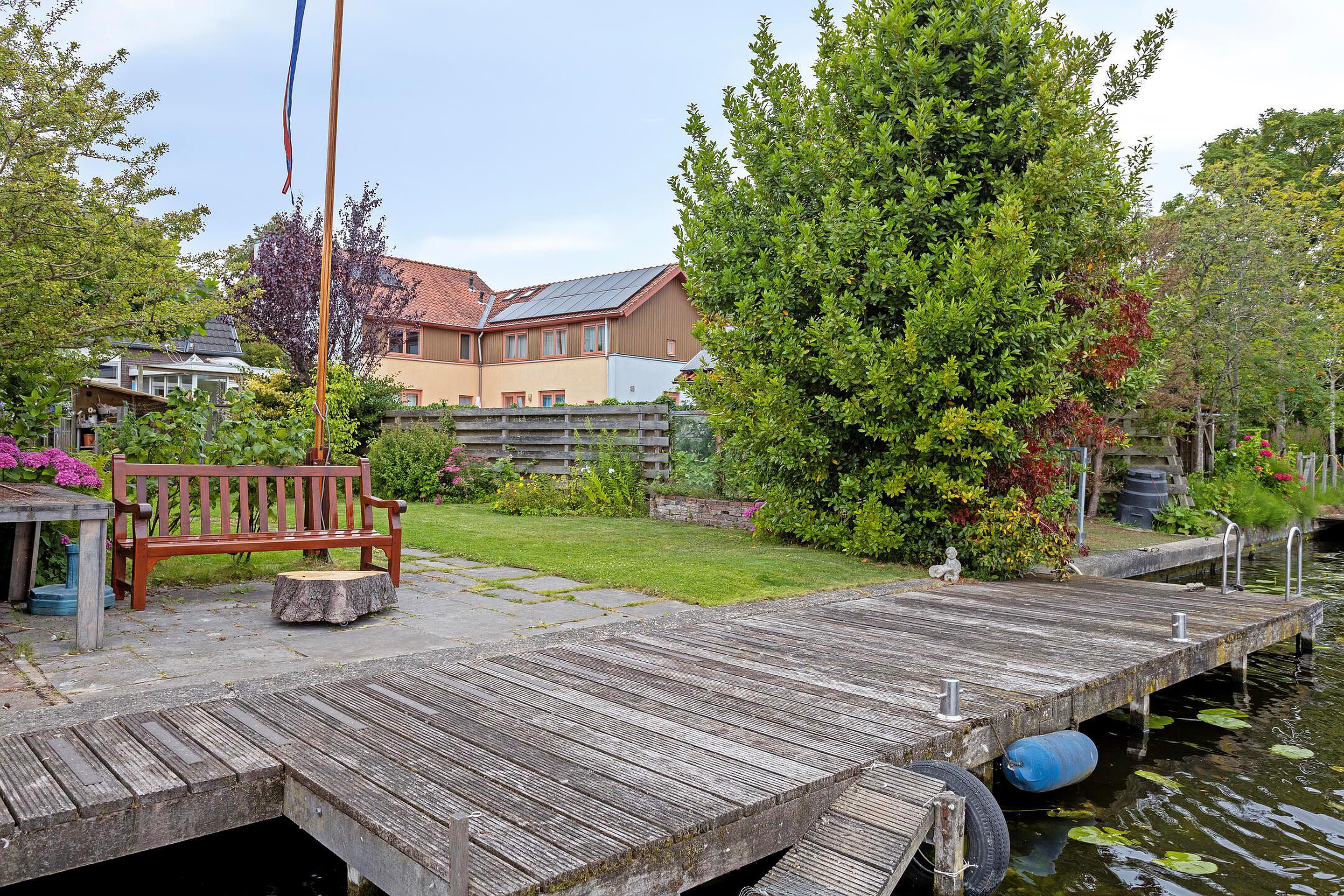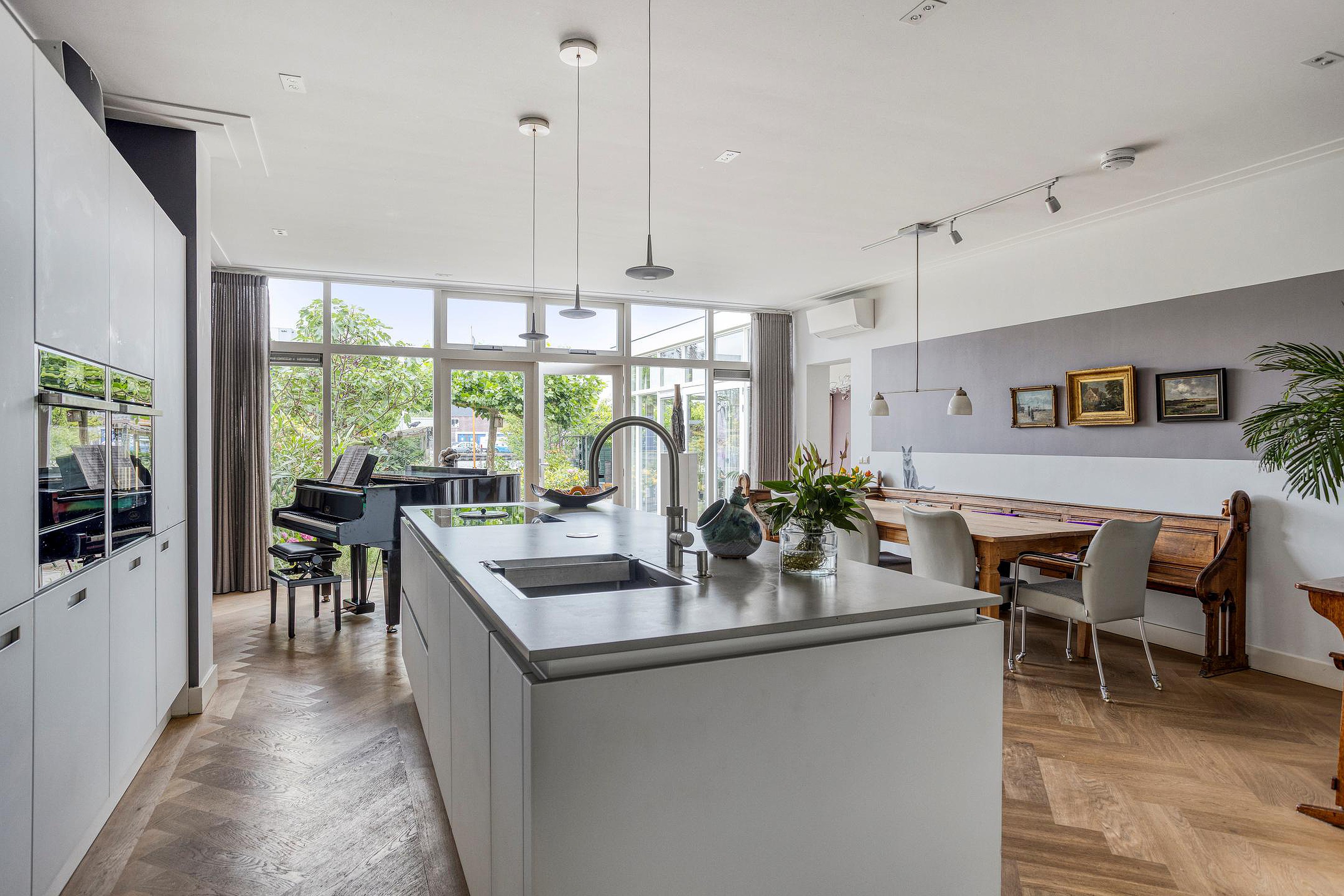 Begane grond Ruime voortuin. Parkeren op eigen terrein inclusief oplaadpunt voor elektrische auto's (ter overname). Aangebouwde stenen garage met dubbele openslaande deuren. Aan de zijkant van de woning bevindt zich de entree. Entree woning, hal, meterkast, toiletruimte, separate wasruimte en de trapopgang naar de eerste verdieping. Leuke (originele) details zoals de granito vloer in de entreehal, paneeldeuren en glas-in-loodramen. Woonkamer ensuite met erker, vaste kasten en voorzien van airconditioning. Vanuit de woonkamer heeft u uitzicht op groen. Door de open haard geniet u het gehele jaar door van een sfeervol vuurtje. De woonkamer en de royale uitgebouwde leefkeuken worden gescheiden door middel van schuifdeuren (schuifseparatie). Er is genoeg ruimte voor een grote eettafel in deze fijne ruimte. De grote raampartij zorgt voor veel daglicht en aantrekkelijk uitzicht. Fijne plek in huis wanneer u vrienden of familie hebt uitgenodigd voor een diner. De luxe keuken (2017) zal het hart van de echte keukenprins(es) zeker sneller doen kloppen! Kookeiland met inductiekookplaat inclusief geïntegreerde afzuiging (Bora) en Quooker. De apparatenkast met koel/vriescombinatie, combi stoomoven (Neff), combi oven inclusief warmtelade en vaatwasser maakt het geheel compleet. De woonkamer en leefkeuken zijn afgewerkt met een in visgraat patroon gelegde eikenhouten vloer. De in 2011 aangebouwde tuinkamer is afgewerkt met een tegelvloer en uitermate geschikt is als thuiswerkplek/kantoor en/of hobbyruimte. Door grote raampartij is deze ruimte opvallend licht en geniet u van optimaal zicht op de achtertuin. Ook vanuit de tuinkamer is de garage bereikbaar. De woonkamer, leefkeuken en tuinkamer zijn voorzien van vloerverwarming. Tuin en water(sport)liefhebbers opgelet! De opvallend diepe en zonnige achtertuin met buitendouche (warm water d.m.v. een boiler), houten berging en volière (kippenhok) is gelegen aan het water (Oude Rijn) en biedt u de mogelijkheid om met uw boot aan te meren (ligplaatsvergunning vereist). Door z'n ruime afmeting en ligging van de tuin kunt u de hele dag van de zon genieten. Beeld u eens in… Het is zomer. U komt thuis. Even bijkomen, genieten van de zon en de dag doorspreken onder het genot van een gekoeld drankje met uitzicht op o.a. voorbijkomende (plezier)vaart. Vanuit uw tuin stapt u in uw boot en vaart u bijvoorbeeld naar het bruisende centrum van Leiden, recreatiegebied Vlietland of de Kagerplassen. Onwerkelijk?