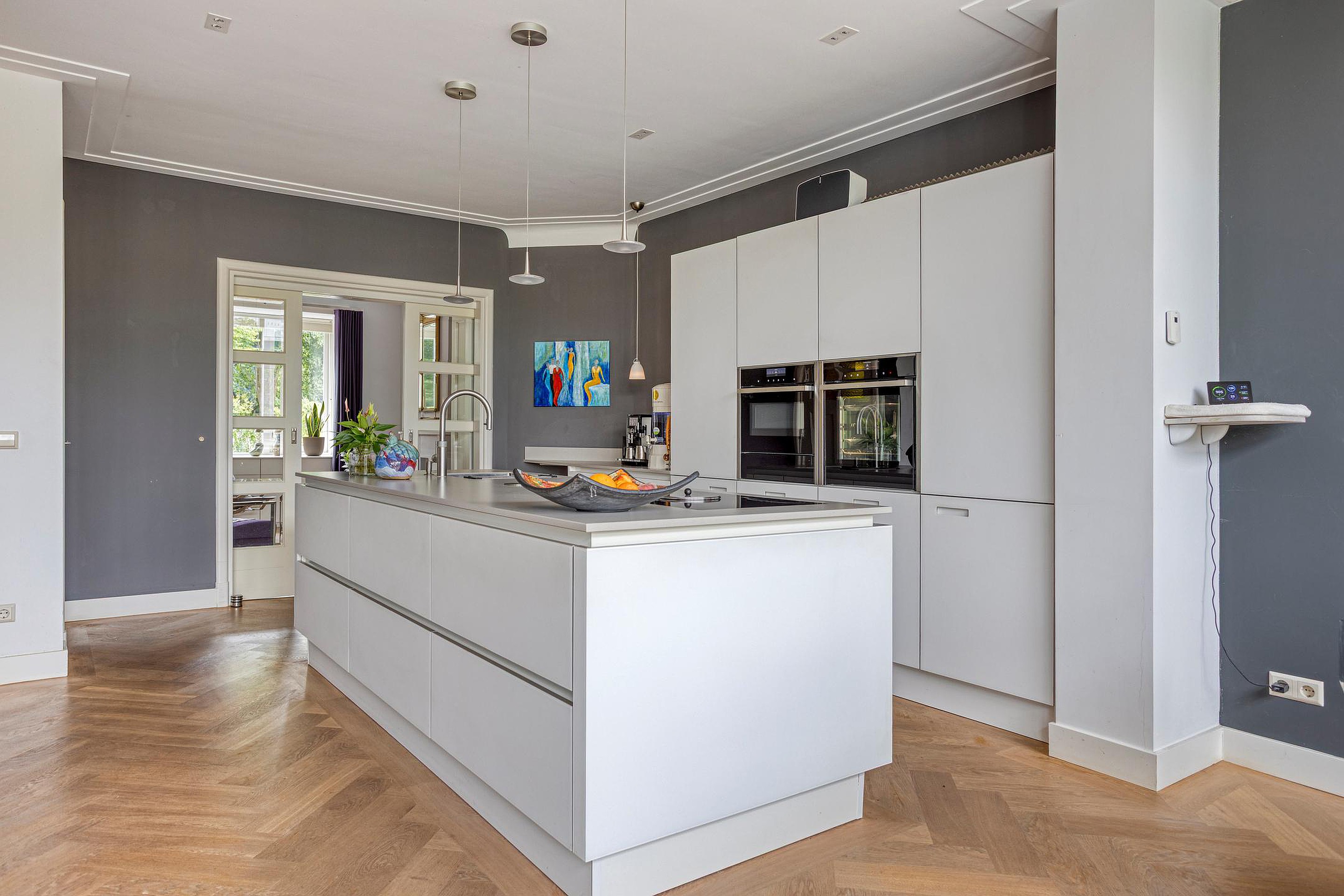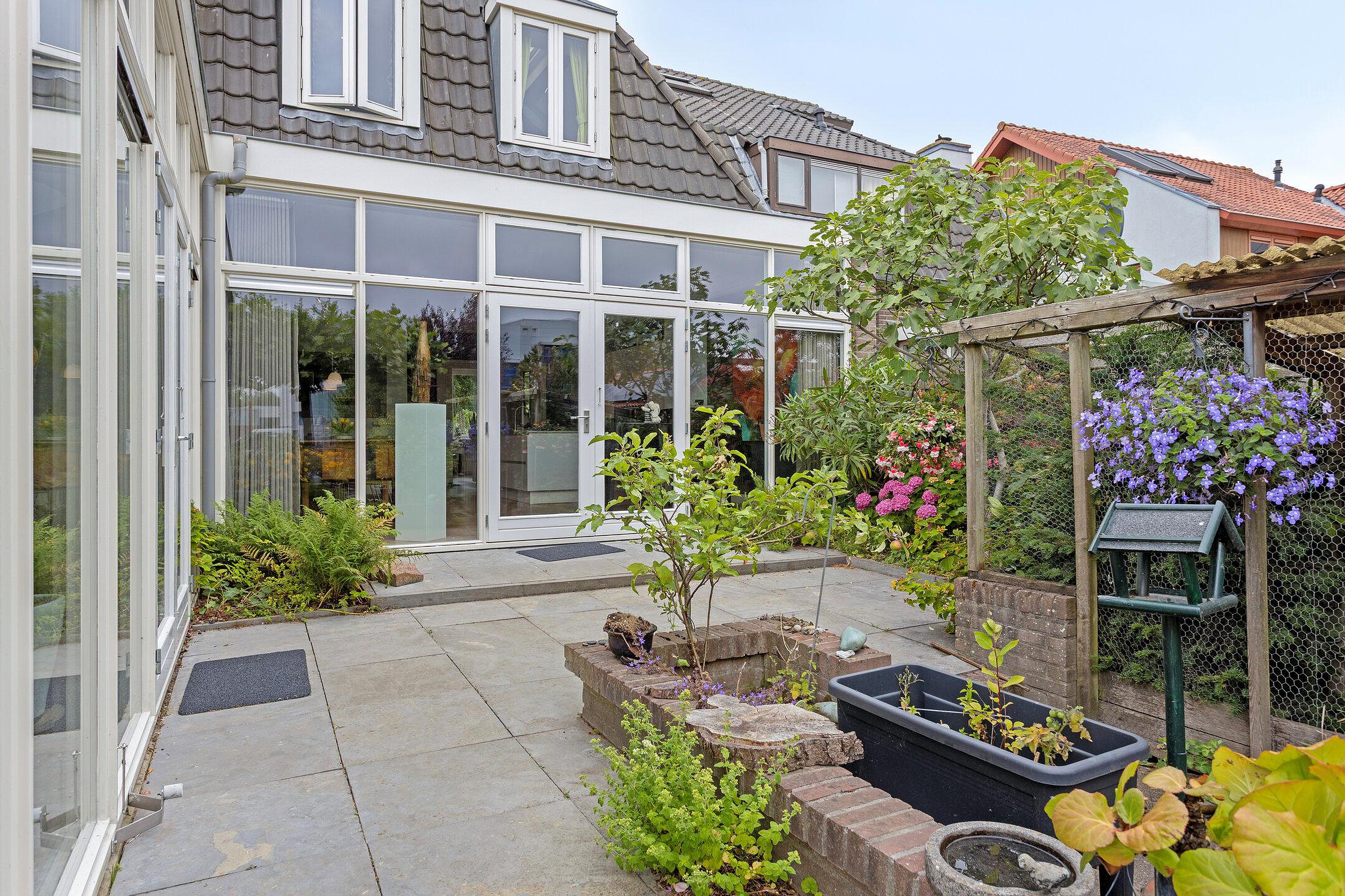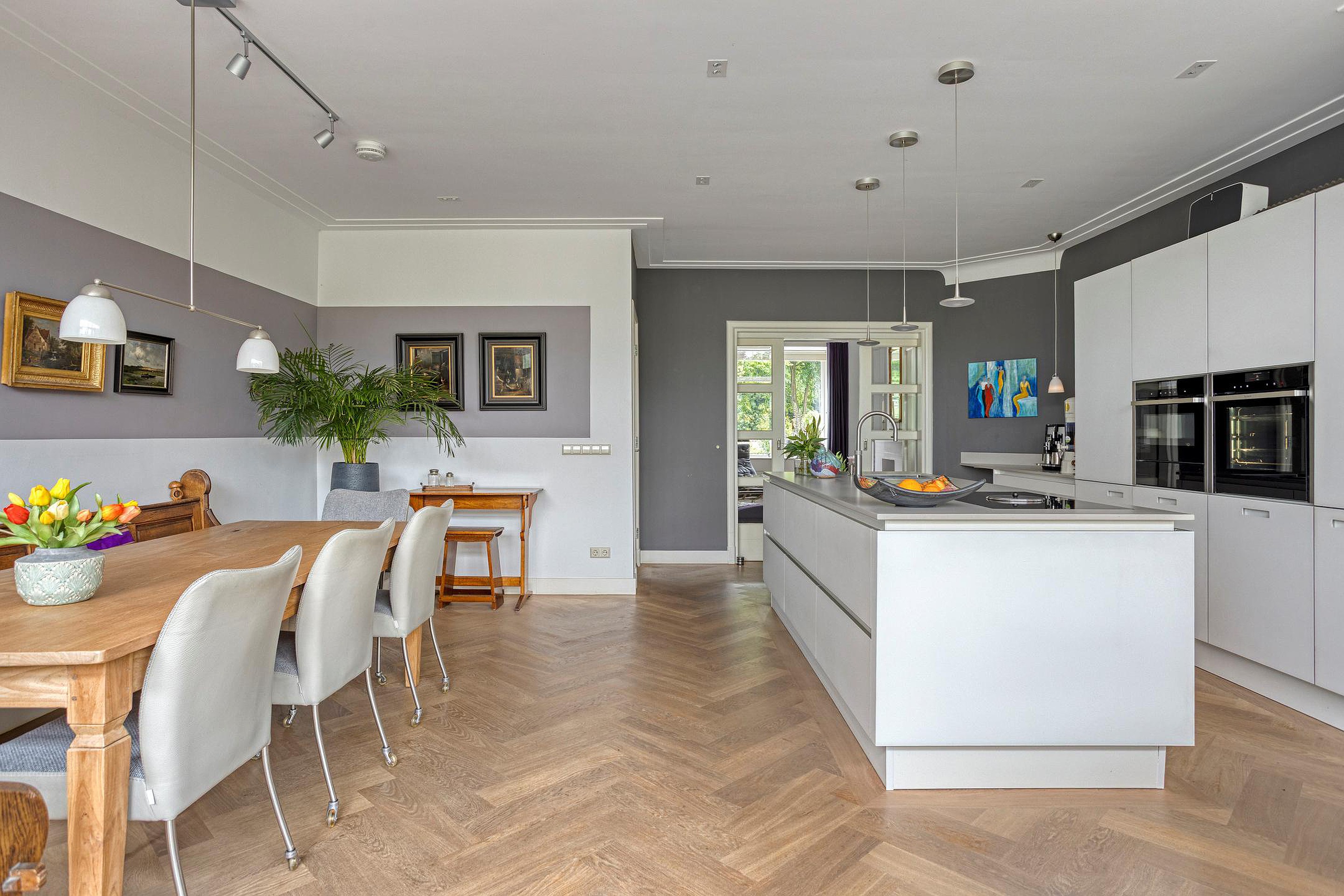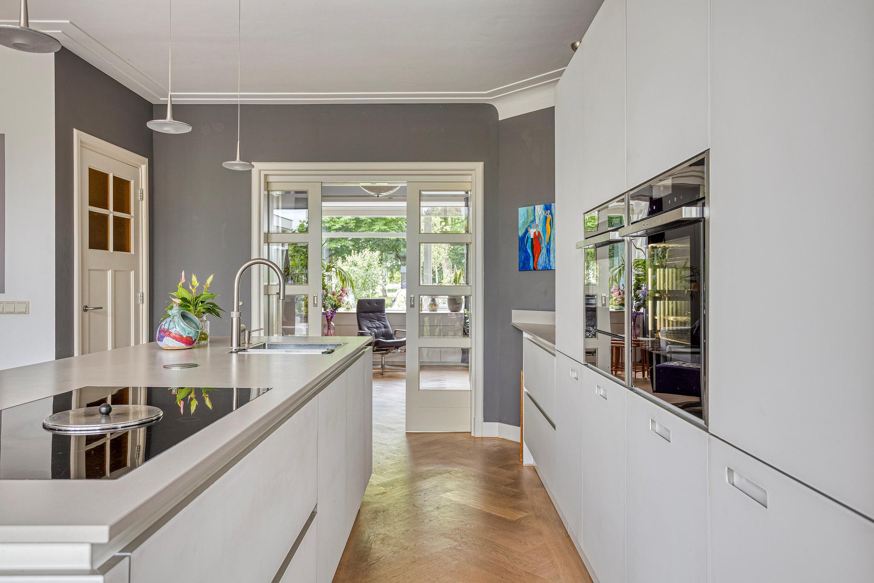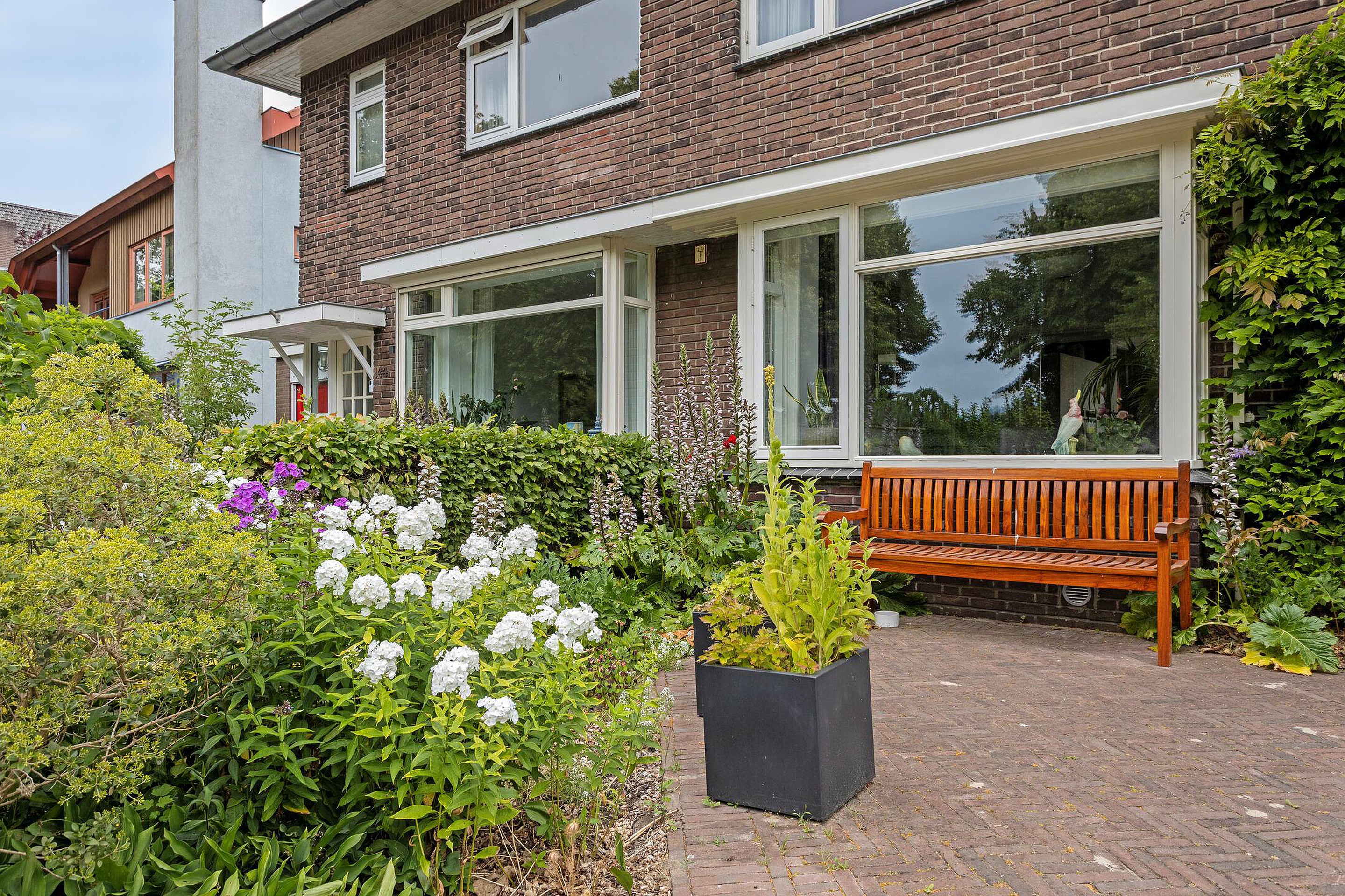 Begane grond Ruime voortuin. Parkeren op eigen terrein inclusief oplaadpunt voor elektrische auto's (ter overname). Aangebouwde stenen garage met dubbele openslaande deuren. Aan de zijkant van de woning bevindt zich de entree. Entree woning, hal, meterkast, toiletruimte, separate wasruimte en de trapopgang naar de eerste verdieping. Leuke (originele) details zoals de granito vloer in de entreehal, paneeldeuren en glas-in-loodramen. Woonkamer ensuite met erker, vaste kasten en voorzien van airconditioning. Vanuit de woonkamer heeft u uitzicht op groen. Door de open haard geniet u het gehele jaar door van een sfeervol vuurtje. De woonkamer en de royale uitgebouwde leefkeuken worden gescheiden door middel van schuifdeuren (schuifseparatie). Er is genoeg ruimte voor een grote eettafel in deze fijne ruimte. De grote raampartij zorgt voor veel daglicht en aantrekkelijk uitzicht. Fijne plek in huis wanneer u vrienden of familie hebt uitgenodigd voor een diner. De luxe keuken (2017) zal het hart van de echte keukenprins(es) zeker sneller doen kloppen! Kookeiland met inductiekookplaat inclusief geïntegreerde afzuiging (Bora) en Quooker. De apparatenkast met koel/vriescombinatie, combi stoomoven (Neff), combi oven inclusief warmtelade en vaatwasser maakt het geheel compleet. De woonkamer en leefkeuken zijn afgewerkt met een in visgraat patroon gelegde eikenhouten vloer. De in 2011 aangebouwde tuinkamer is afgewerkt met een tegelvloer en uitermate geschikt is als thuiswerkplek/kantoor en/of hobbyruimte. Door grote raampartij is deze ruimte opvallend licht en geniet u van optimaal zicht op de achtertuin. Ook vanuit de tuinkamer is de garage bereikbaar. De woonkamer, leefkeuken en tuinkamer zijn voorzien van vloerverwarming. Tuin en water(sport)liefhebbers opgelet! De opvallend diepe en zonnige achtertuin met buitendouche (warm water d.m.v. een boiler), houten berging en volière (kippenhok) is gelegen aan het water (Oude Rijn) en biedt u de mogelijkheid om met uw boot aan te meren (ligplaatsvergunning vereist). Door z'n ruime afmeting en ligging van de tuin kunt u de hele dag van de zon genieten. Beeld u eens in… Het is zomer. U komt thuis. Even bijkomen, genieten van de zon en de dag doorspreken onder het genot van een gekoeld drankje met uitzicht op o.a. voorbijkomende (plezier)vaart. Vanuit uw tuin stapt u in uw boot en vaart u bijvoorbeeld naar het bruisende centrum van Leiden, recreatiegebied Vlietland of de Kagerplassen. Onwerkelijk?