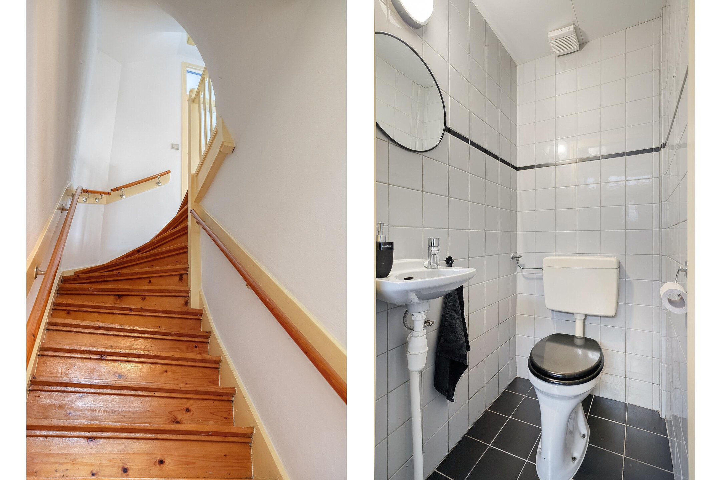 Begane grond Zodra je de voordeur opent, word je meegenomen door sfeer. In de ruime hal vallen direct de originele paneeldeuren, het glas-in-lood en de royale maatvoering op. Hier bevindt zich de meterkast, een ruime garderobe en het eerste toilet met een fontein.