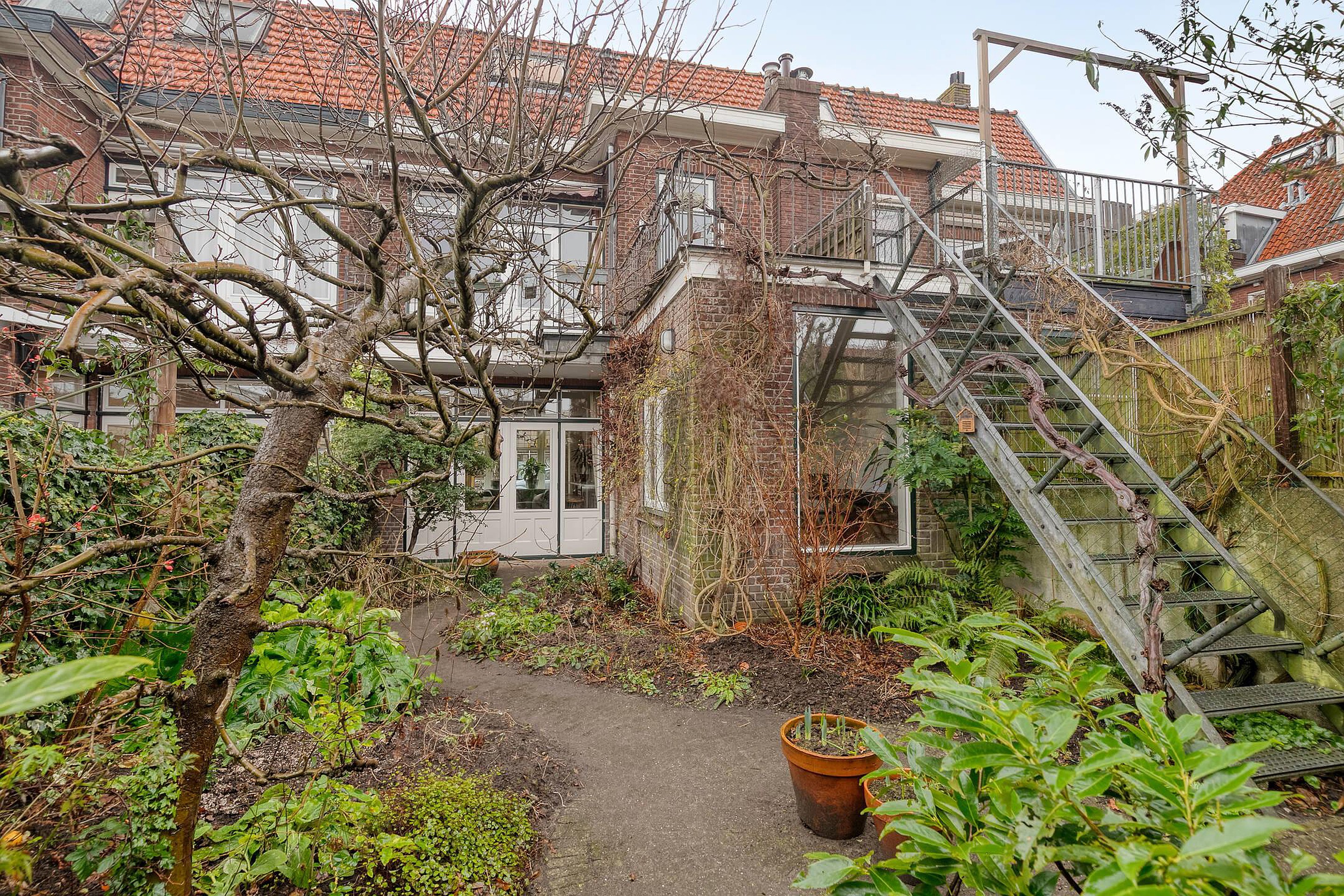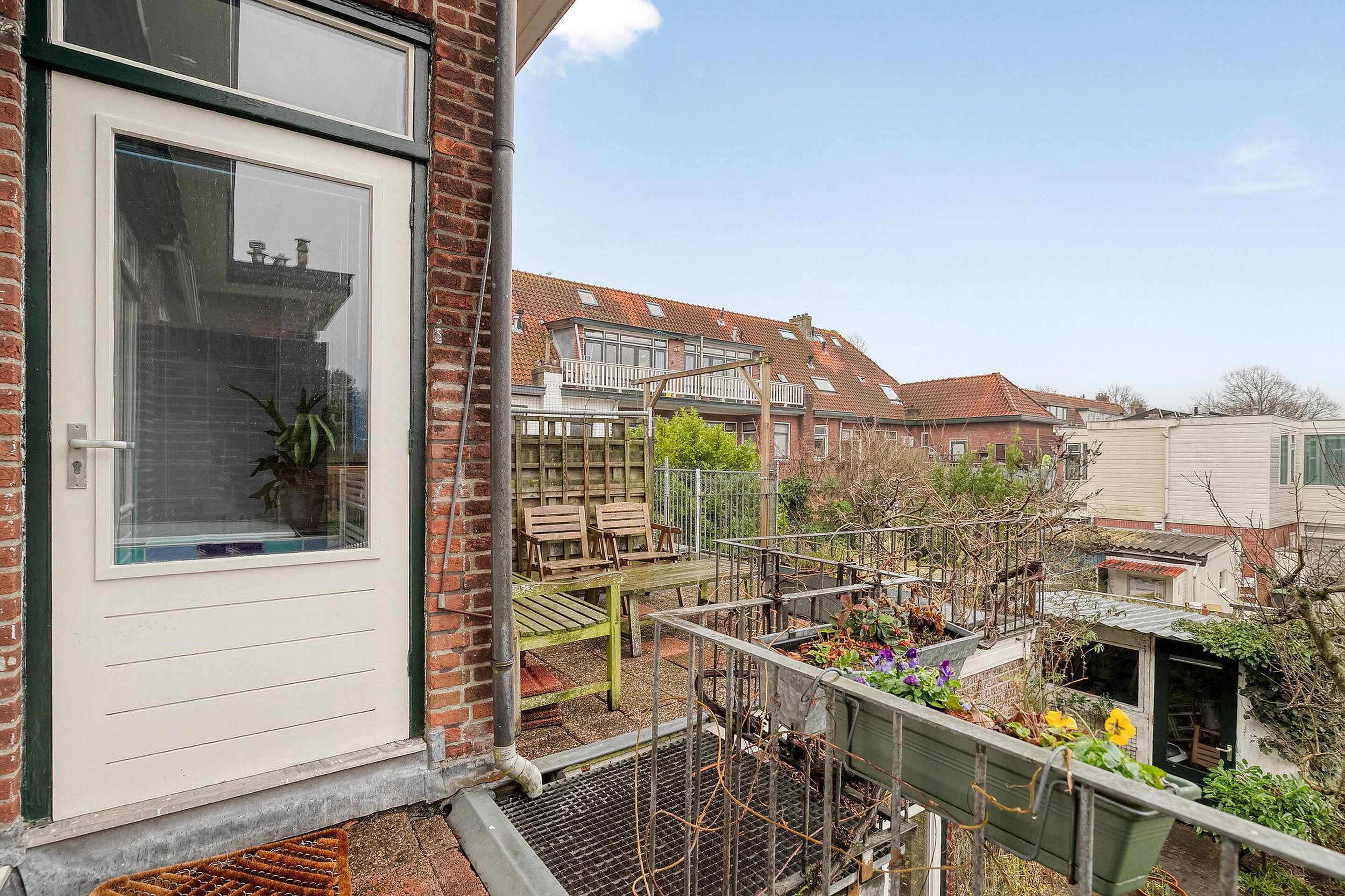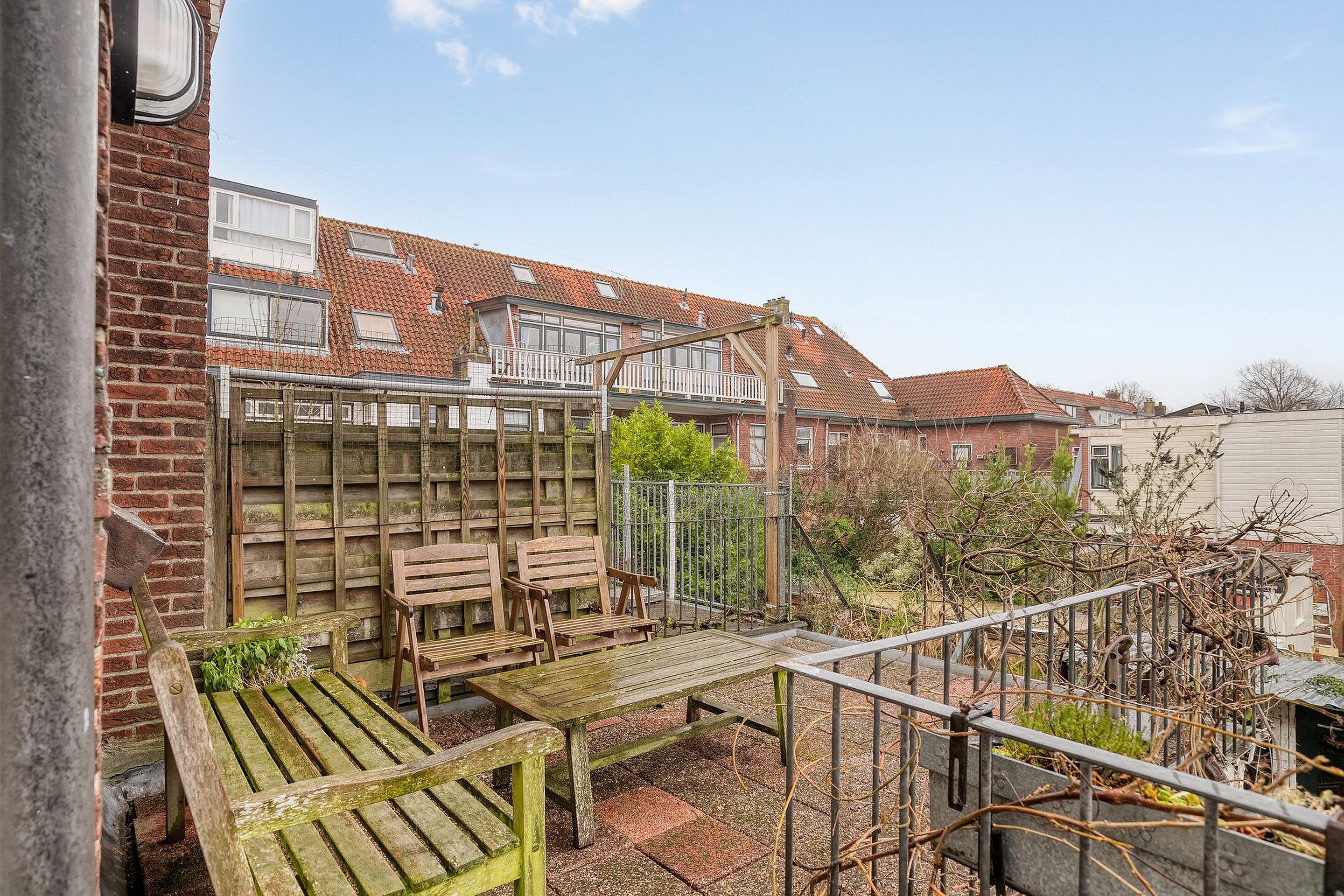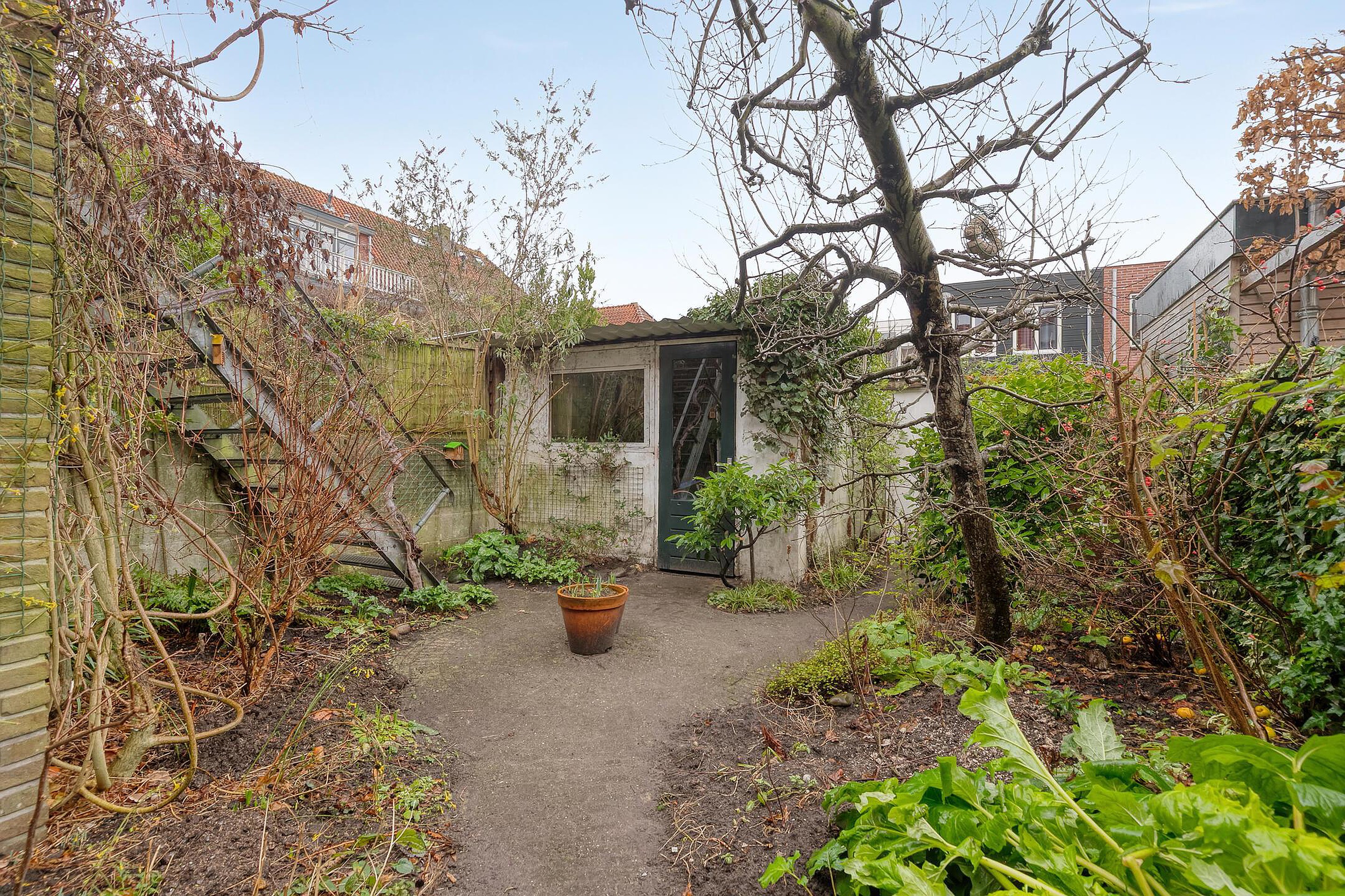 De achtertuin is een groot pluspunt: zonnig gelegen op het zuidwesten, circa 12 x 6 / 3,40 meter, met een schuur van 2,15 x 3,10 meter (voorzien van elektra) én dus de extra werkkamer. Via de achterom is de tuin bereikbaar en via een trap is er toegang tot het dakterras op de eerste verdieping. Maar die straks.