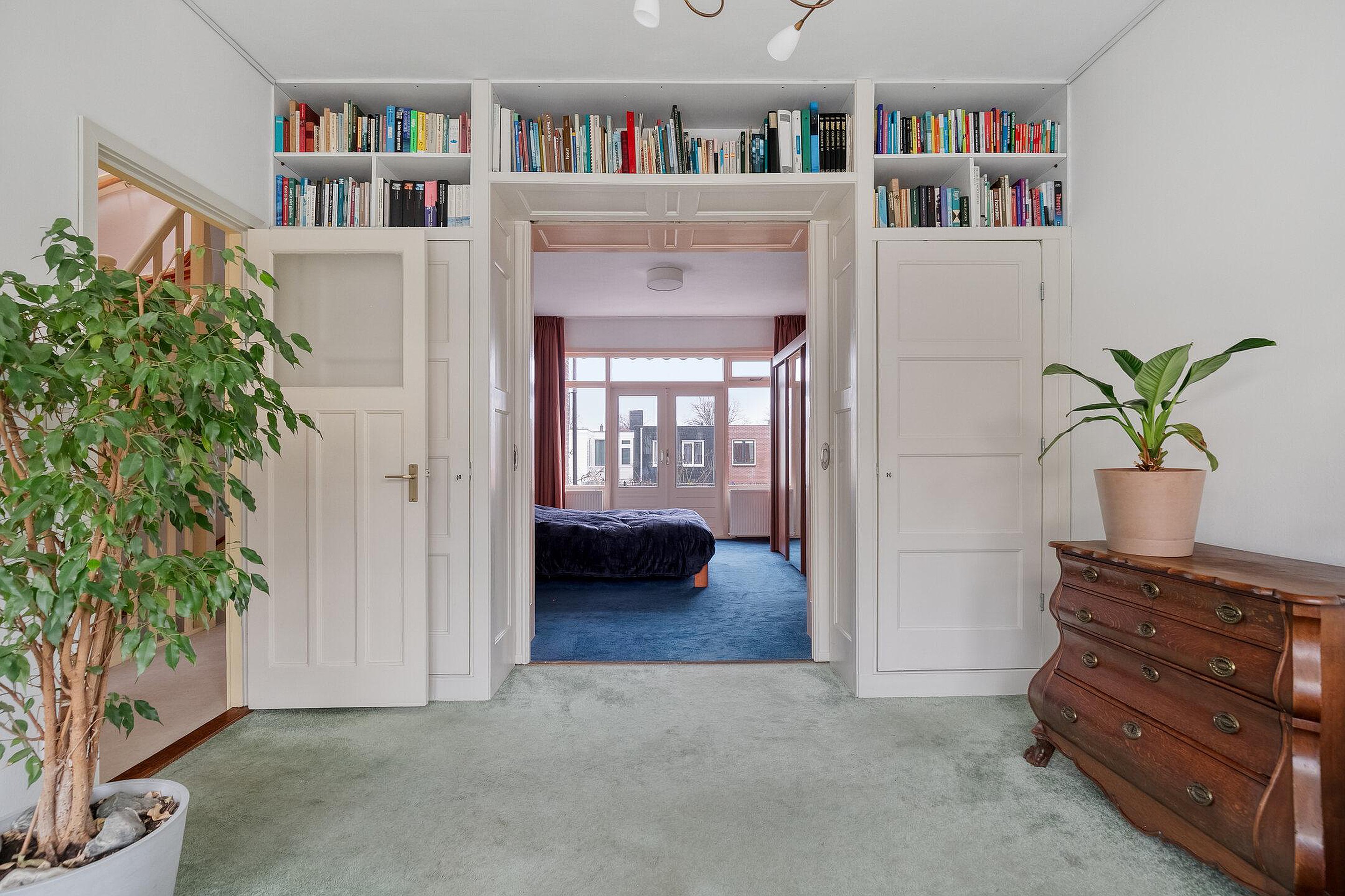 Op de eerste etage verraadt de overloop al dat dit niveau net zo bijzonder is. Het trappenhuis is op zichzelf al bijzonder: hoge wanden, mooie lijnen en originele elementen die je blik vanzelf omhoog trekken. Aan de voorzijde ligt een extra (slaap)kamer en daarnaast een fantastische voor- en achterkamer en suite, gescheiden door originele glas-in-lood schuifdeuren – iets wat je zelden nog ziet op deze verdieping. Beide kamers zijn ruim, hoog en voorzien van vaste kasten.