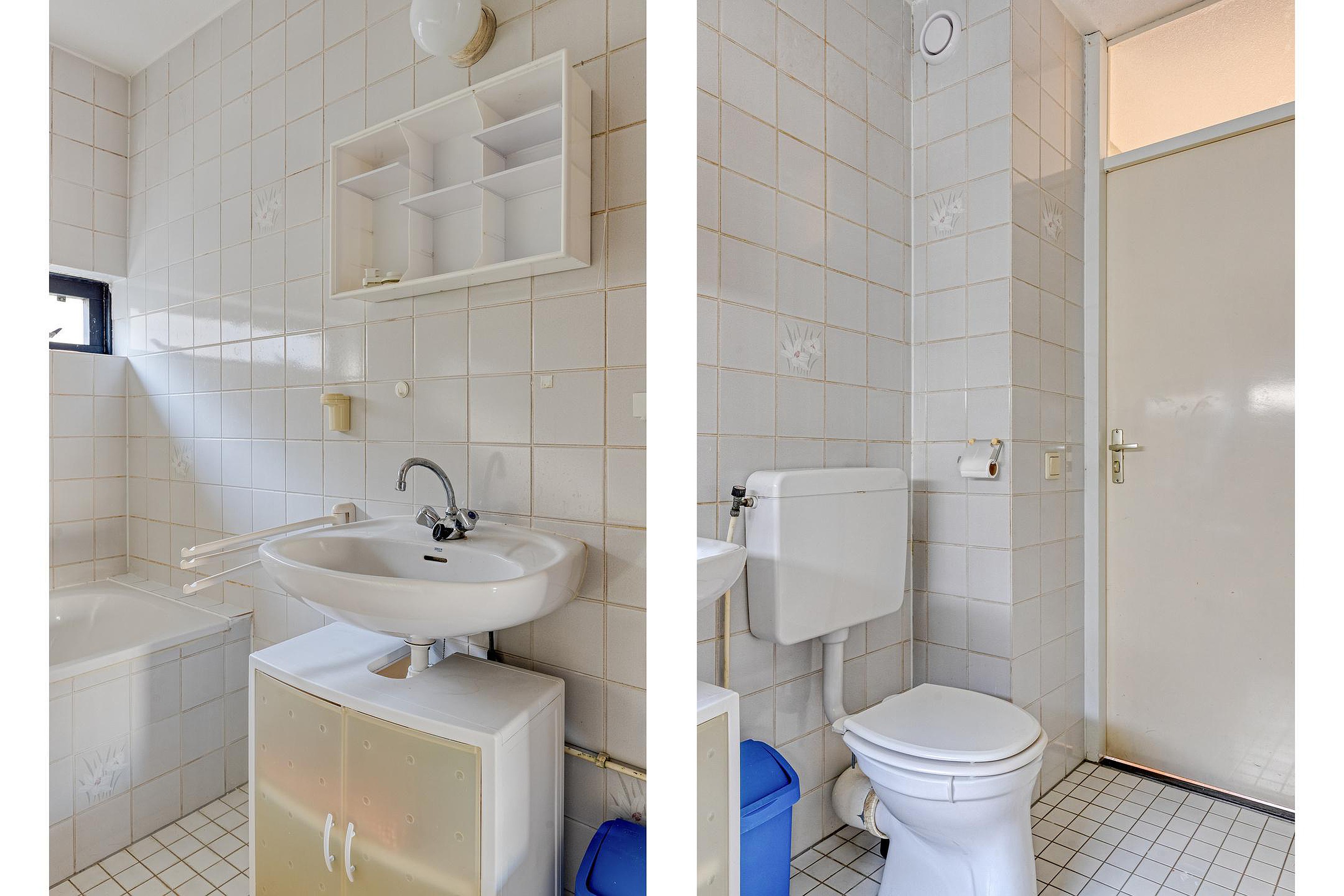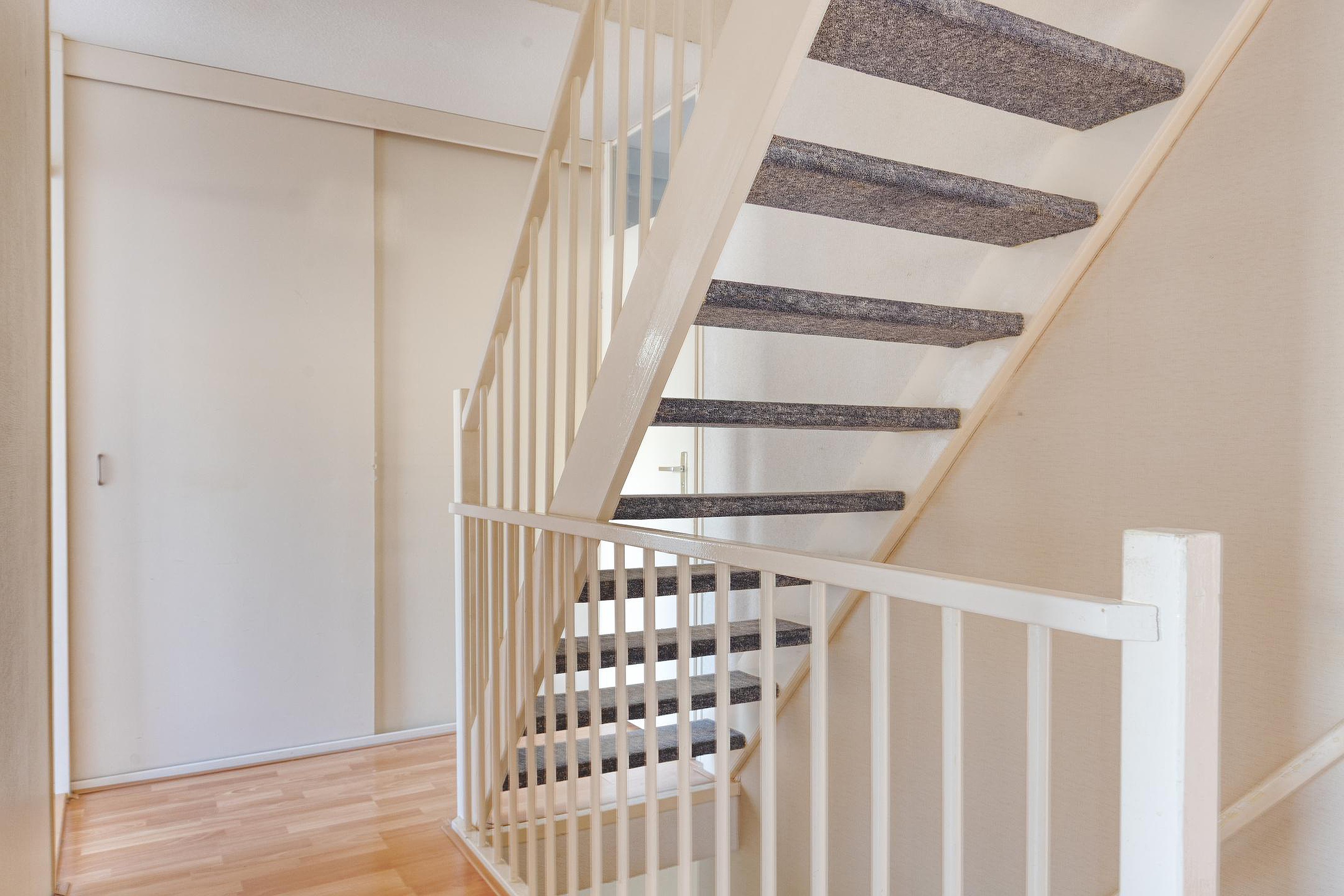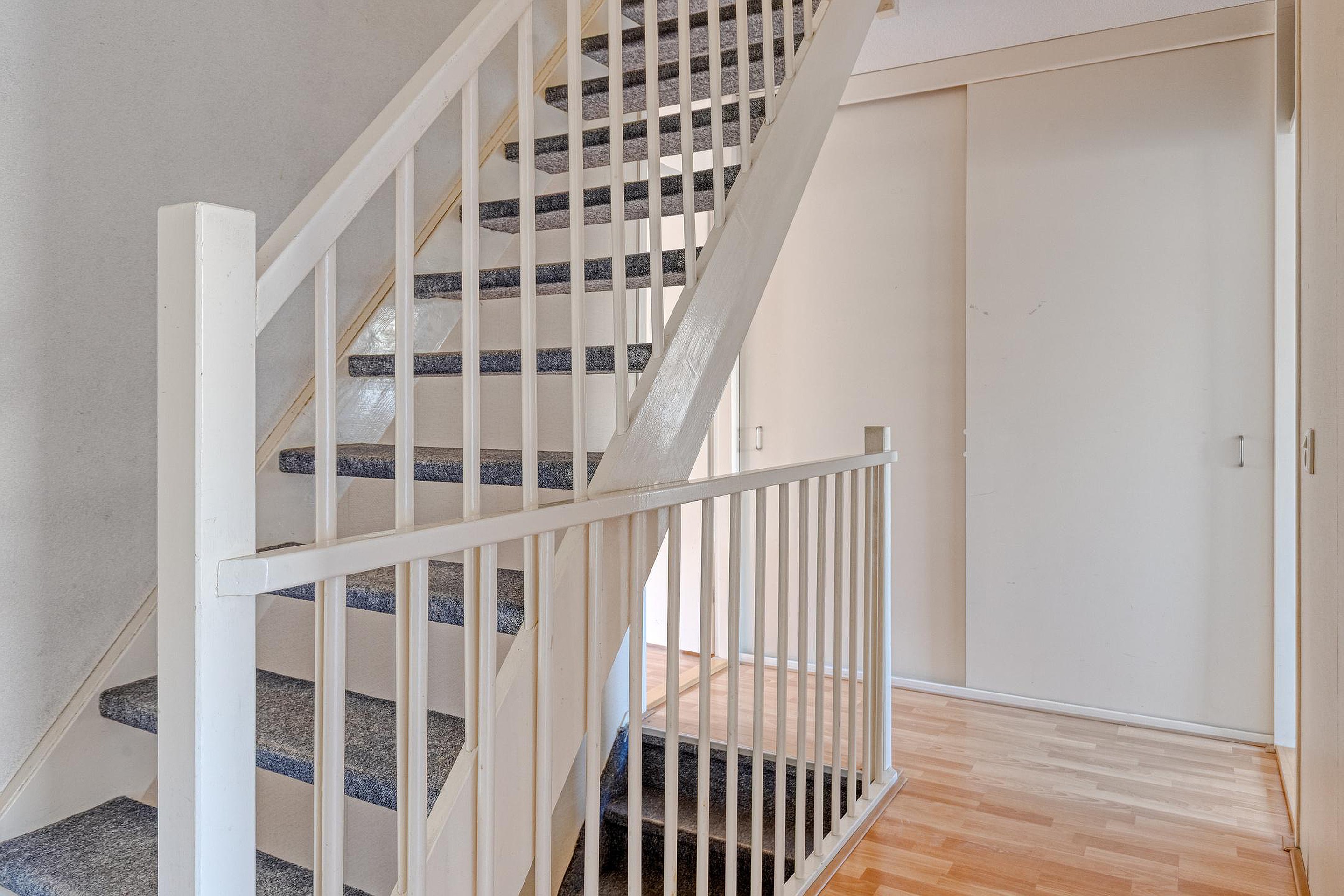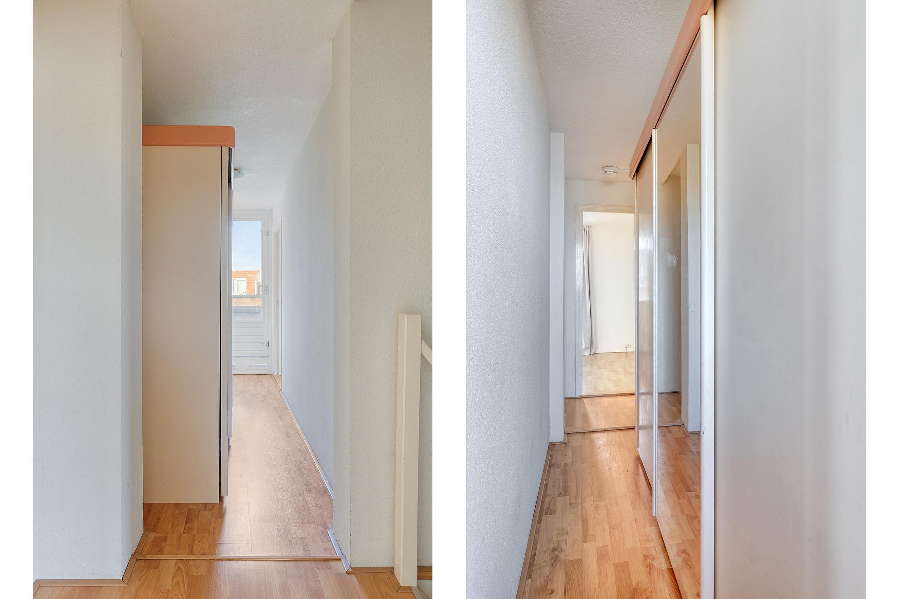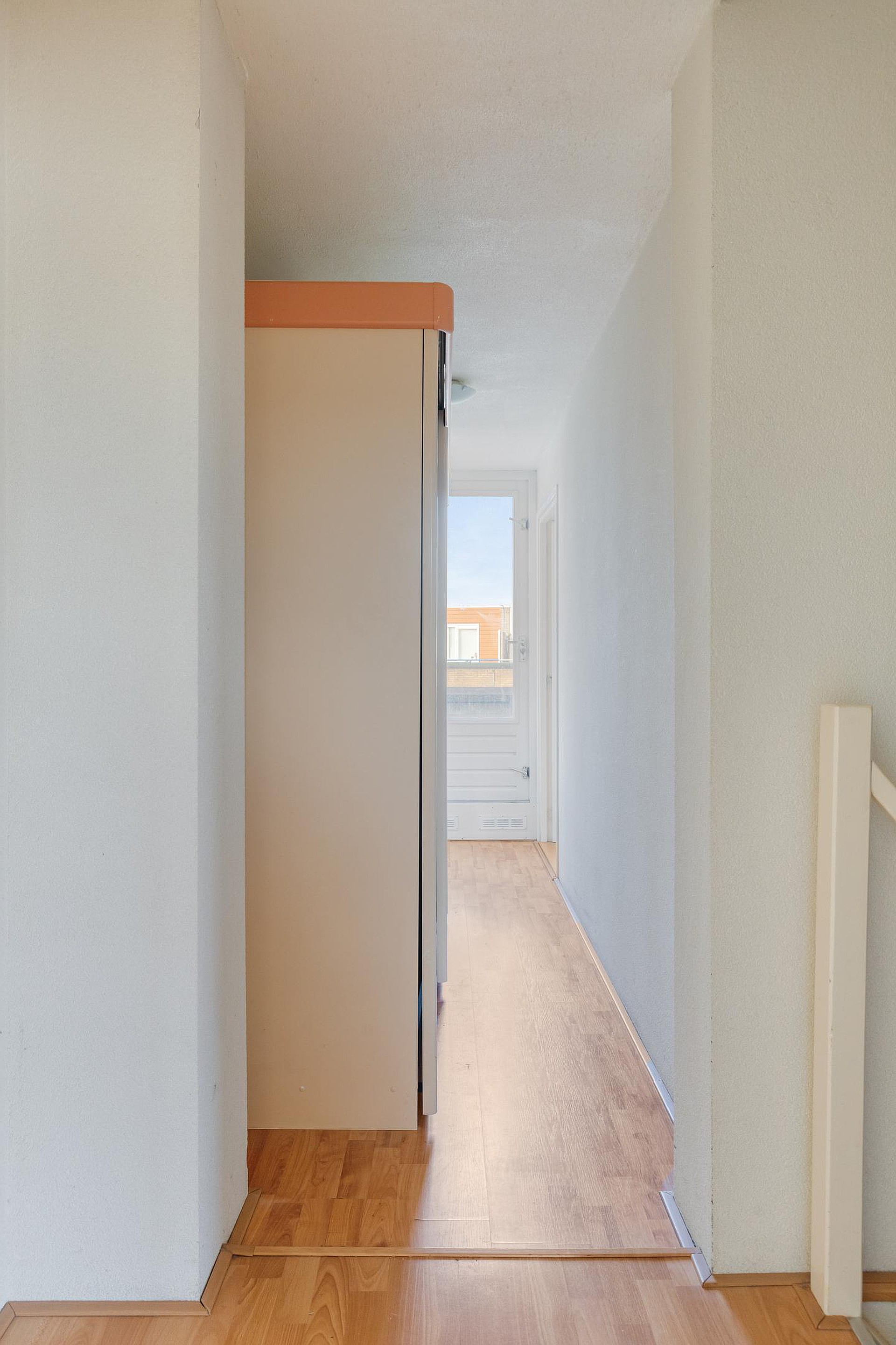 Overloop met twee vaste kasten en de trap naar de 2e verdieping. Aan de voorzijde van de woning vindt u een slaapkamer. Aan de achterzijde van de woning bevinden zich nog twee slaapkamers. De badkamer beschikt over een wastafel, ligbad/douchecombinatie en een 2e toilet.