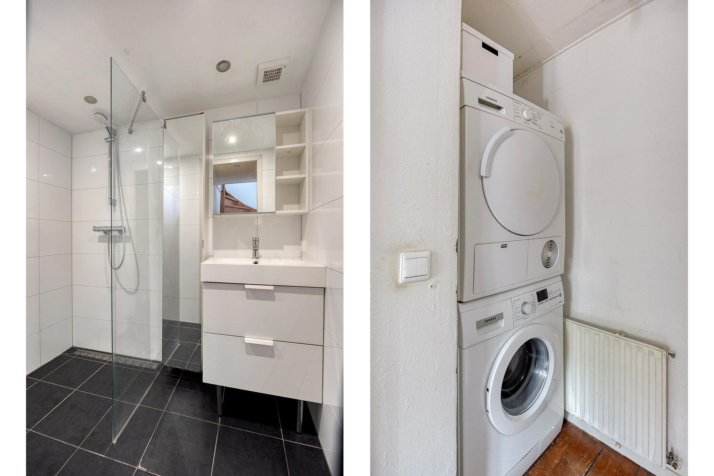We gaan naar boven. Een overloop met de aansluiting voor de wasmachine en de CV ketel en toegang tot de nette, moderne badkamer met inloopdouche en wastafelmeubel.