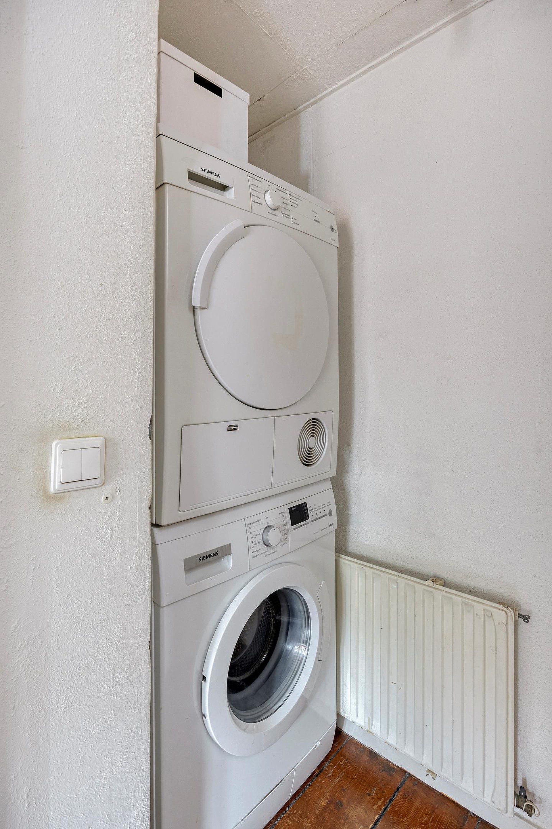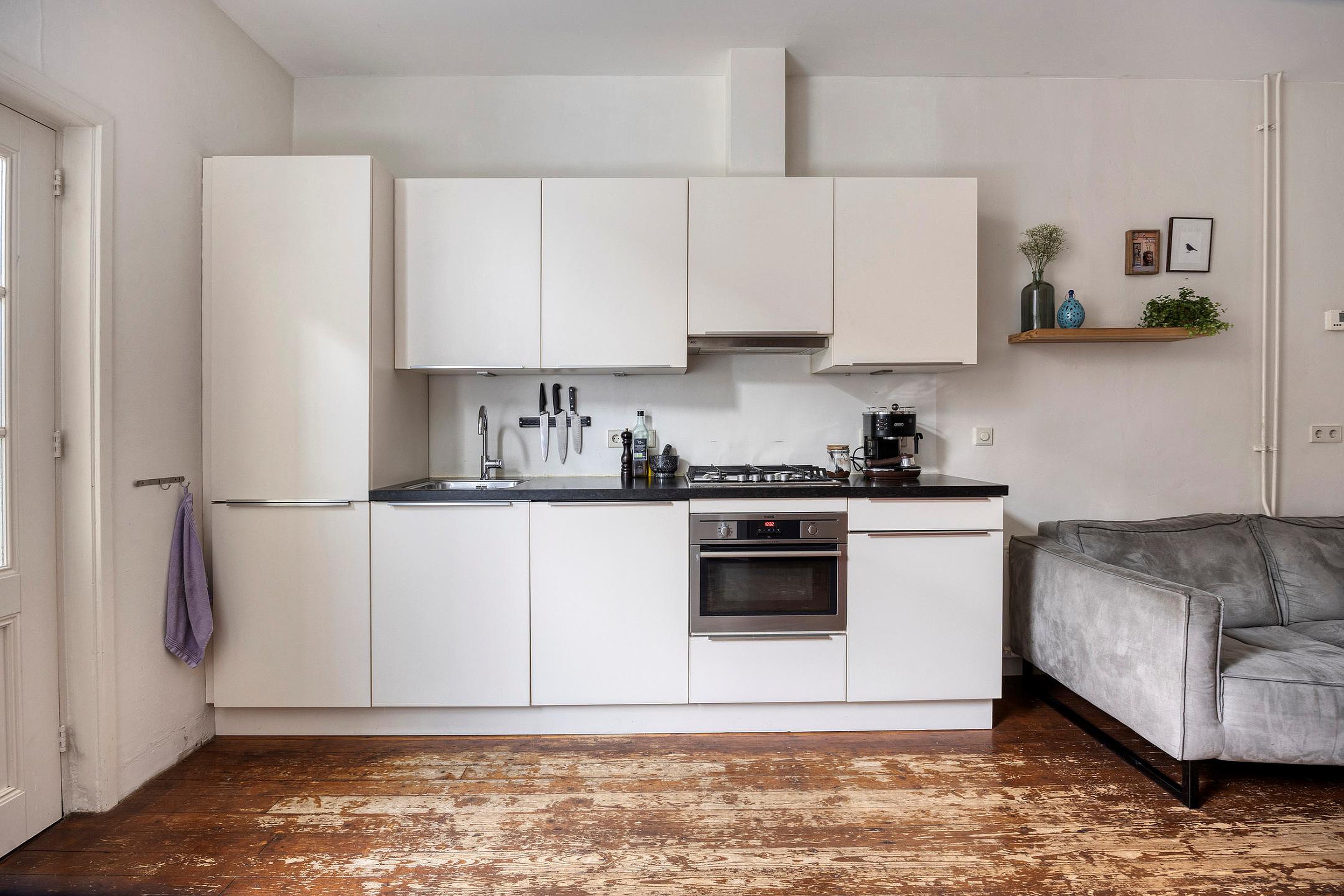 De nette open keuken is compleet uitgevoerd met vaatwasser, oven, 4-pits gaskookplaat, koelkast, vriezer en een afzuigkap. Ga eens zitten op de bank en ervaar het centrumleven van Leiden.