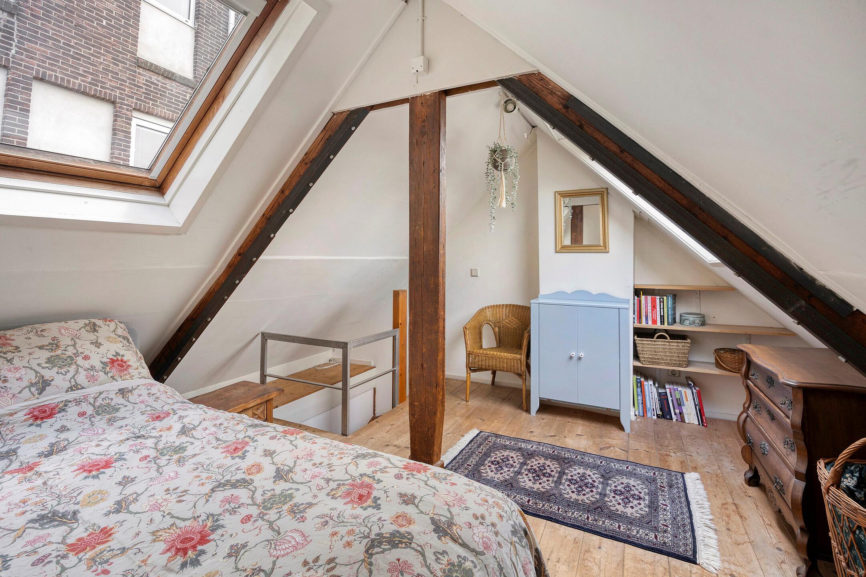Een heerlijke tweede slaapkamer met dakramen en een fijne, open sfeer. Vanuit deze kamer kijk je uit over de karakteristieke bebouwing van de stad, met zicht op onder andere het voormalige Elisabeth ziekenhuis.