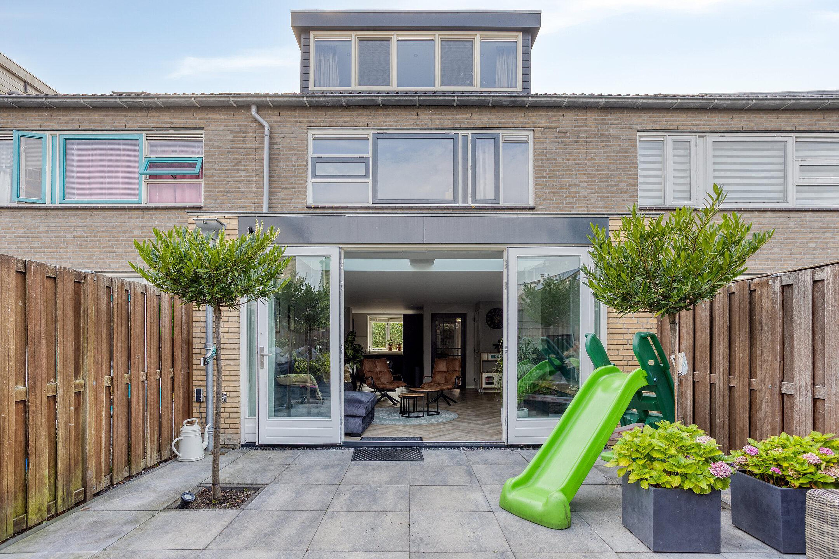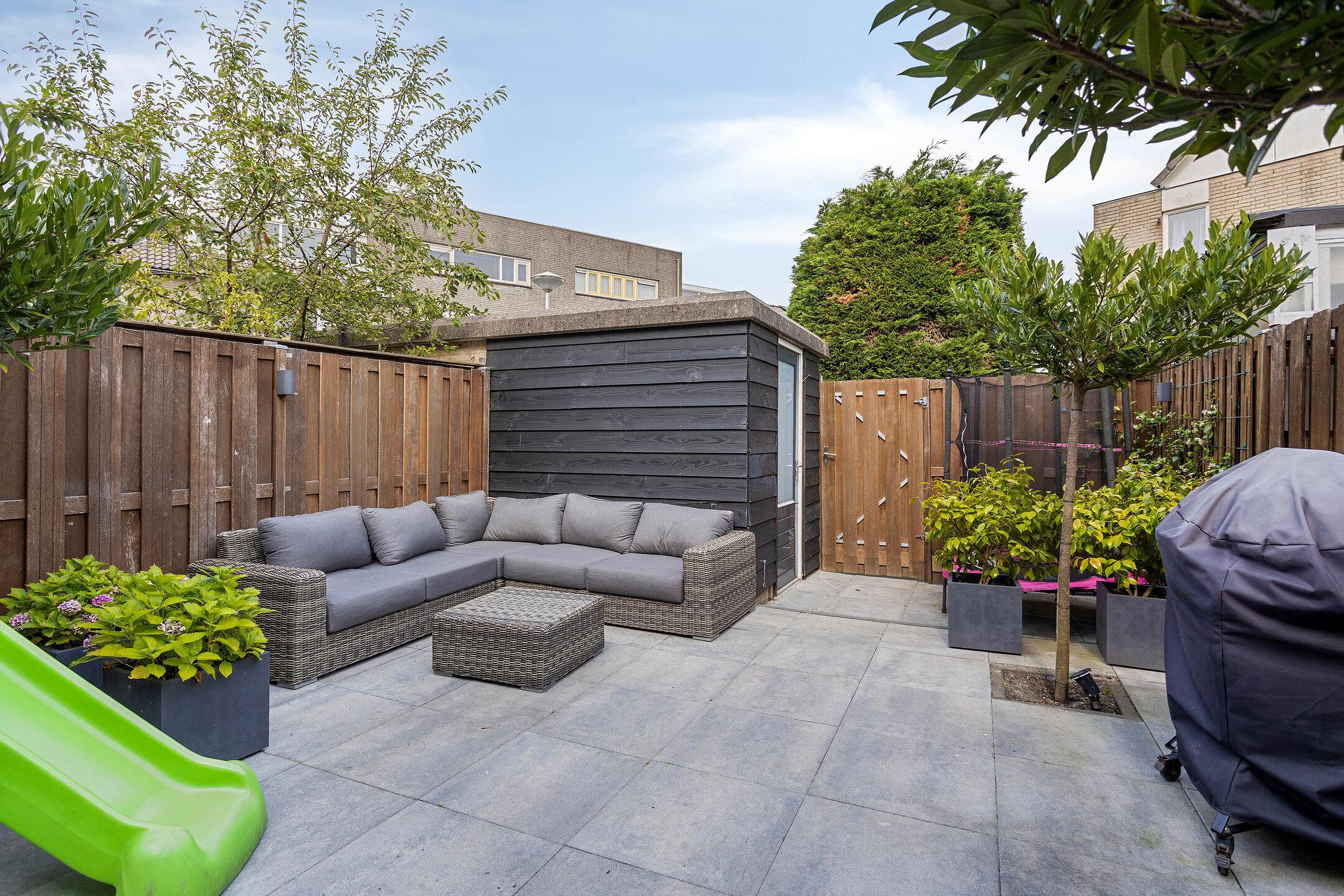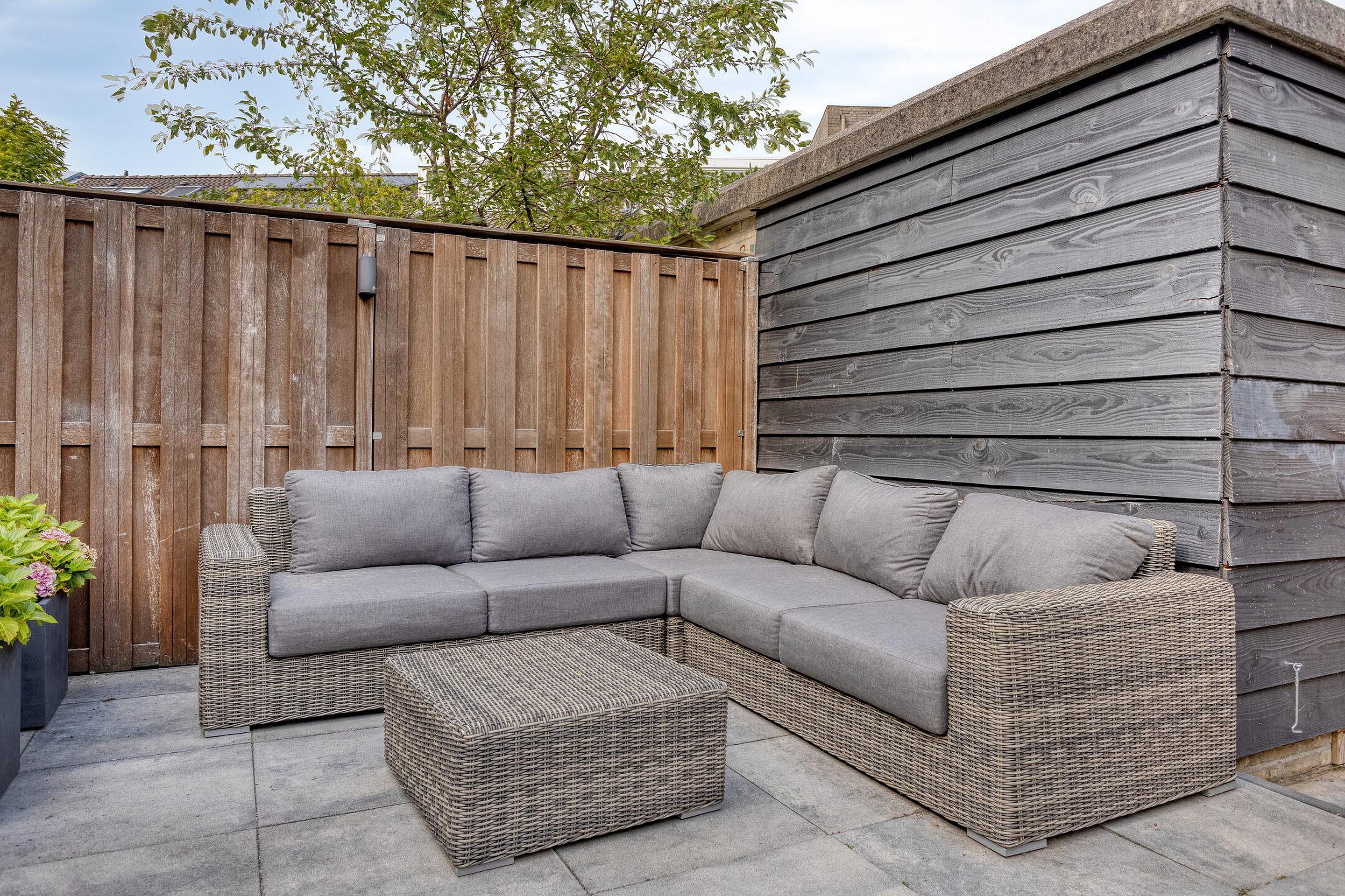 Terug naar de woonkamer door naar de tuin. Gelegen op het noordwesten, dik 40m2 en veel zon en heerlijk rustig. Er is een achterom en een schuur en alles is mooi betegeld en voorzien van wat groen. Op naar de 1e etage.