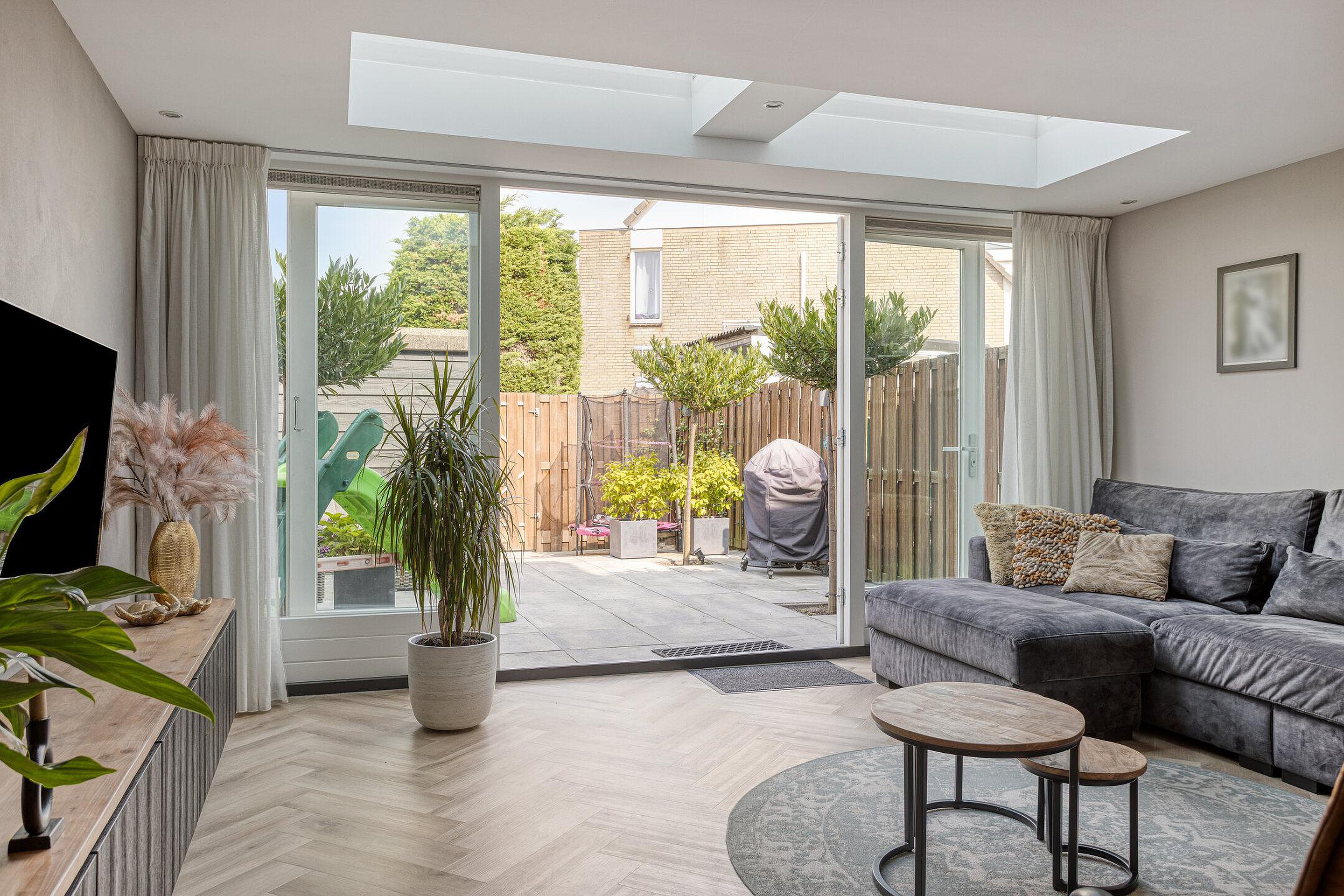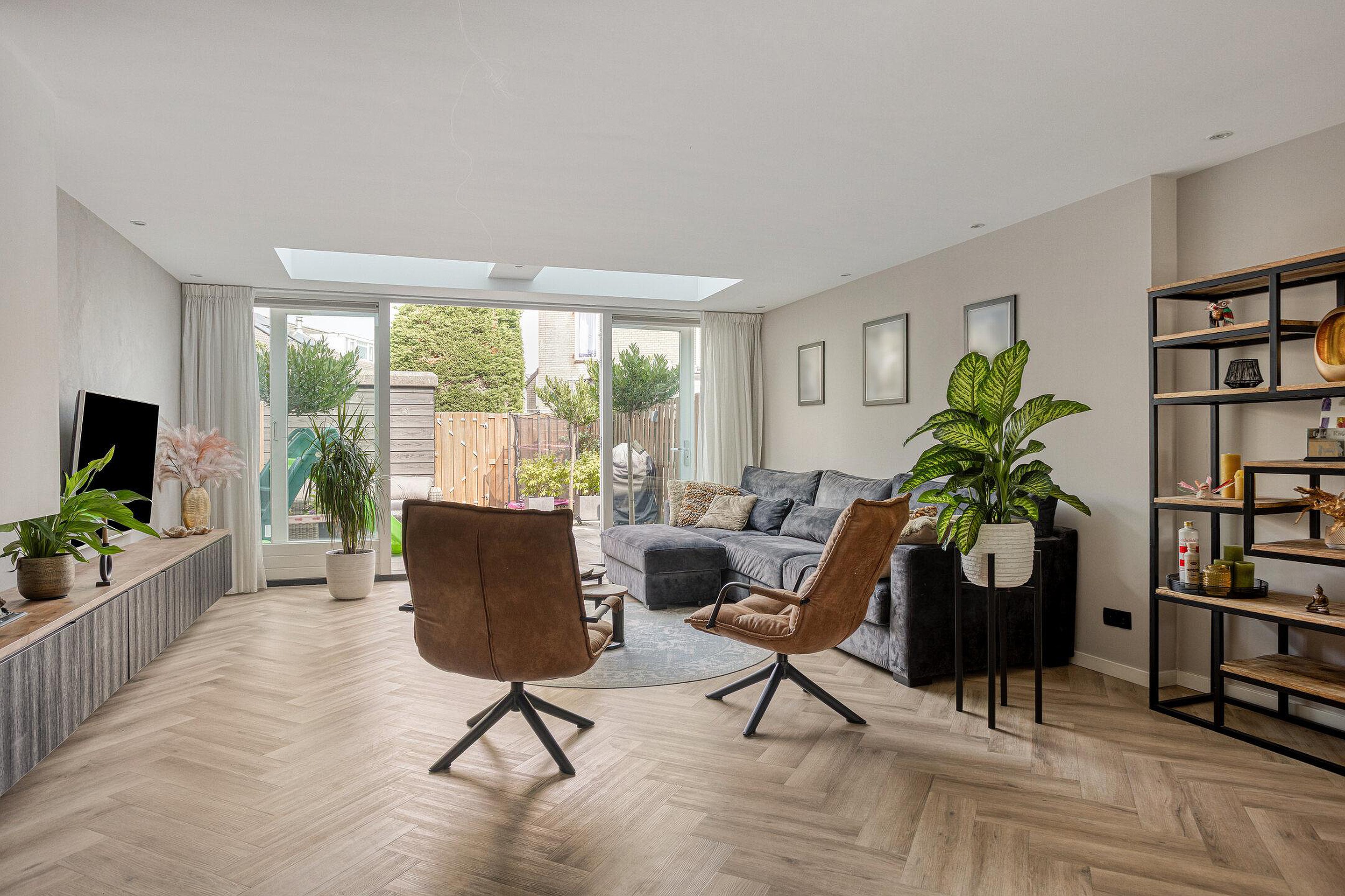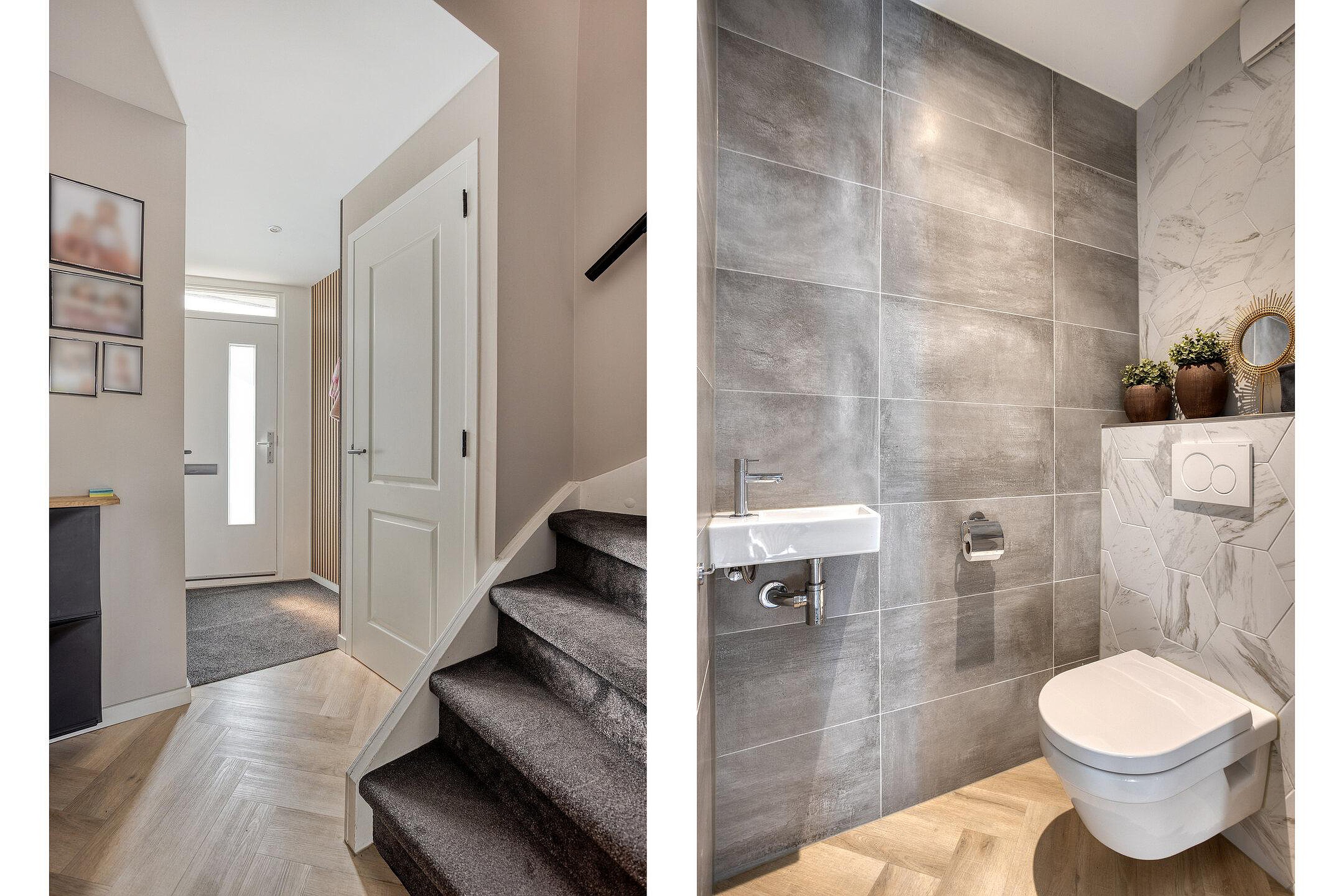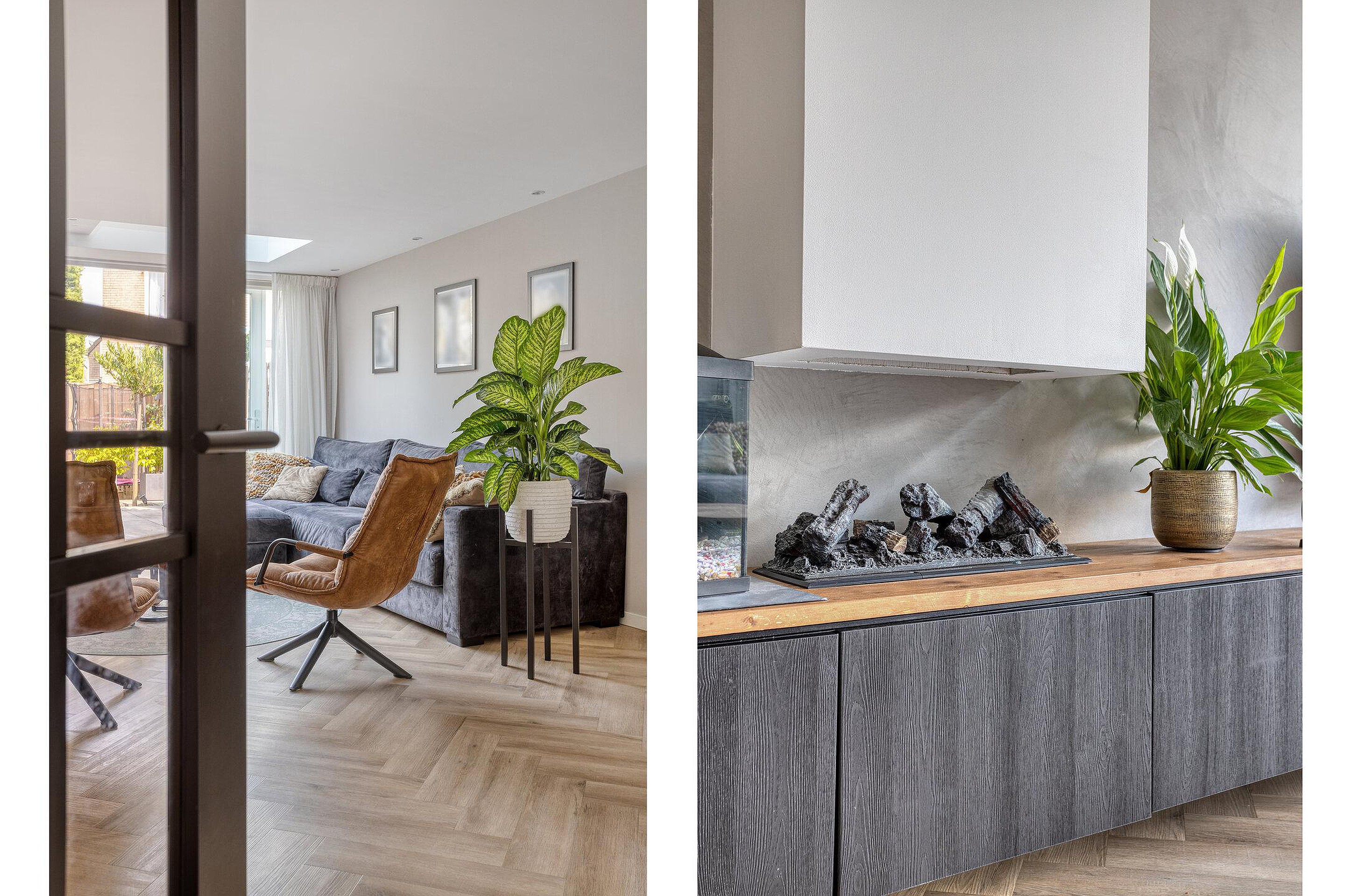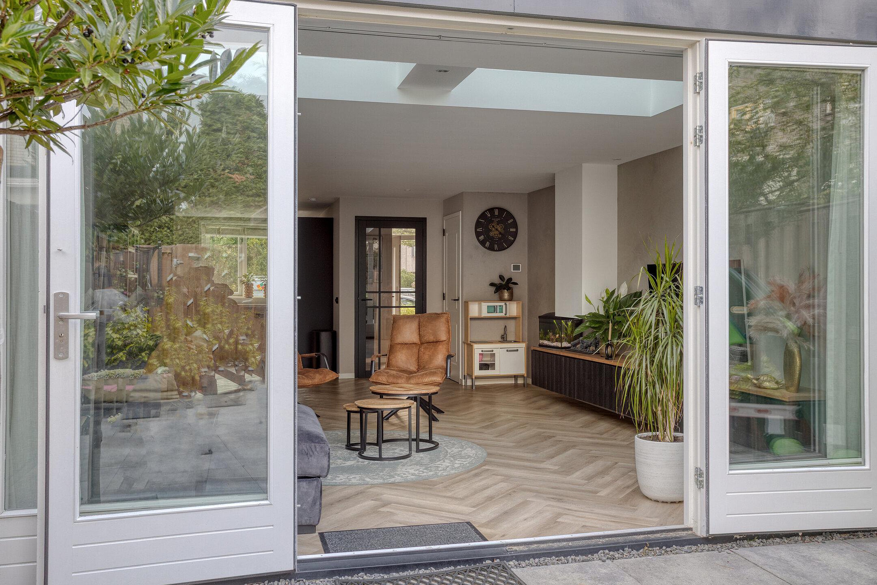 Net even wat speelser ingedeeld, maar direct komt de luxe en het moderne op je af. Rechts het gave en luxe toilet met fontein. Mooie tegels en gewoon af. We lopen door over de visgraat parketvloer, met vloerverwarming, en komen in de woonkamer. Dit is nog eens ruimte. Uitgebouwd, breed en heel veel daglicht toetreding. Komt ook door de lichtstraat die is gemaakt en door de openslaande deuren aan de achterkant. Terug naar de woonkamer. Zo verschrikkelijk diep en breed dat je genoeg ruimte hebt voor je hoekbank, je stoelen en je lange eettafel. Ideaal als je veel mensen over de vloer hebt voor de borrel of een verjaardag.