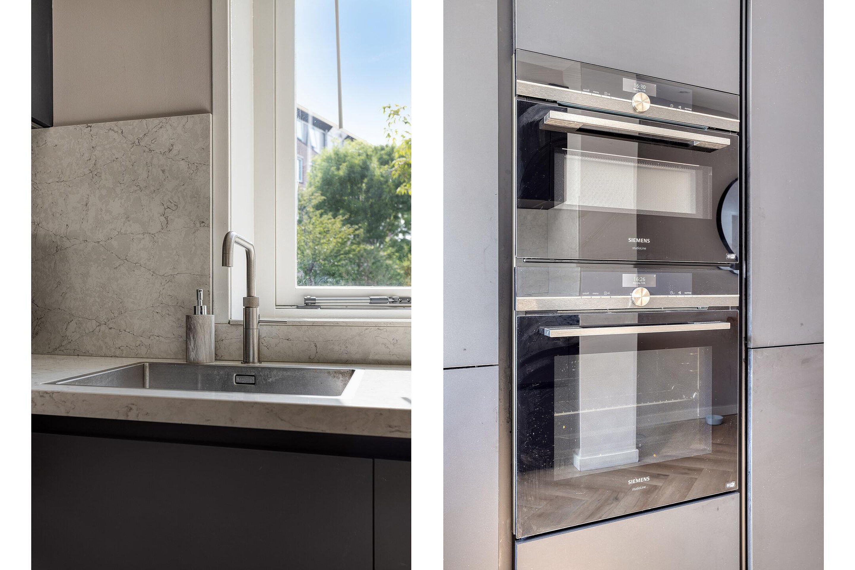 Door naar de voorkant. Wat een gave keuken is dit. Voorzien alle denkbare apparatuur. Van een quooker en inductieplaat met afzuiging, tot 2 ovens, een vaatwasser en een koelkast en vriezer. Alles van Siemens dus goede kwaliteit. Veel kastruimte en veel werkruimte. De hobbykok is hier heel blij mee.