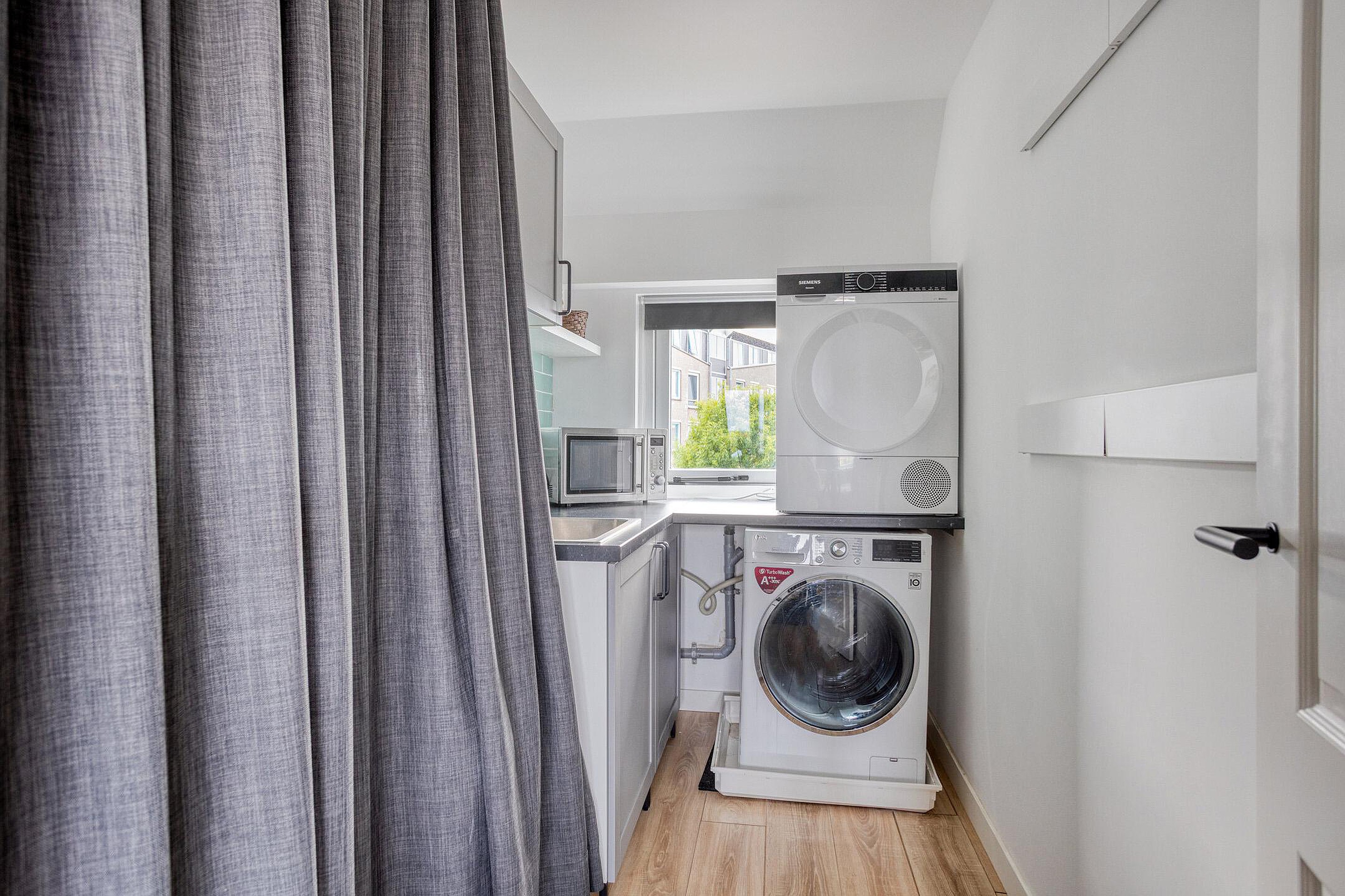 Wat ook echt heel tof en bijzonder is, is de aparte waskamer. Voorzien van de wma en dma, een keukenblokje met gootsteen en de opstelplaats voor de mechanische ventilatie unit en de cv ketel.