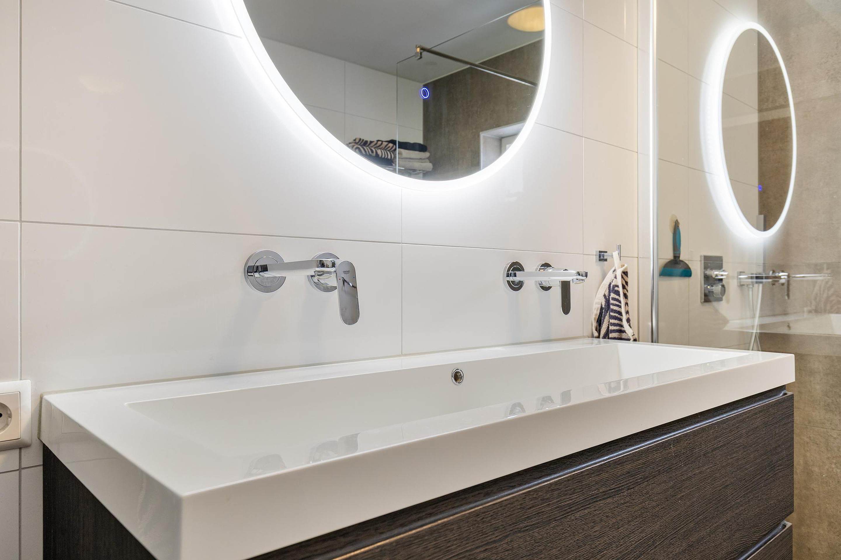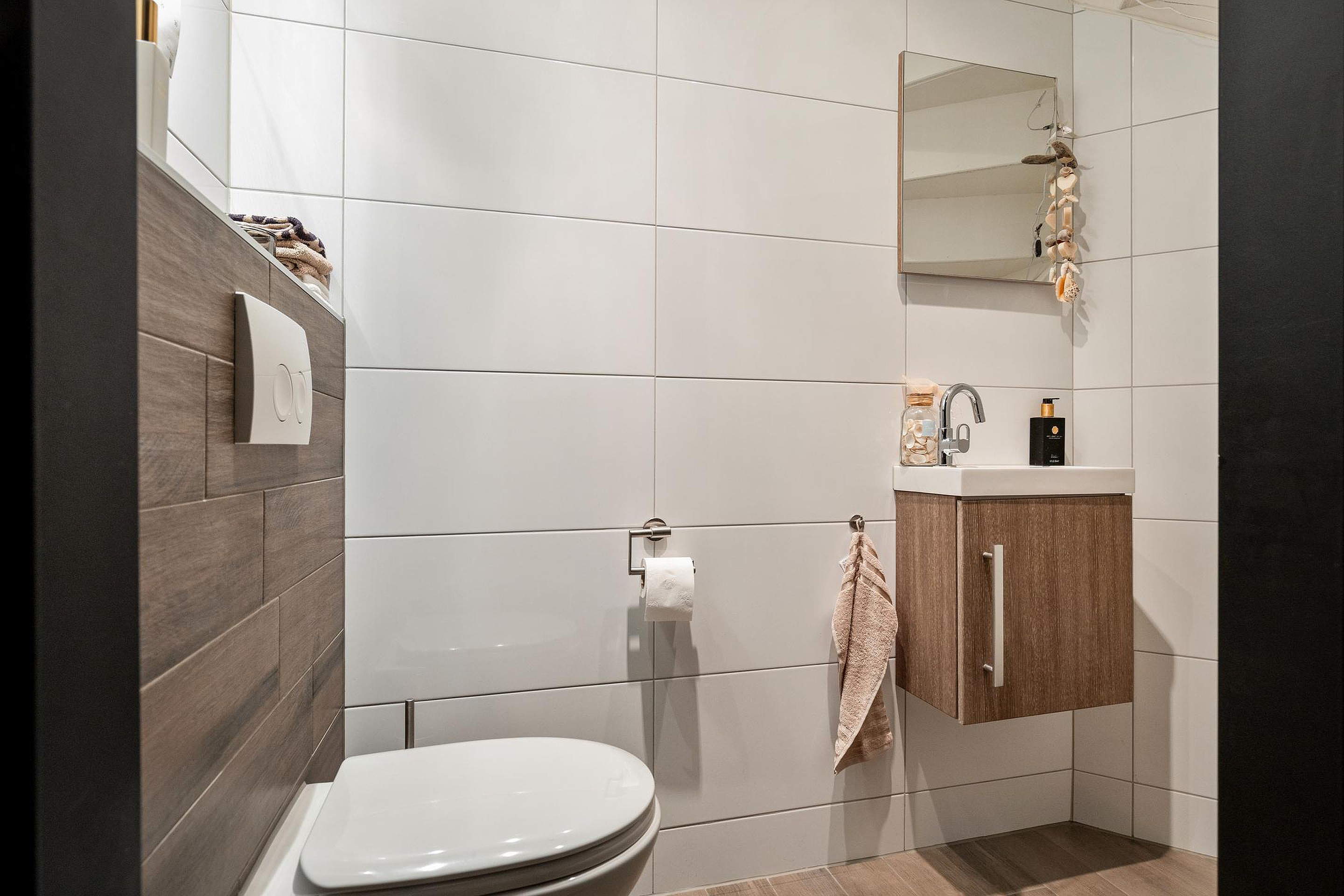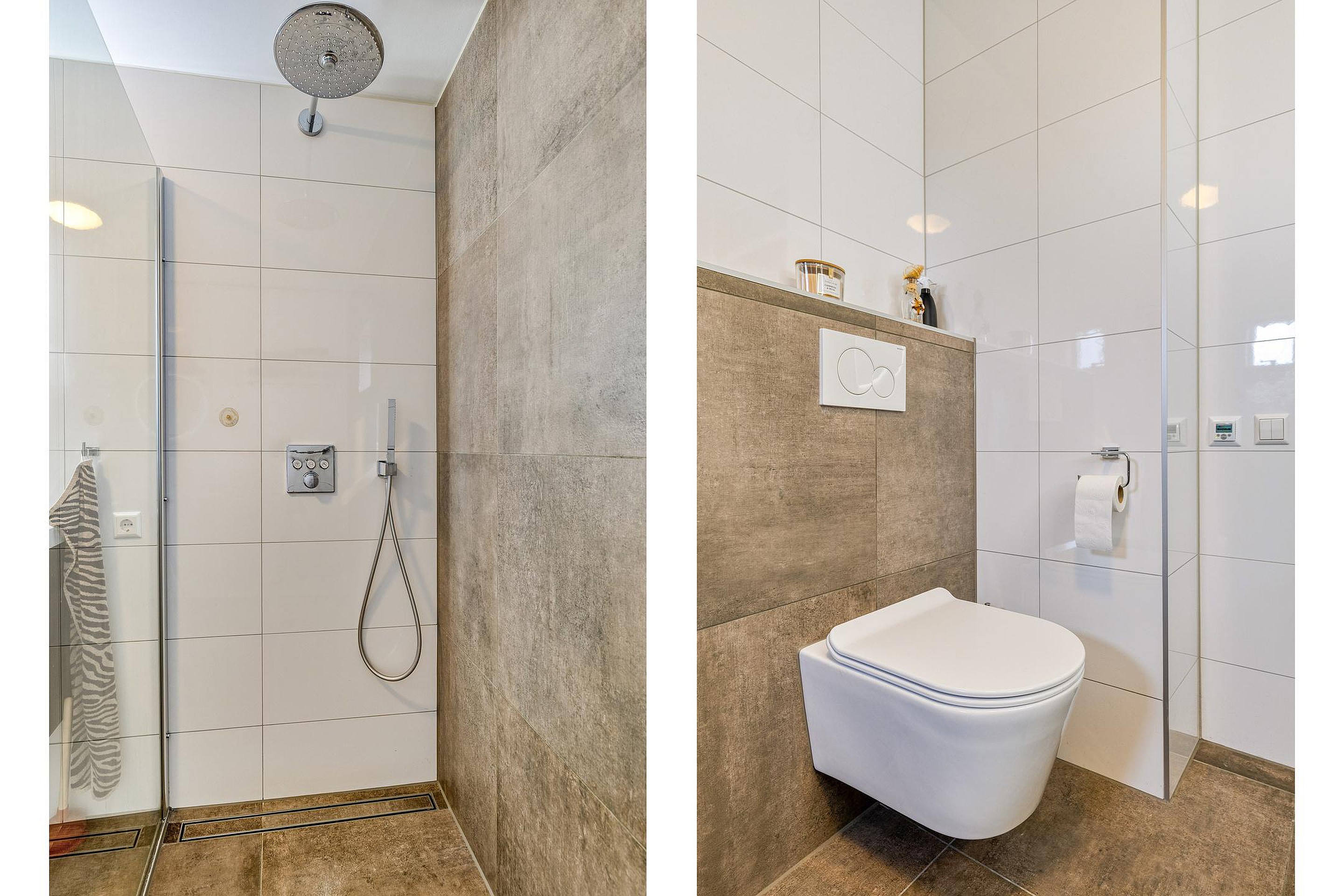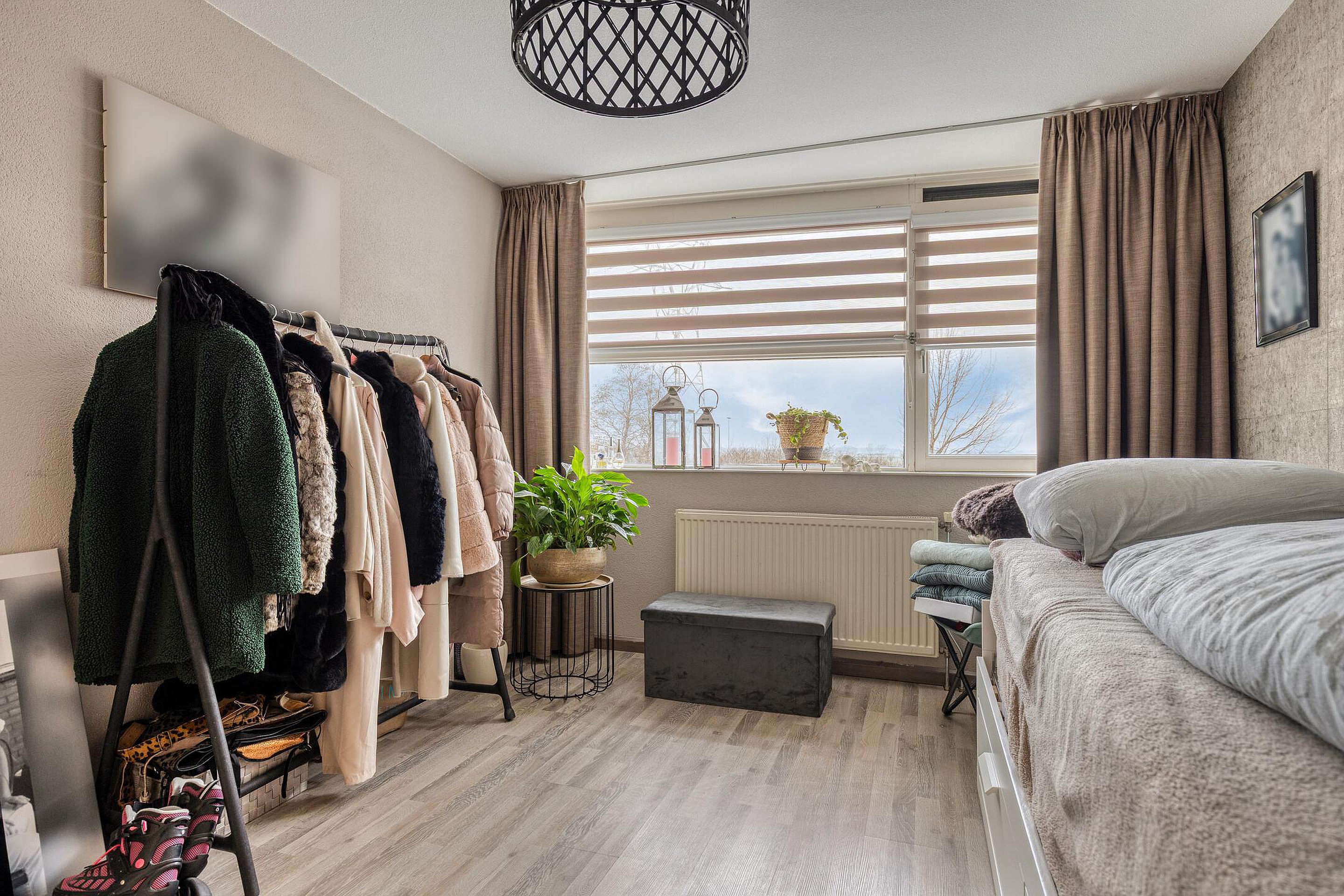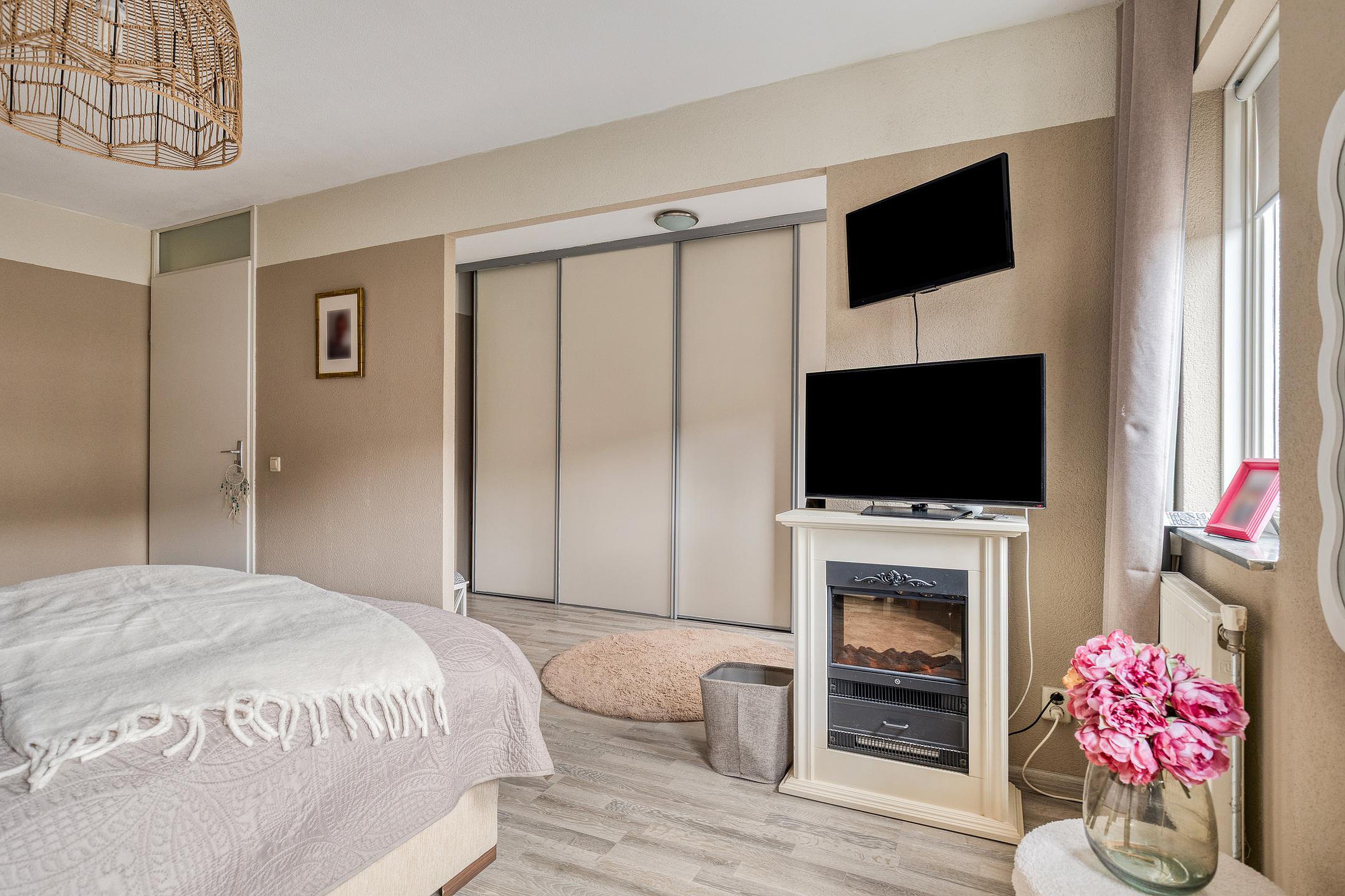 Overloop. Aan de achterzijde van deze leuke eengezinswoning bevinden zich oorspronkelijk twee slaapkamers. Deze kamers zijn thans met elkaar verbonden. Hierdoor geniet u van een extra ruime (ouder)slaapkamer met vaste kastenwand. De drie elektrisch bedienbare rolluiken zorgen voor comfort. Vanzelfsprekend kunt u ook voor de oorspronkelijke indeling kiezen. Aan de voorzijde van de woning vindt u een slaapkamer welke ook uitermate geschikt is als werk- en/of hobbyruimte. De verzorgde badkamer (2020) beschikt o.a. over een inloopdouche, dubbele wastafel met meubel, spiegel inclusief verlichting, 2e hangend closet en een tegelvloer met vloerverwarming. Het raampje maakt het geheel compleet.