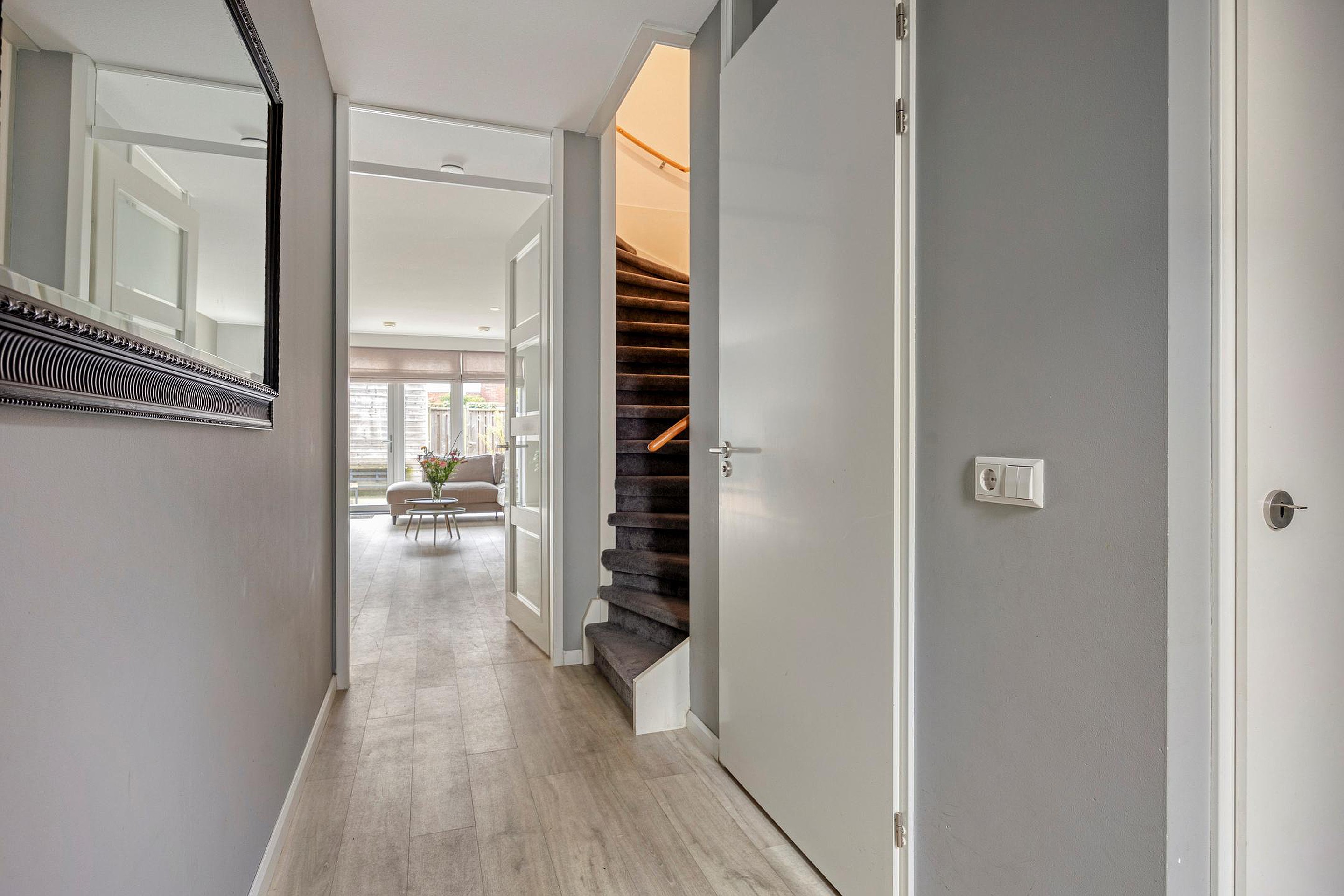 De tuin van ca. 35m2 ligt op het zuidoosten, waardoor je een groot gedeelte van de dag de zon hebt. Met het elektrische zonnescherm creëer je eenvoudig schaduw. Achterin staat een praktische houten schuur en natuurlijk er is een achterom. Op naar de 1e etage.