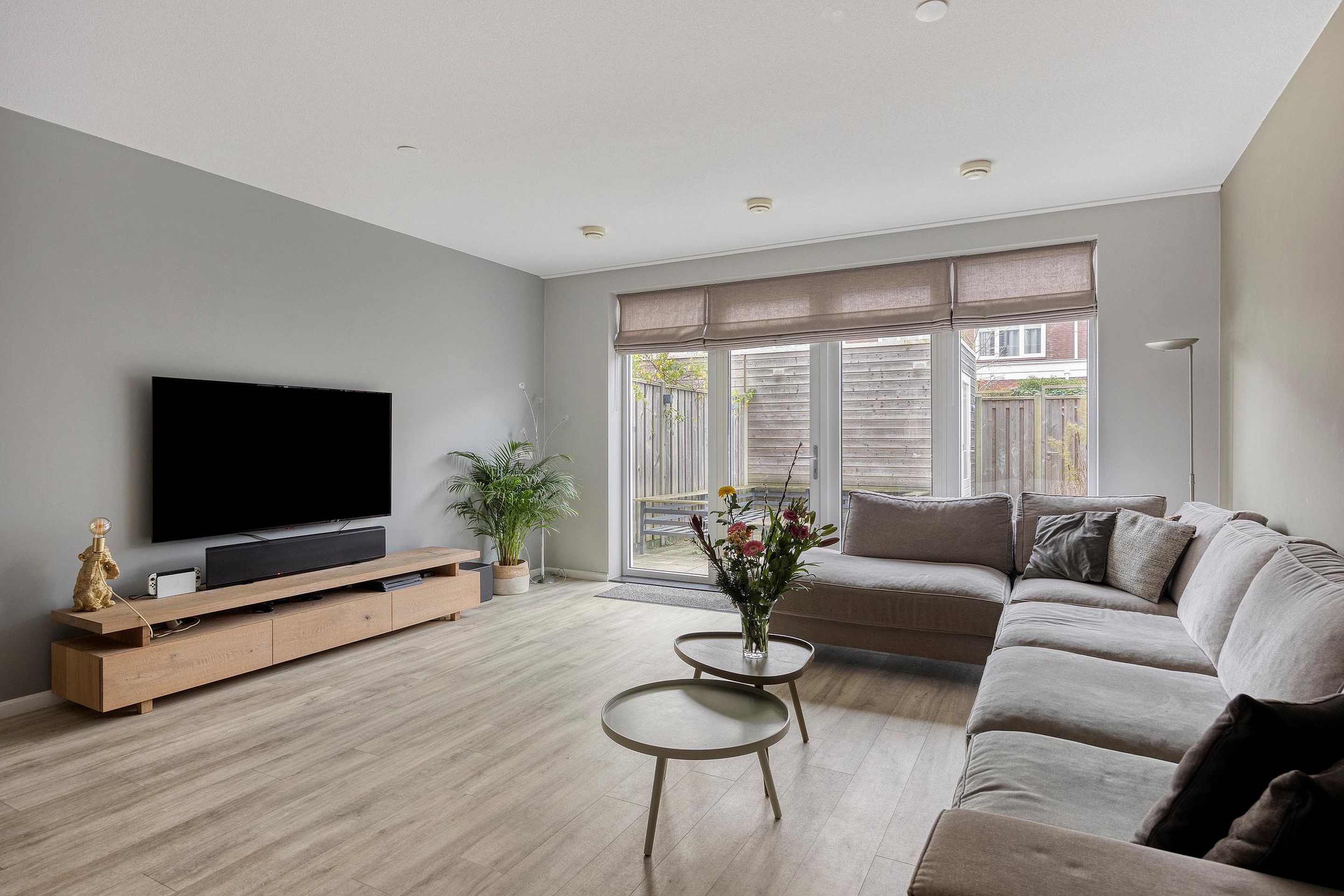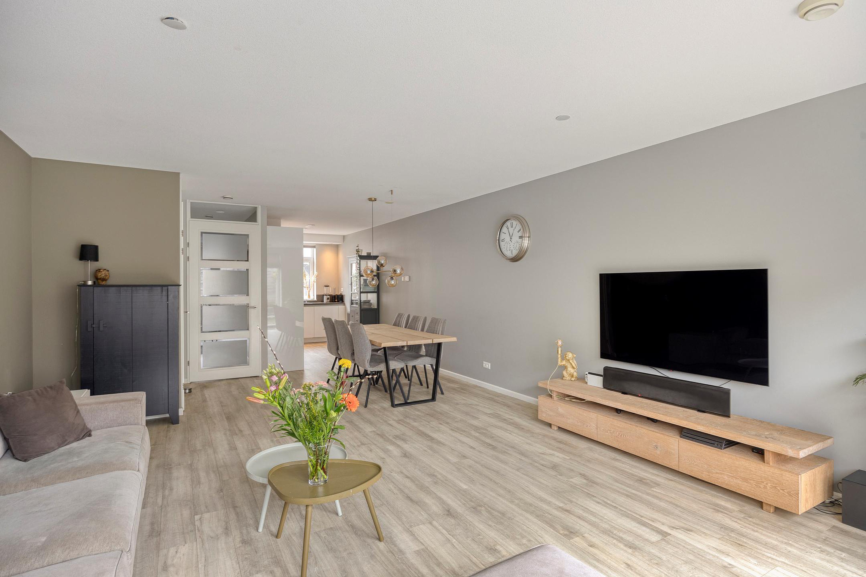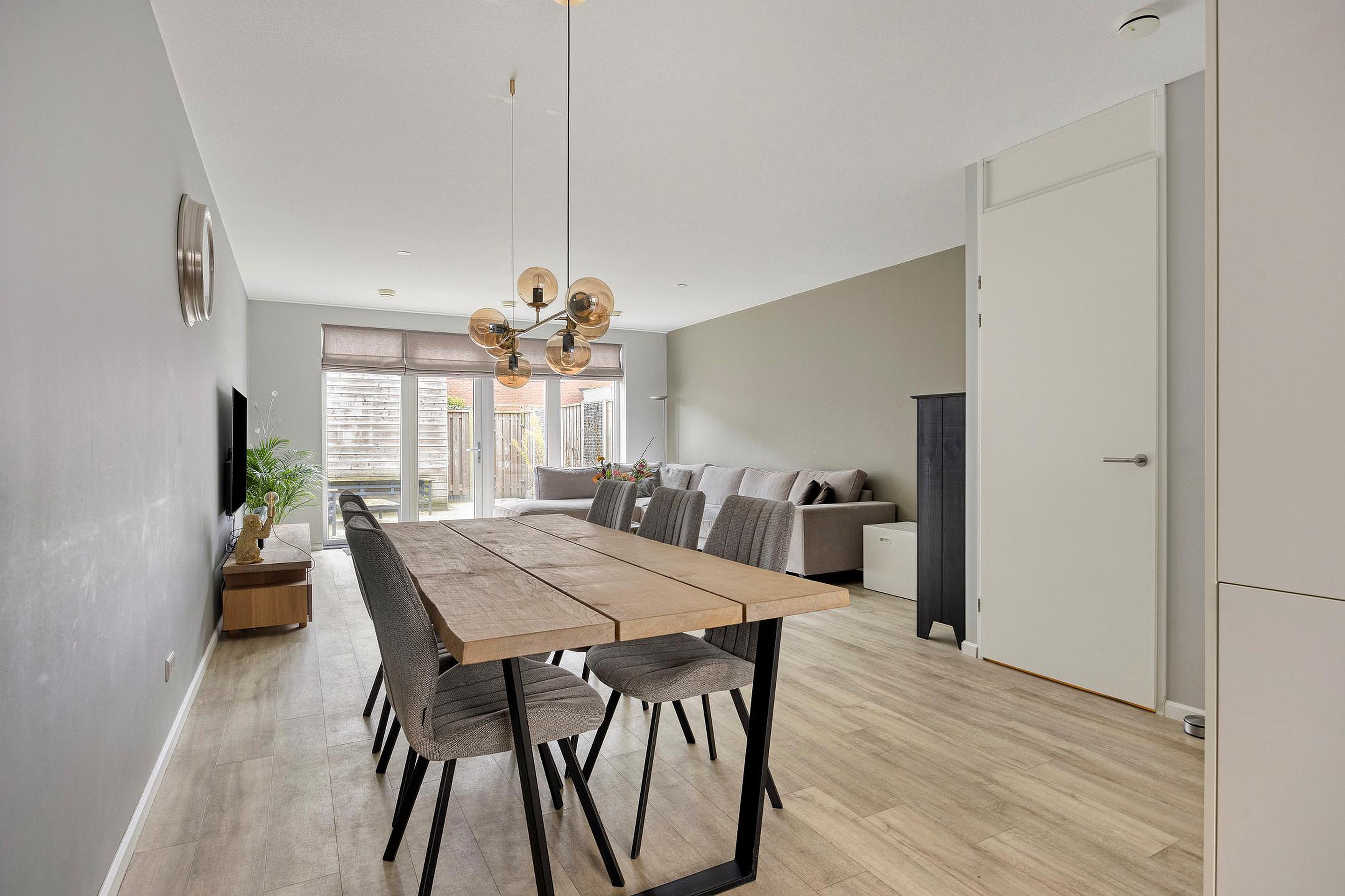 Aan de voorzijde ligt de luxe hoekkeuken, volledig uitgerust met inbouwapparatuur en slechts 8 jaar oud. Zo is er een Quooker, een vaatwasser, een combi-oven en een gewone oven, de koelkast, een vriezer en een 5-pits gaskookplaat met afzuigkap> door zijn hoek is er ook heel veel kastruimte aanwezig. We zo fijn als je van koken houdt. Terug naar de woonkamer. De woonkamer voelt echt als één grote leefruimte die je naar de zonnige achtertuin trekt.
