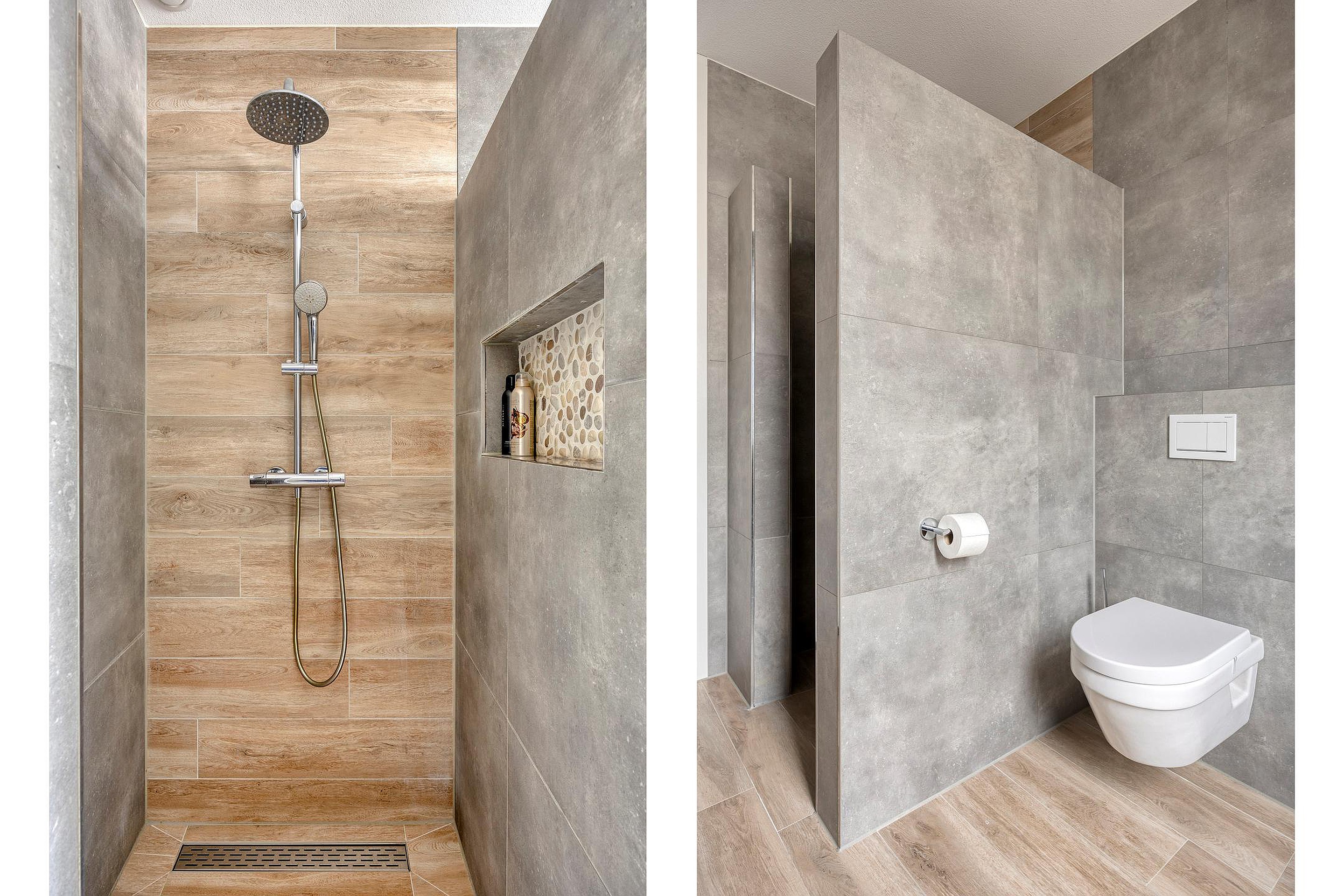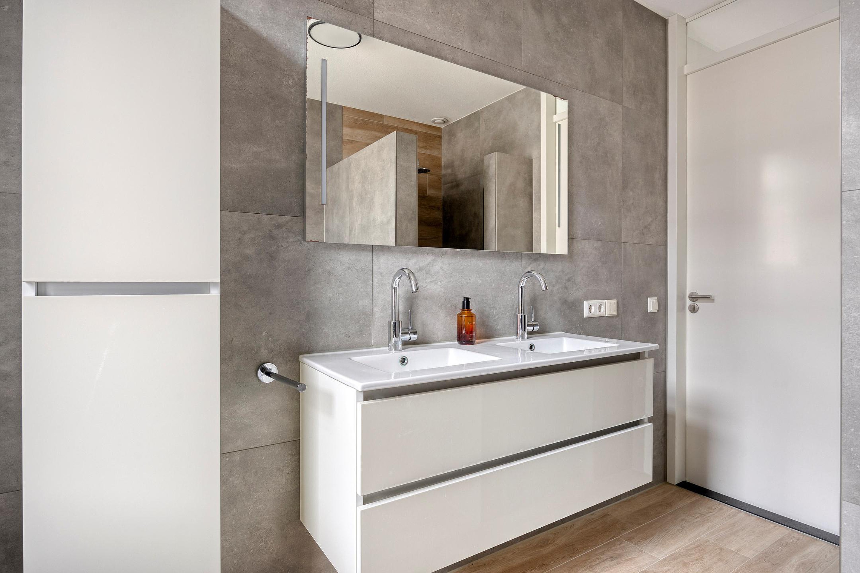 De badkamer is modern, luxe en volledig van nu: Naast een ruime inloopdouche, is er een dubbele wastafel met modern meubel, een tweede hangend toilet en vloerverwarming. Gewoon af.