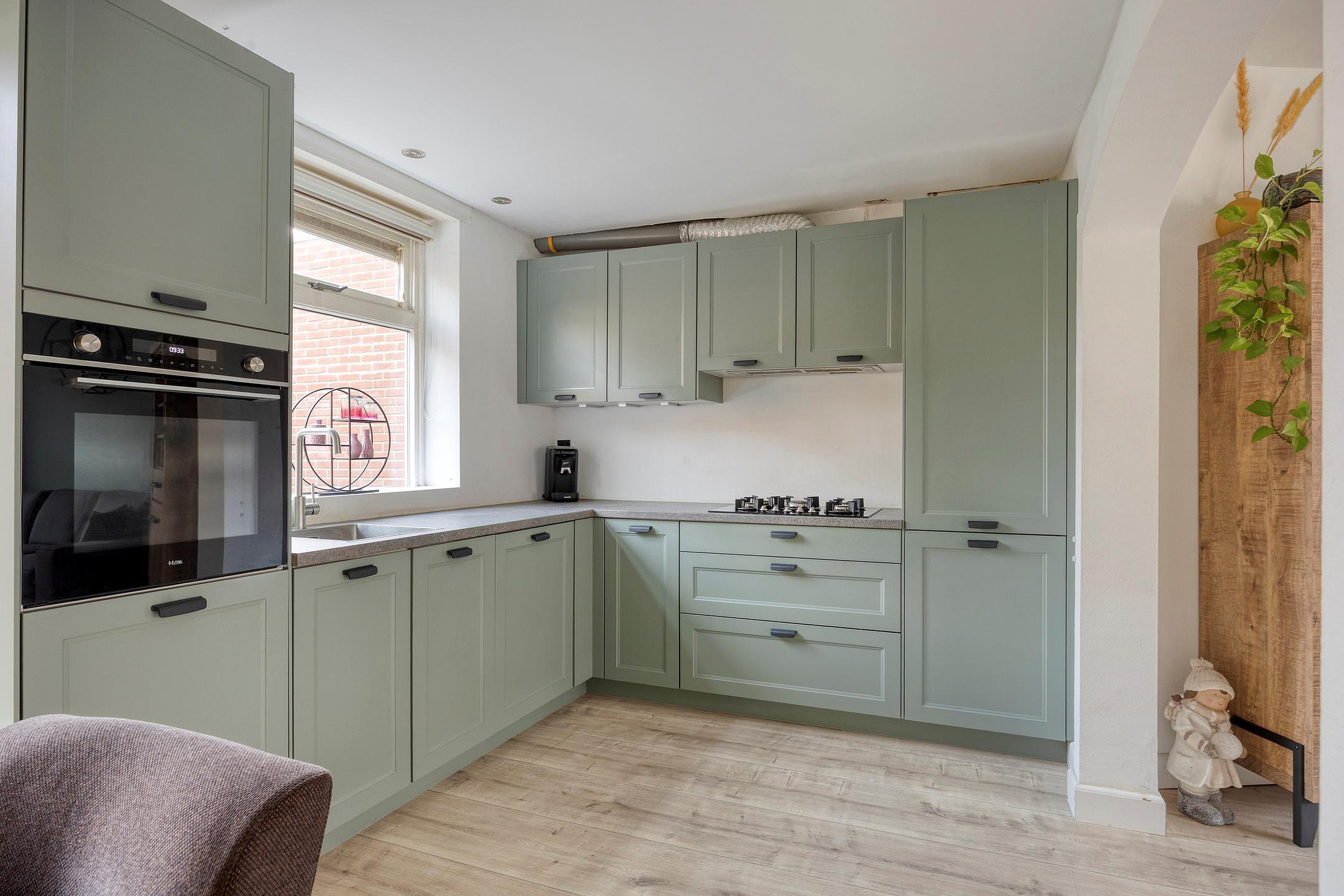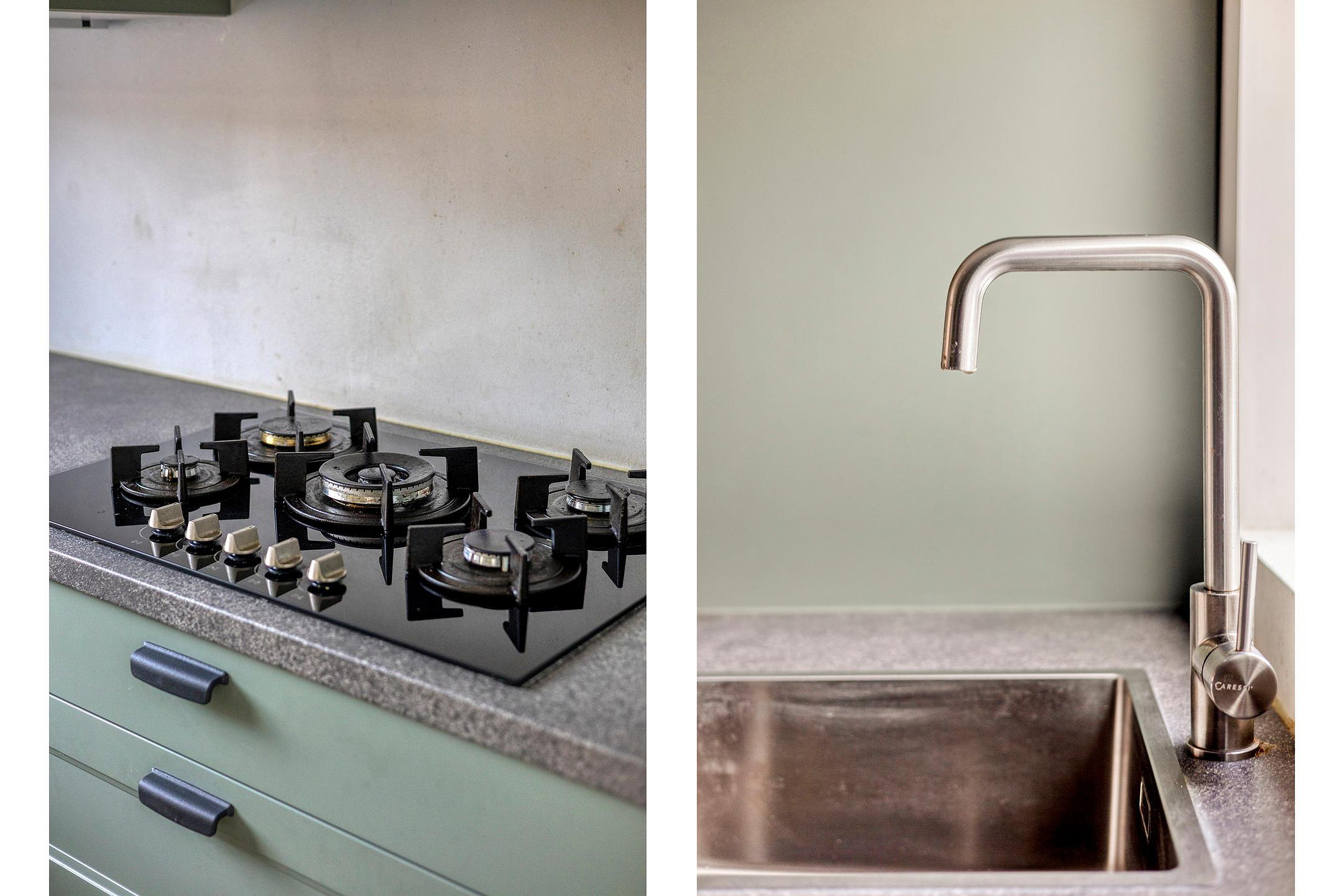 De keuken is juist wél helemaal af (op 1 wand na). Deze is twee jaar geleden vernieuwd en uitgevoerd in een luxe, moderne stijl. Je beschikt over een koelkast, vriezer, 5-pits gaskookplaat, afzuigkap, vaatwasser, oven en vooral veel werk- en bergruimte.