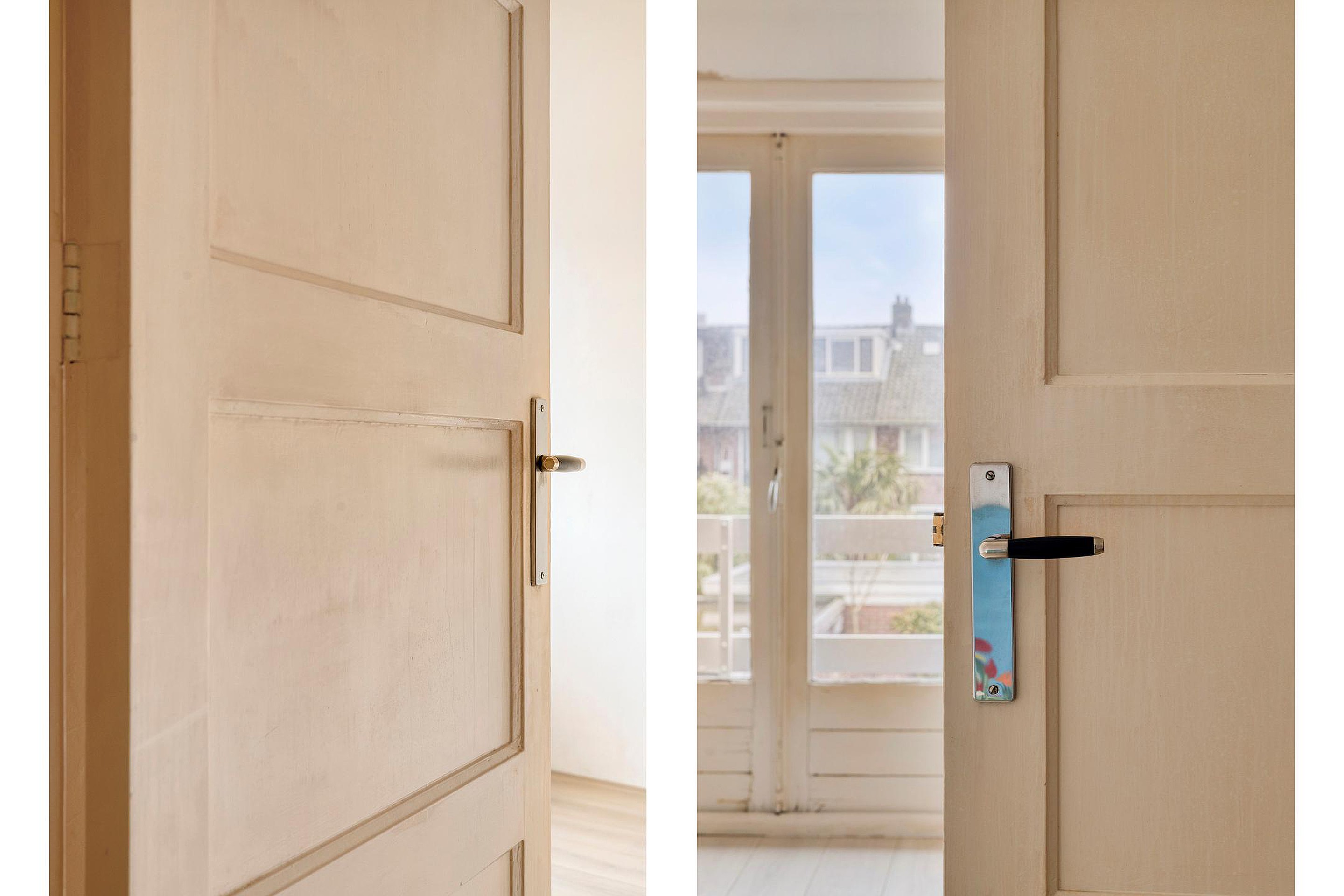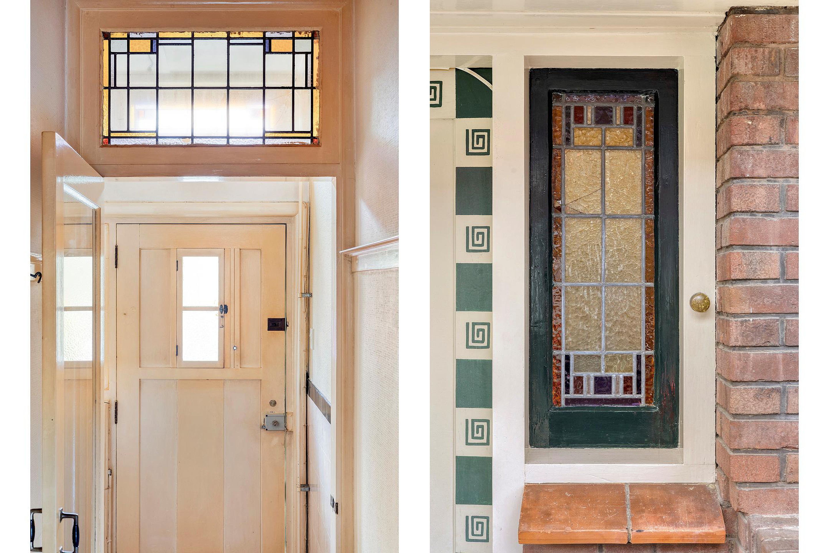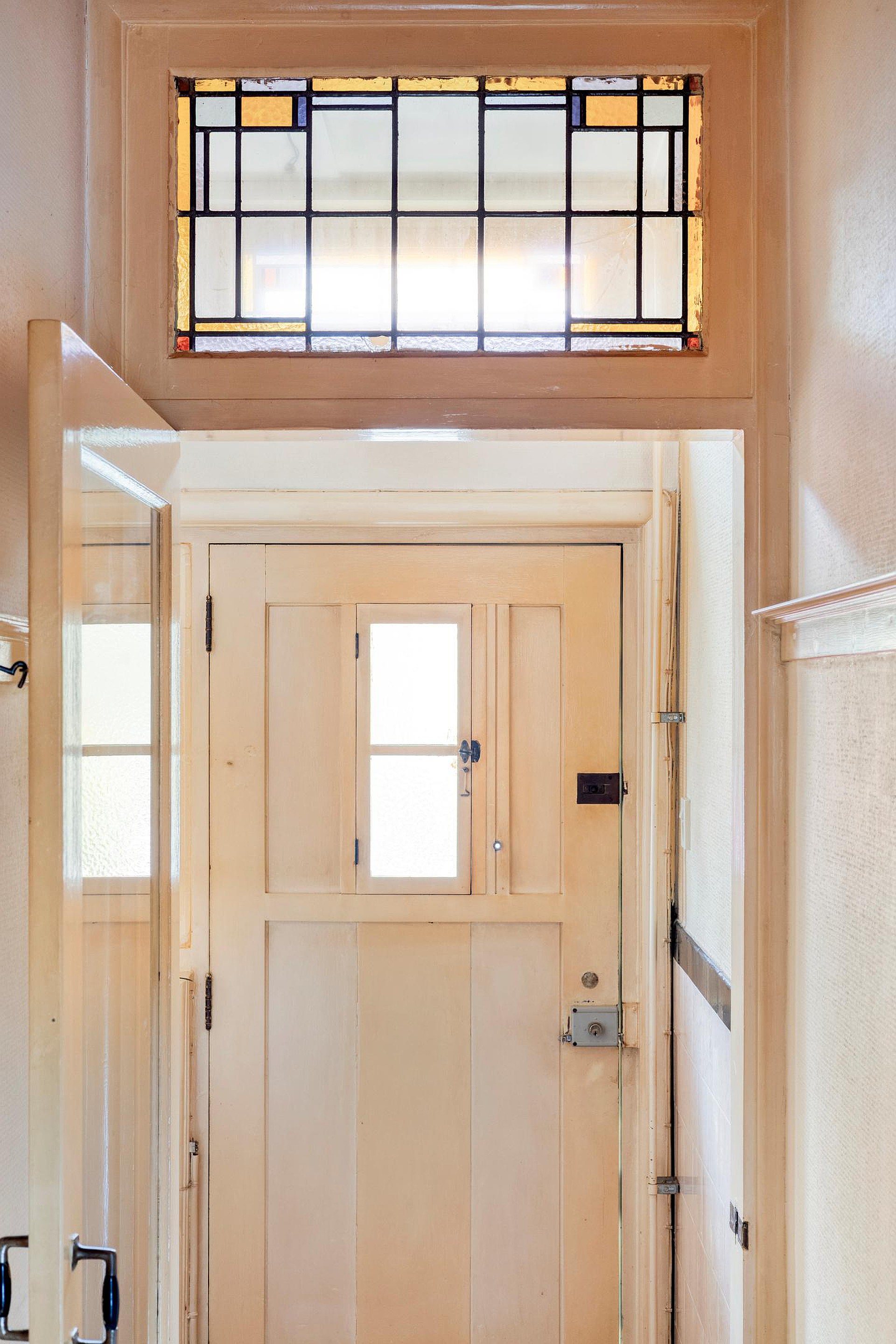 Begane grond Via de prachtige vestibule kom je binnen; direct vallen de gave glas-in-loodramen op. Onder het huidige vinyl ligt waarschijnlijk nog de originele granito vloer. De woning ademt jaren ’30: paneeldeuren, hoge plafonds en authentieke details zijn volop aanwezig.