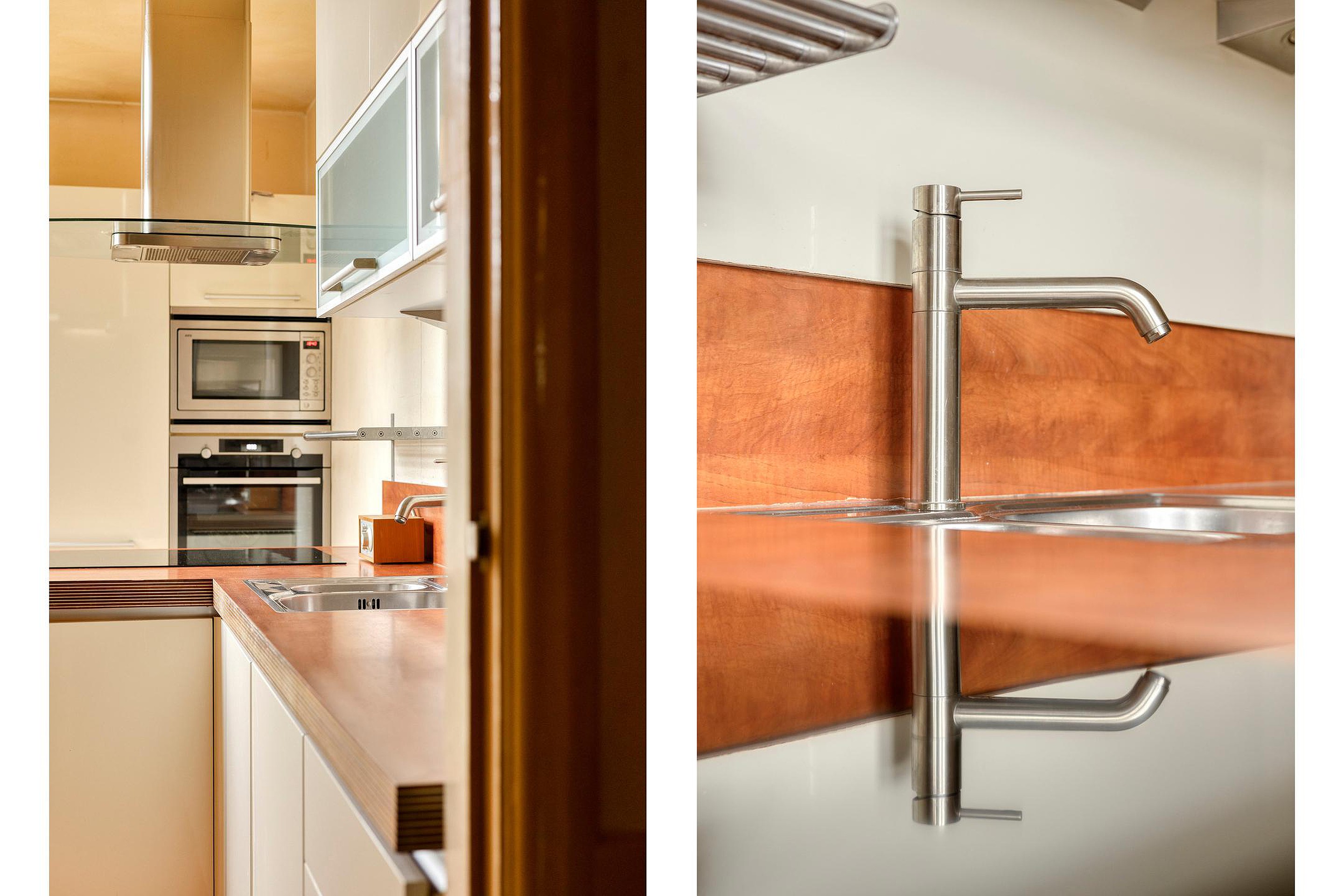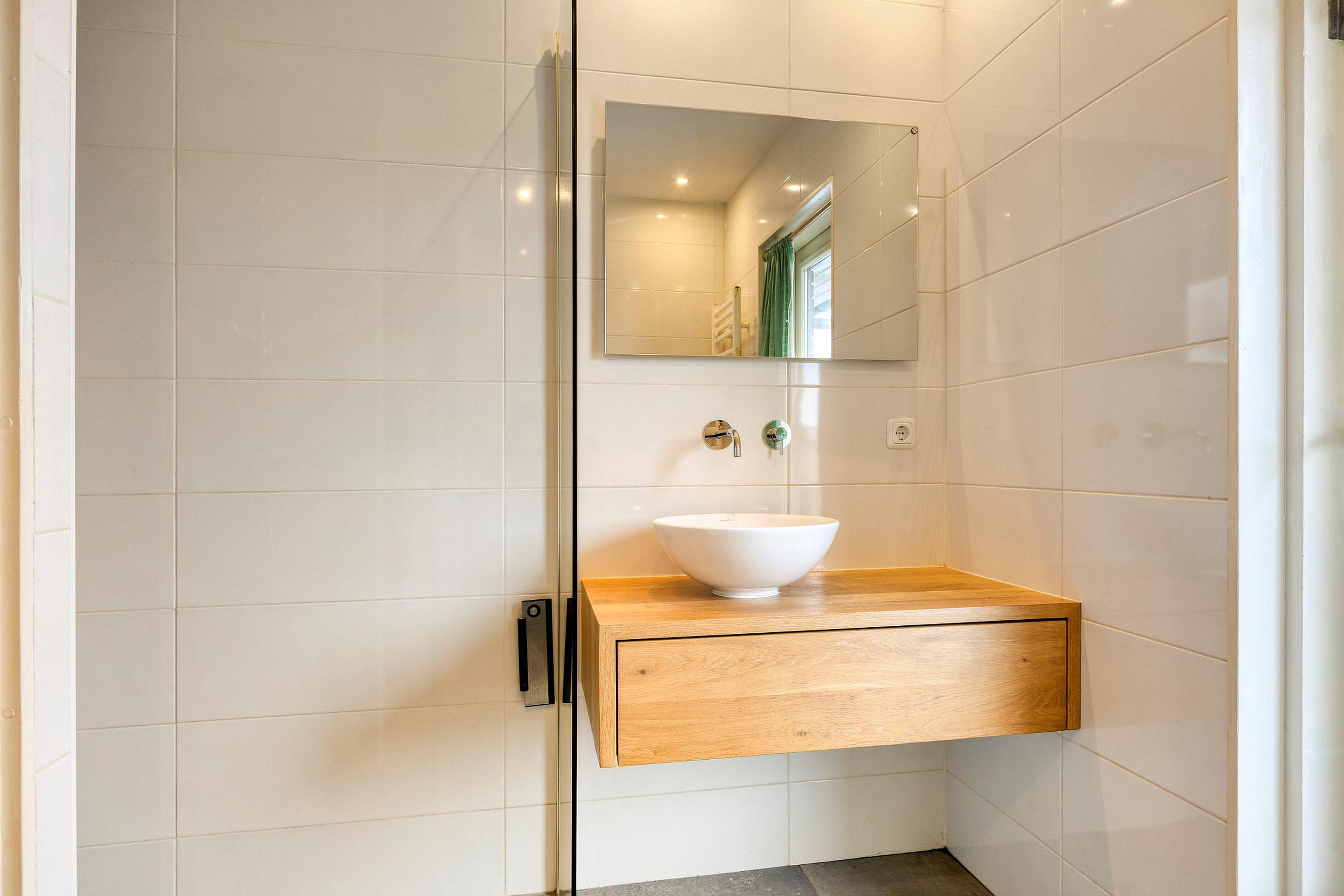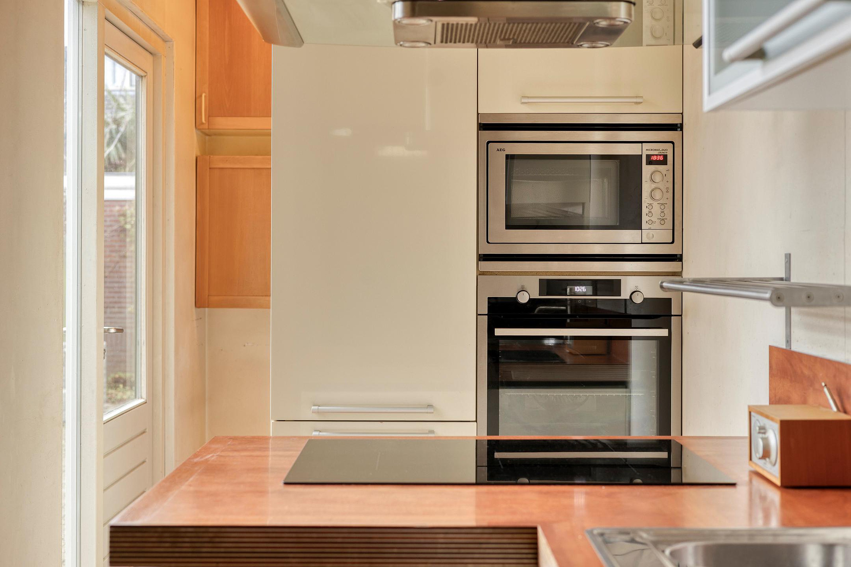 Vanuit de gang bereik je de L-vormige keuken, uitgerust met inductiekookplaat, vaatwasser, koelkast, vriezer, oven en magnetron. Een nette keuken die nog prima jaren mee kan. Aansluitend bevindt zich de bijkeuken, ideaal voor voorraad, lege flessen en een extra koelkast. Tevens de opstelplaats voor de WMA en de CV ketel. Deze ruimte is eenvoudig bij de keuken te betrekken — hoe dat kan, laten we je graag zien.