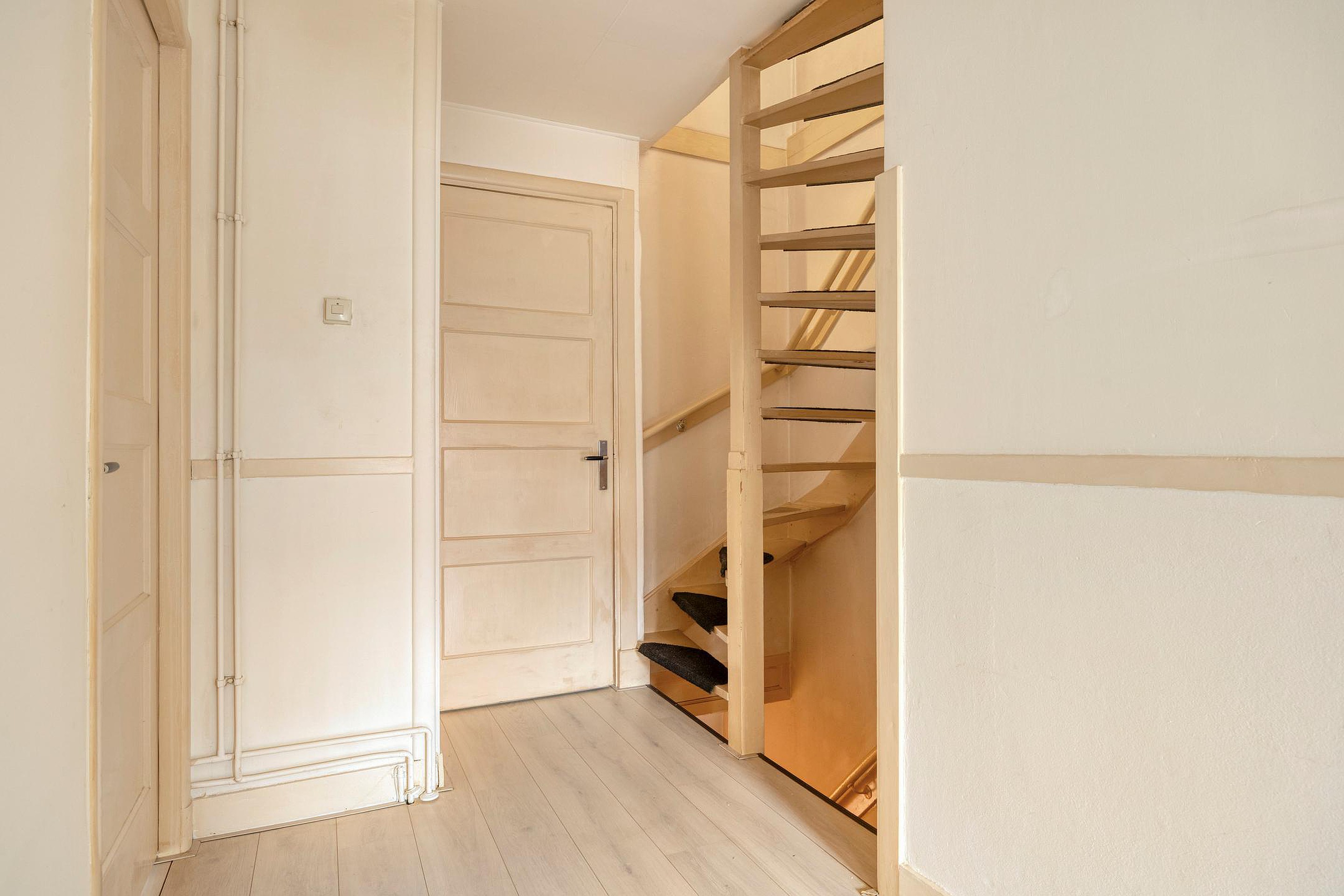 De lange gang geeft toegang tot een modern toilet, de trapkast en de woonkamer. Let ook hier weer op de fraaie paneeldeuren.