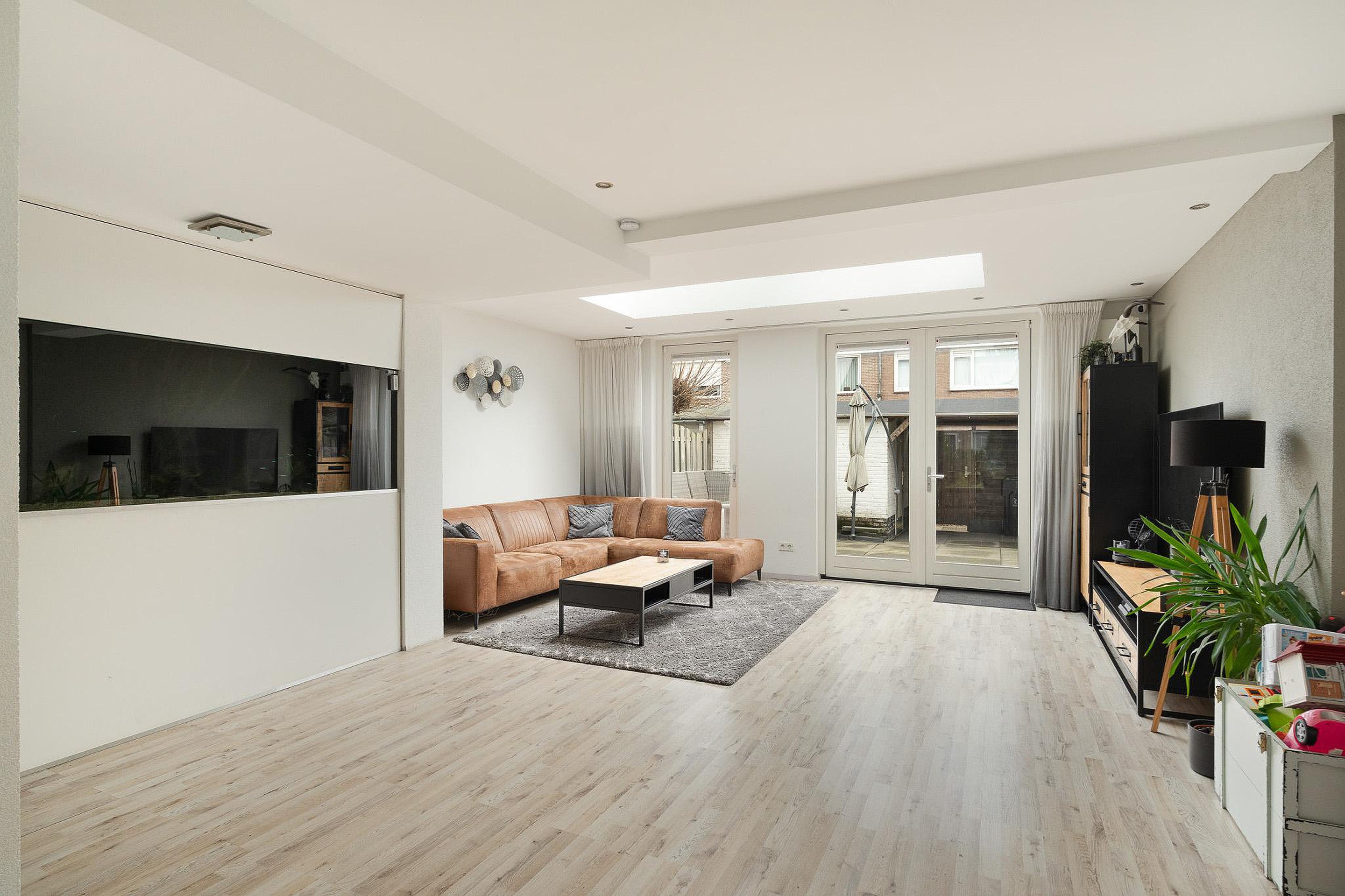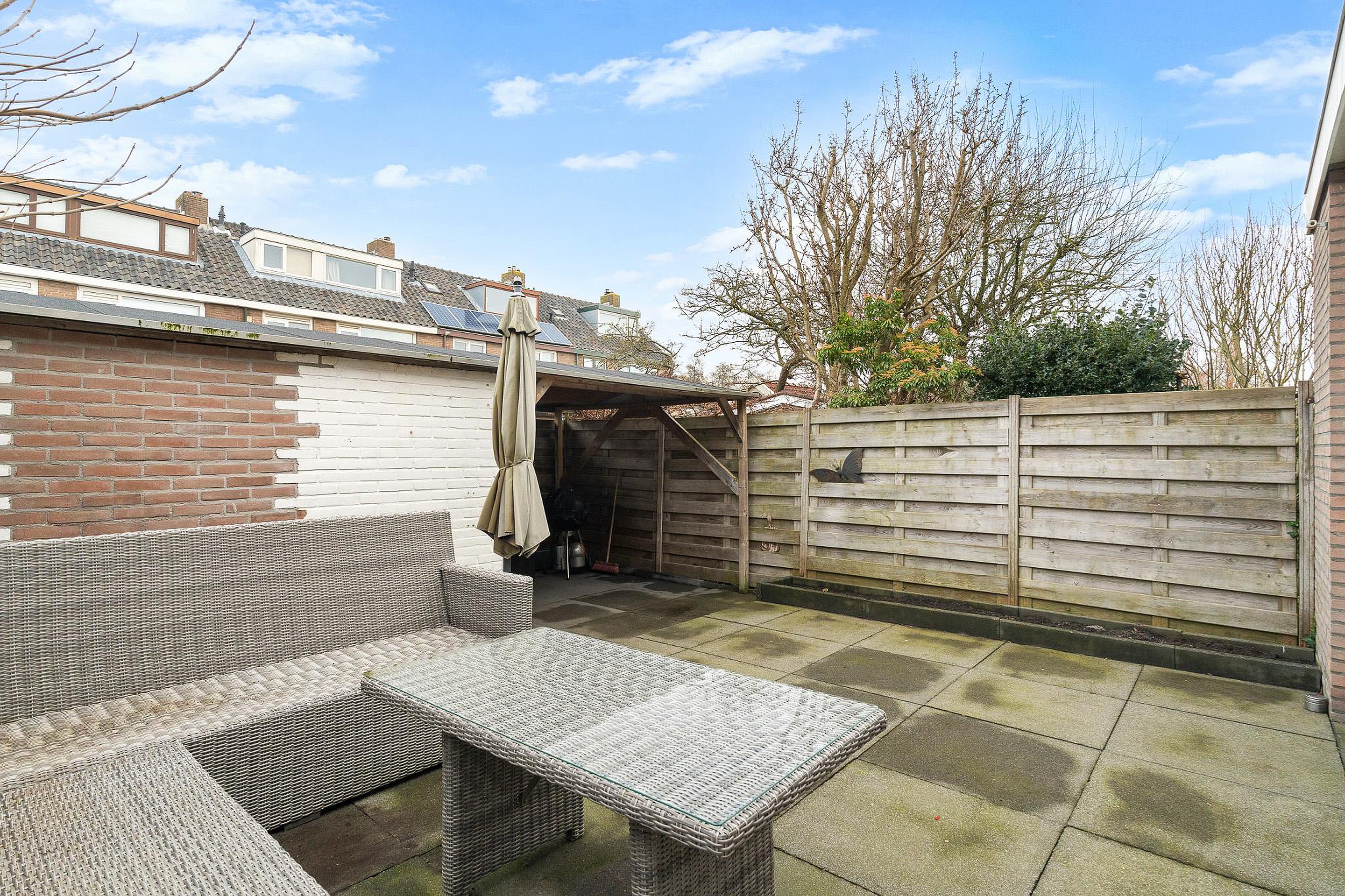 Via openslaande deuren én een separate loopdeur is de achtertuin bereikbaar. Deze tuin is grijs betegeld, onderhoudsvriendelijk en voorzien van een overkapping, waarbij het schuine dak van de aanbouw mooi doorloopt over de berging.