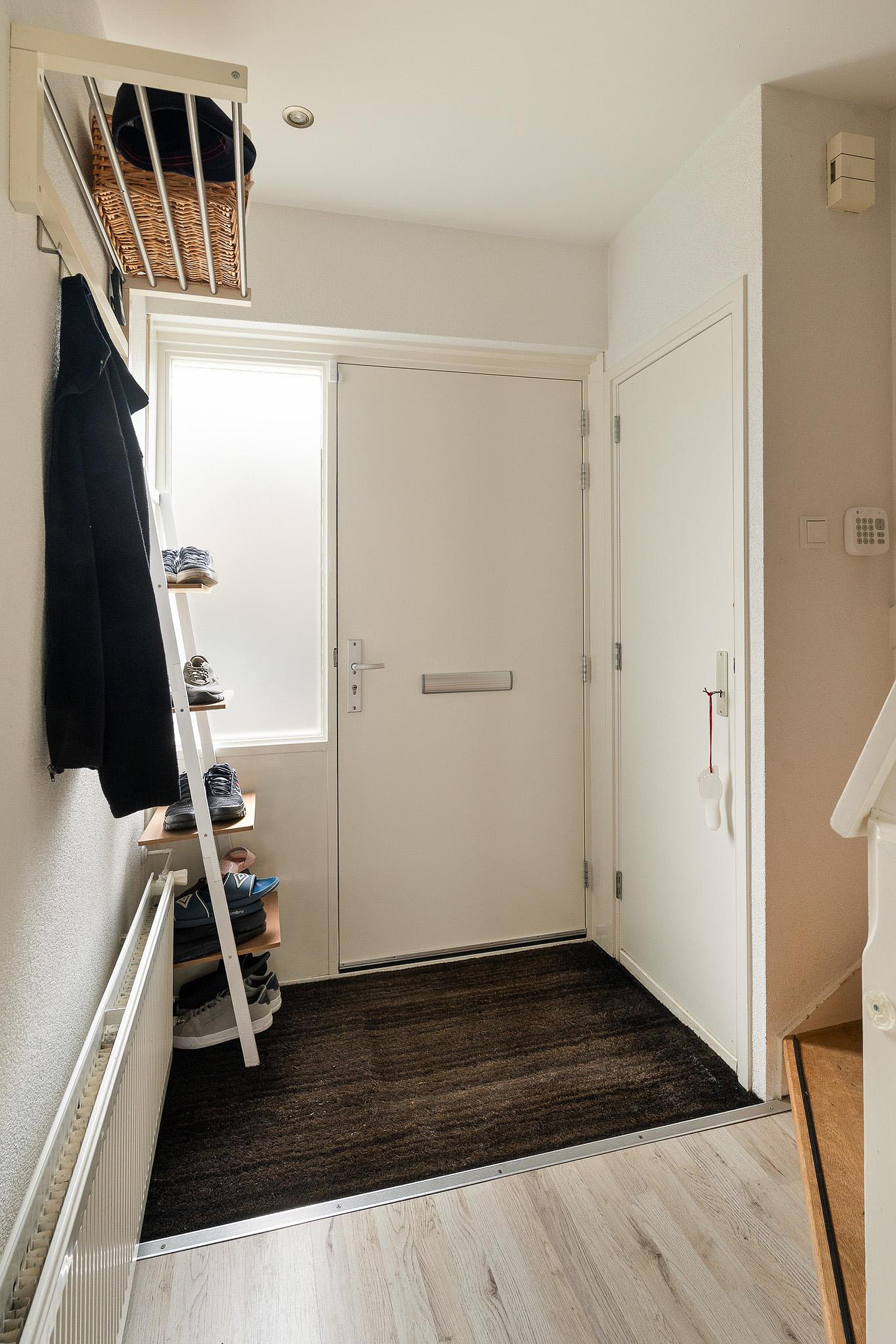 Via de voortuin bereikt u de entree van de woning. In de hal bevinden zich de meterkast, de trapkast, het moderne zwevende toilet en de trap met vernieuwde houten bekleding en een zwarte accentstreep naar de etage.