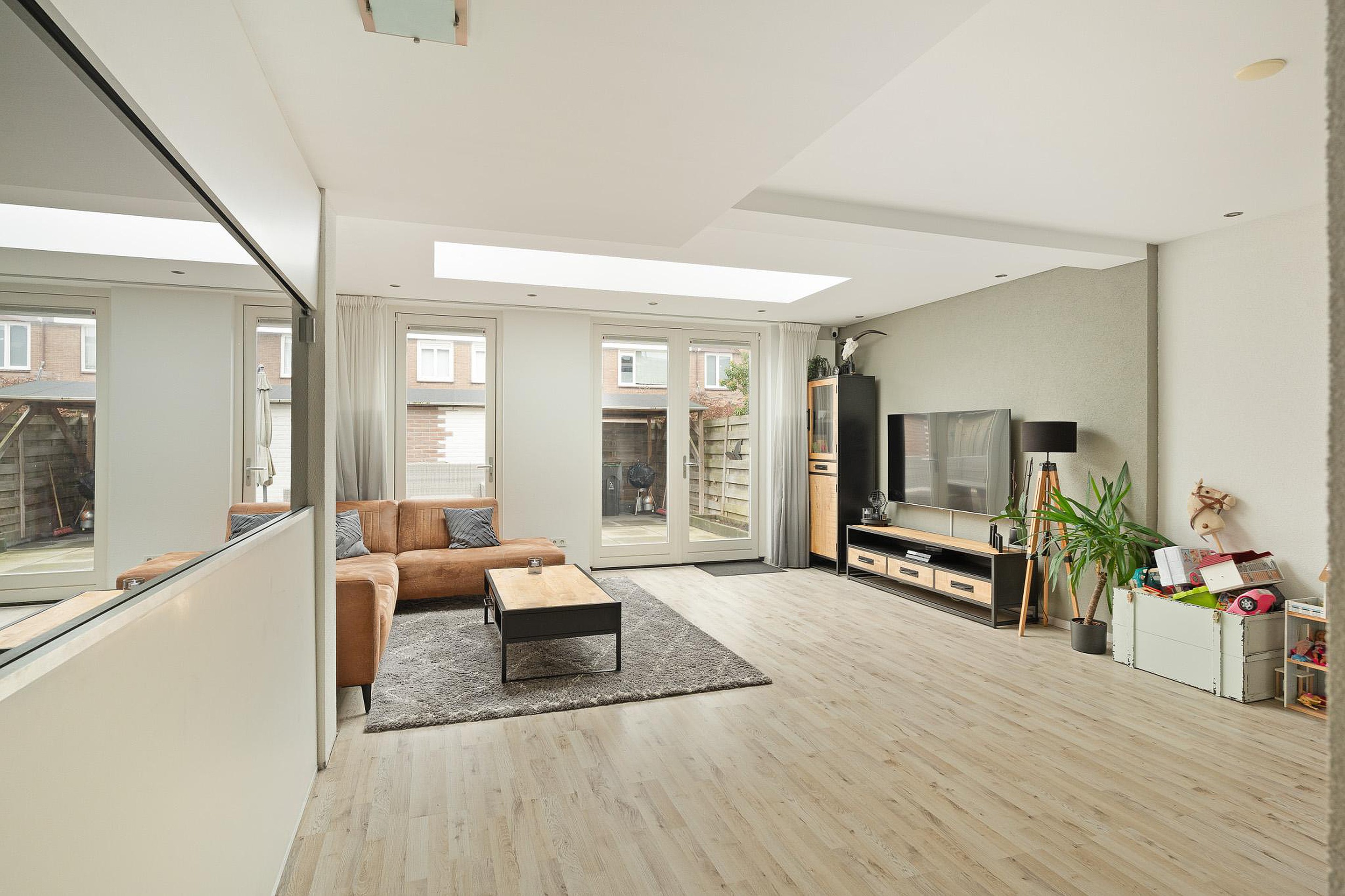 De begane grond is afgewerkt met een lichte laminaatvloer die doorloopt over het gehele oppervlak. De woonkamer is 3,5m uitgebouwd en hierdoor riant. In de aanbouw zorgt een lichtstraat voor extra daglicht en een ruimtelijk gevoel. Alle plafonds zijn strak gestuct en de wanden zijn afgewerkt met spachtelputz.