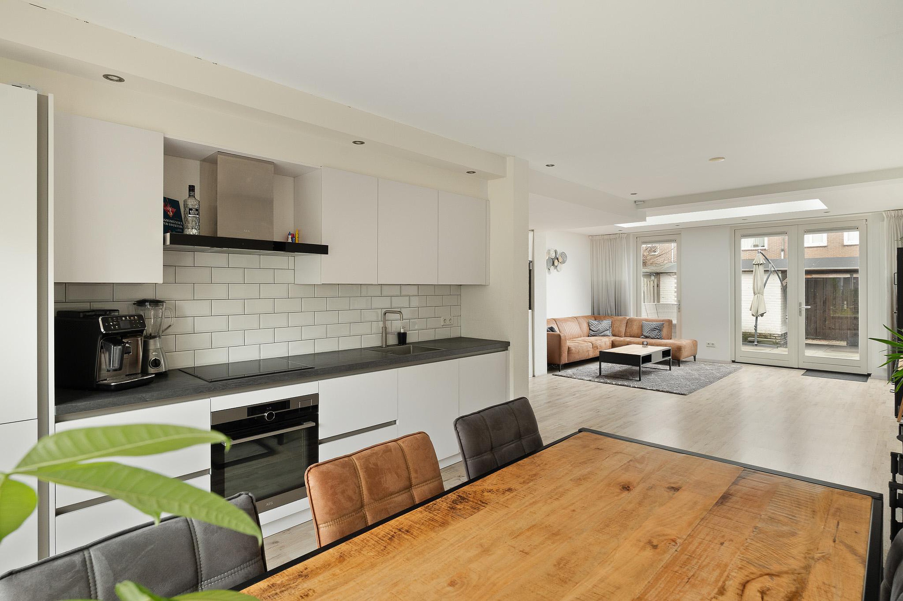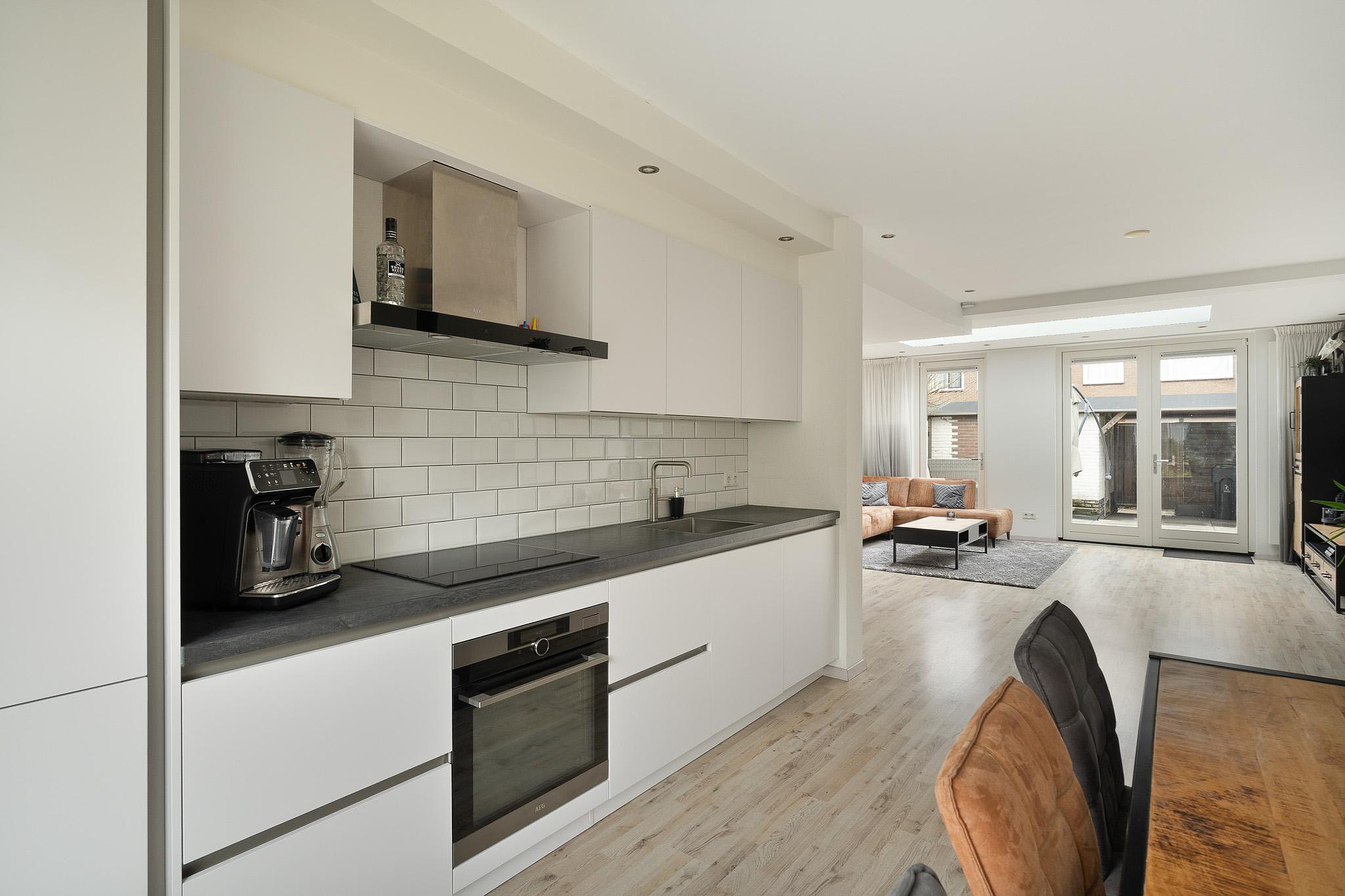 De open keuken is uitgevoerd in een wit-grijze kleurstelling met een donkergrijs leisteen werkblad en voorzien van diverse inbouwapparatuur, waaronder een inductiekookplaat, afzuigkap, stoomoven, magnetron, vaatwasser, Quooker en koel-vriescombinatie. Een ingebouwd aquarium en een houtkachel zorgen voor extra sfeer.