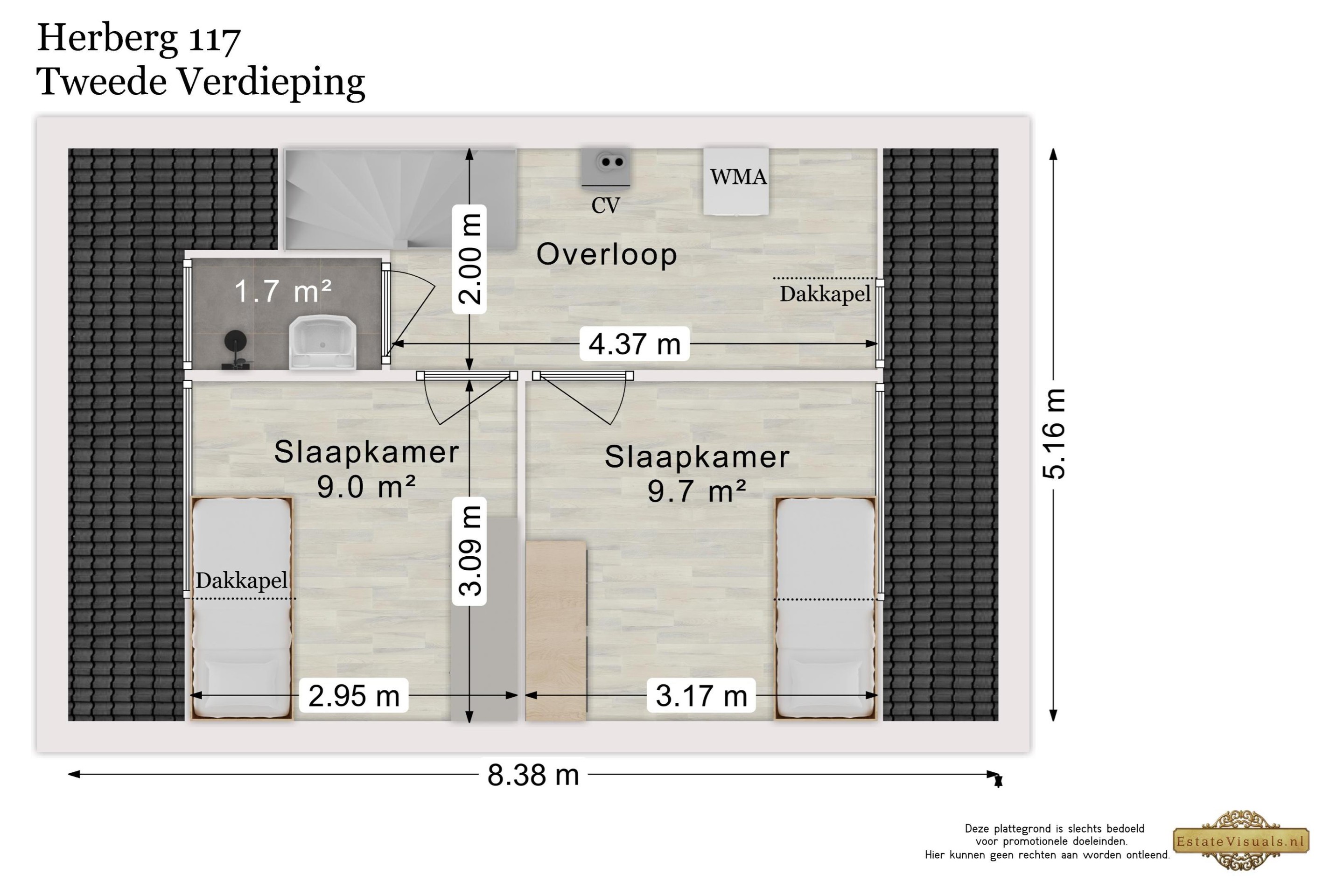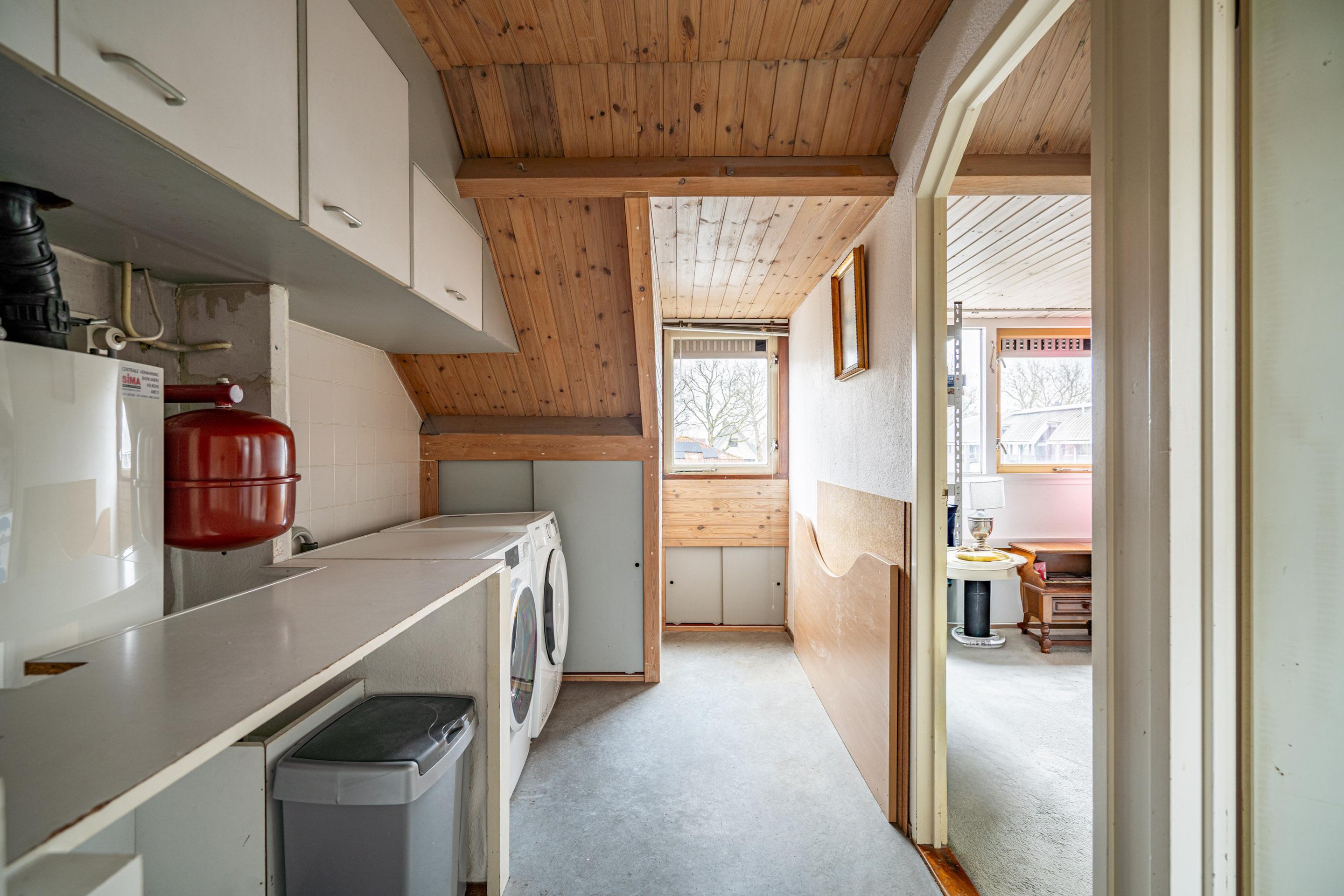 Tweede verdieping Overloop met opstelling van de Remeha cv-ketel (2017), een ruime slaapkamer aan de voorzijde met dakkapel en bergruimte in de kap, en een tweede slaapkamer aan de achterzijde eveneens met dakkapel. Daarnaast is er een eenvoudige tweede douche met wastafel en veel extra opbergruimte.