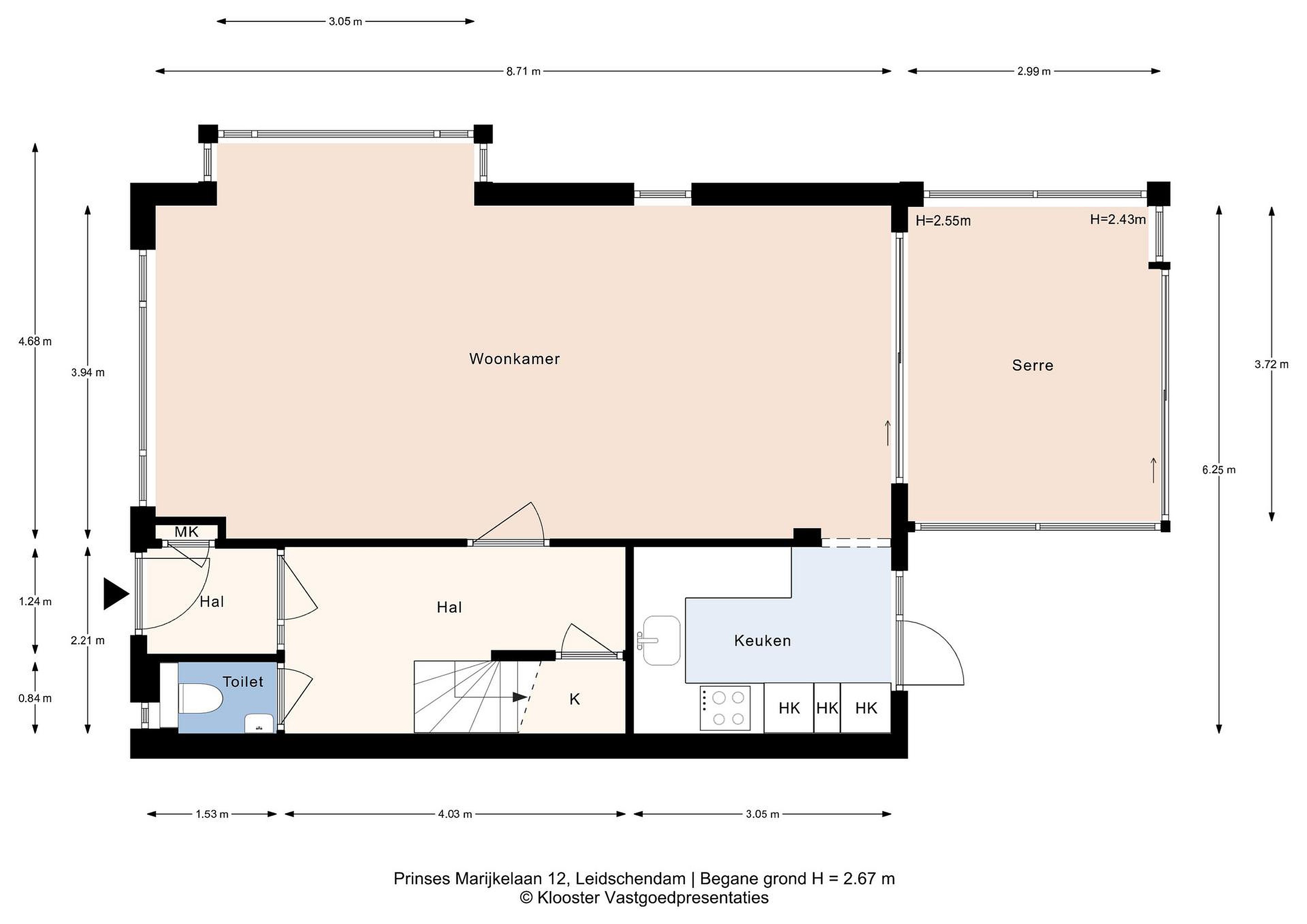 Entree via de hal met toegang tot het toilet, meterkast en trapopgang. Vanuit de hal bereikt u de lichte woonkamer, die dankzij de hoekligging een aangename sfeer heeft. Aansluitend bevindt zich de serre aan de achterzijde, die de leefruimte vergroot en een directe verbinding met de tuin biedt. De keuken is voorzien van een modern keukenblok met inbouwapparatuur en heeft eveneens toegang tot de tuin.