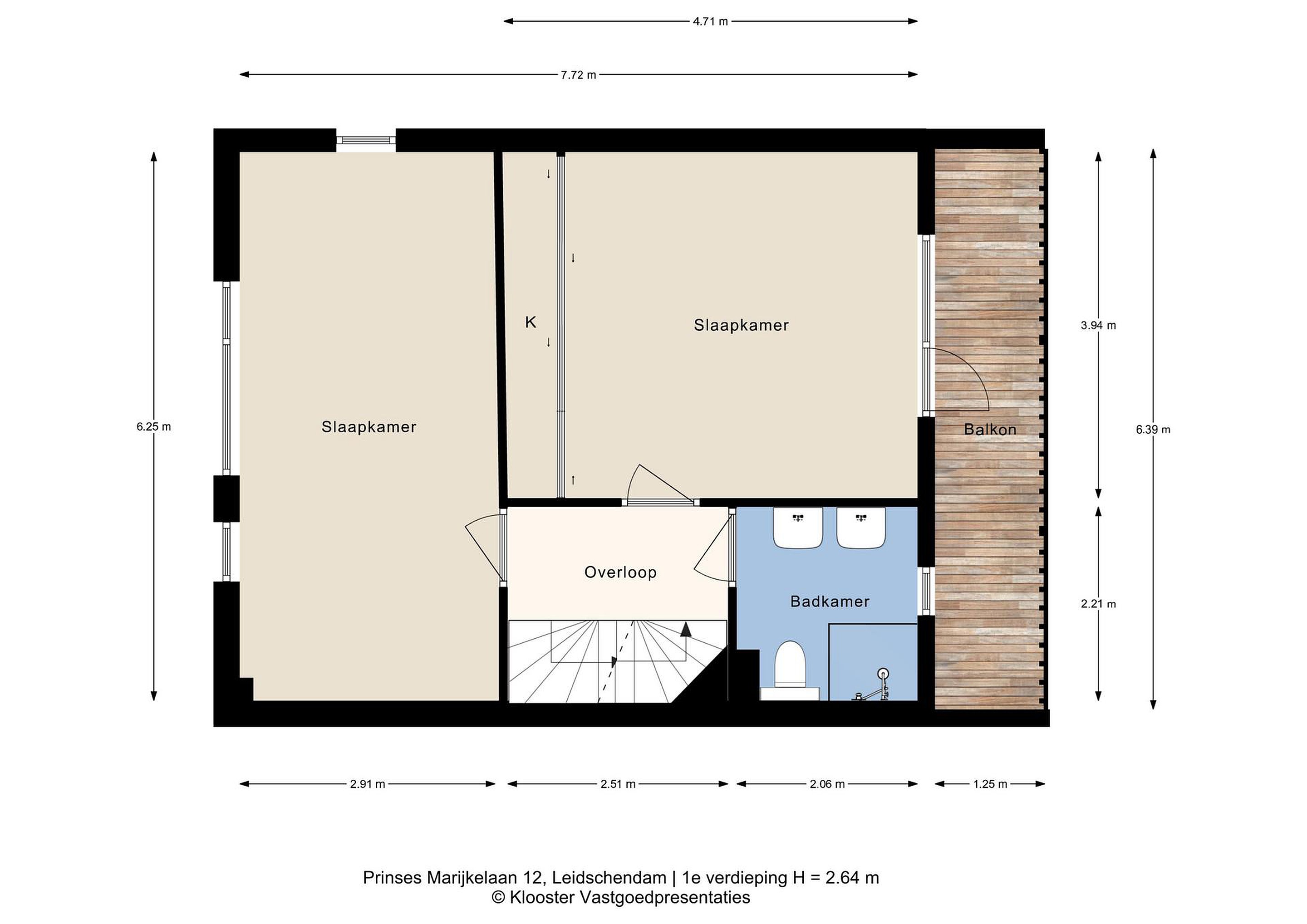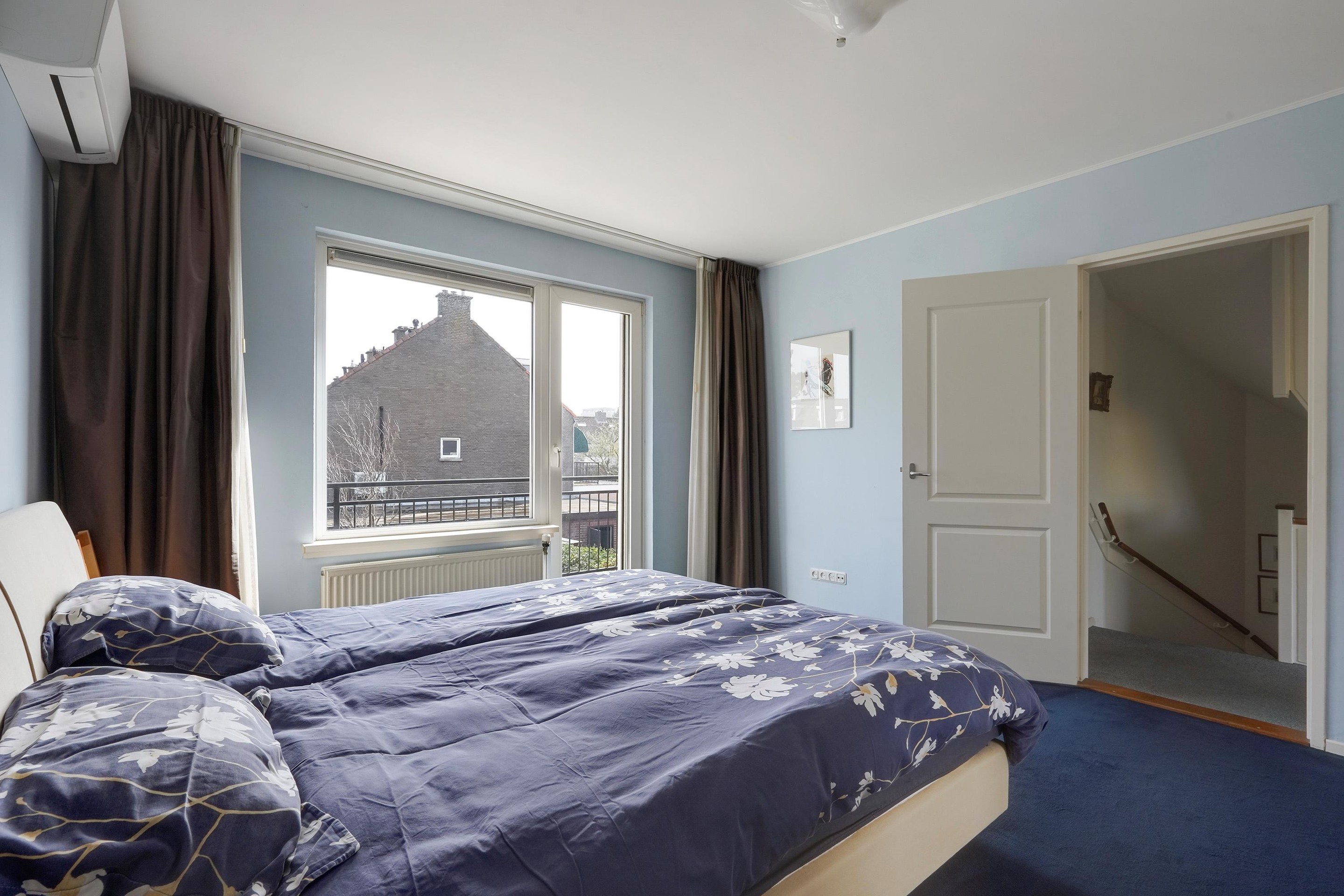 Overloop met toegang tot de slaapkamers en de badkamer. Aan de voorzijde bevindt zich een ruime slaapkamer, die desgewenst eenvoudig kan worden opgesplitst in twee volwaardige slaapkamers. Aan de achterzijde ligt een tweede slaapkamer met toegang tot het balkon. De badkamer is uitgerust met een douche, wastafel en toilet.