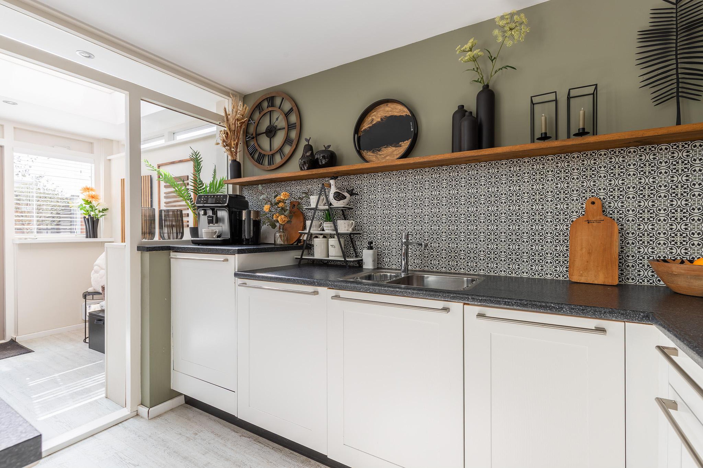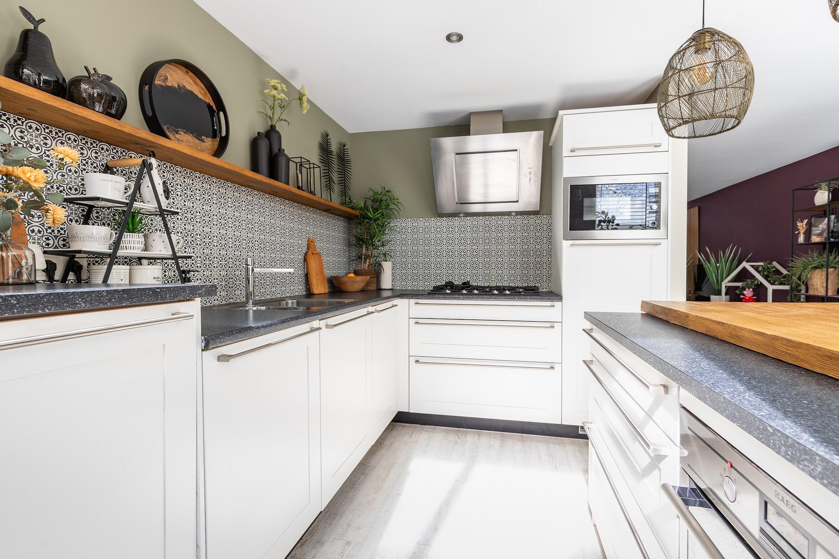 Begane grond Via de entree aan de voorzijde komt u in de hal met meterkast (5 groepen) en garderobe. De woonkamer is ruim en licht, mede door het raam in de zijgevel, en is voorzien van een pvc vloer met deels vloerverwarming. Aan de achterzijde bevindt zich de eethoek met open keuken en een bar voor twee personen. De keuken is uitgerust met onder andere een combi-oven, oven, vaatwasser, 5-pits gaskookplaat en een koel-/vriescombinatie. Vanuit de keuken is er toegang tot de bijkeuken met daklicht, die doorloopt naar de achtertuin. In de bijkeuken zijn aansluitingen voor wasmachine/droger.