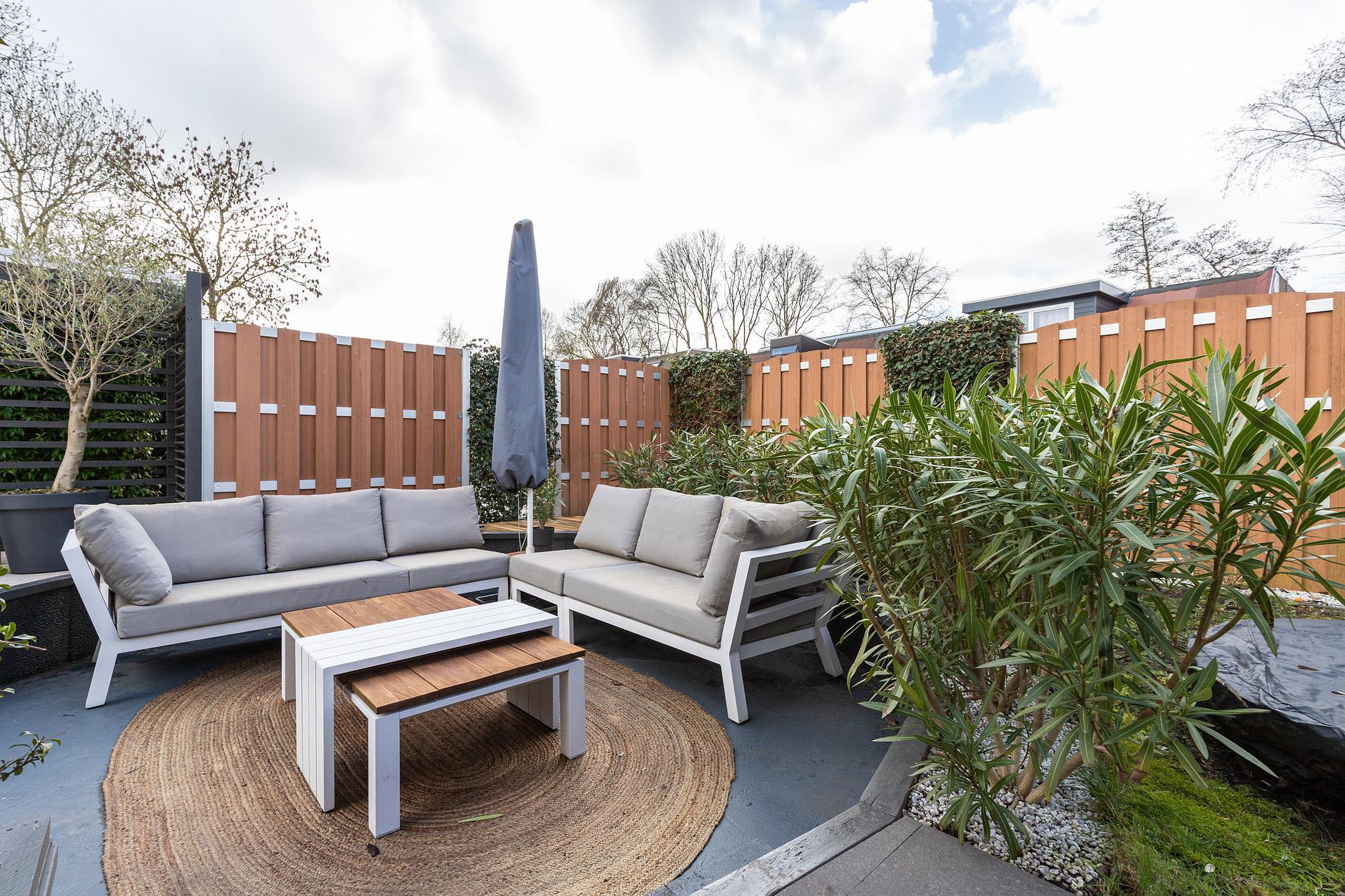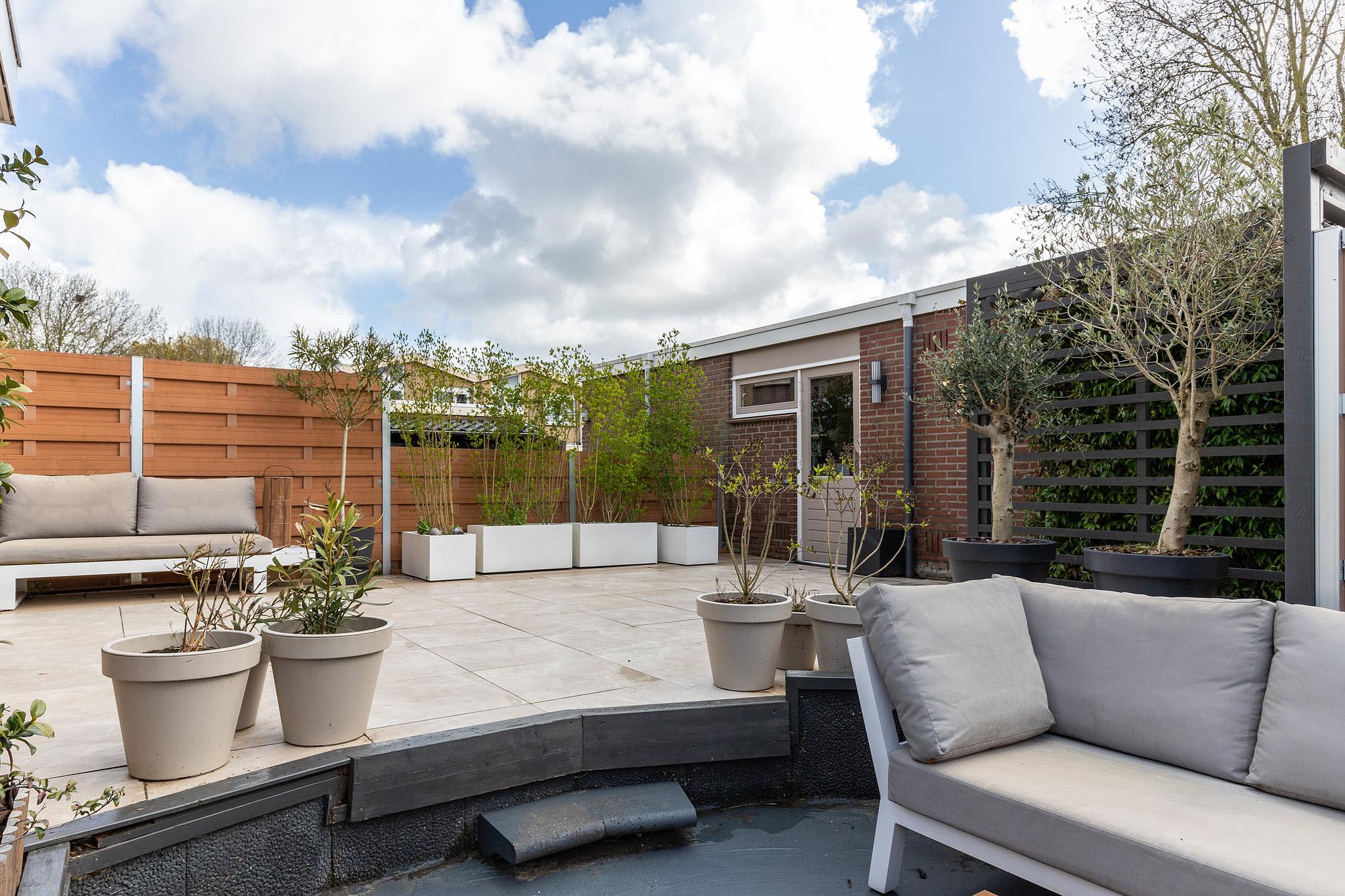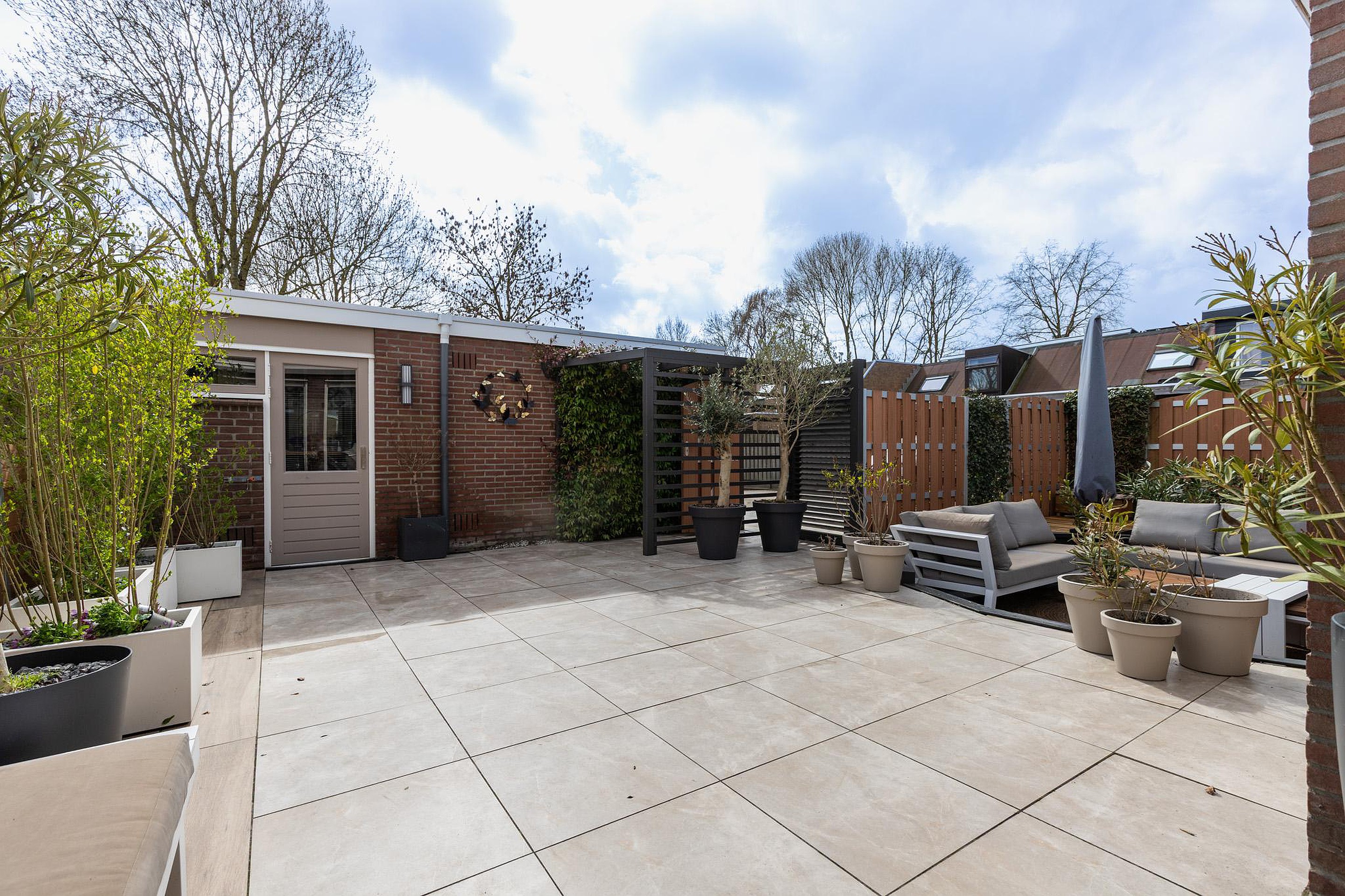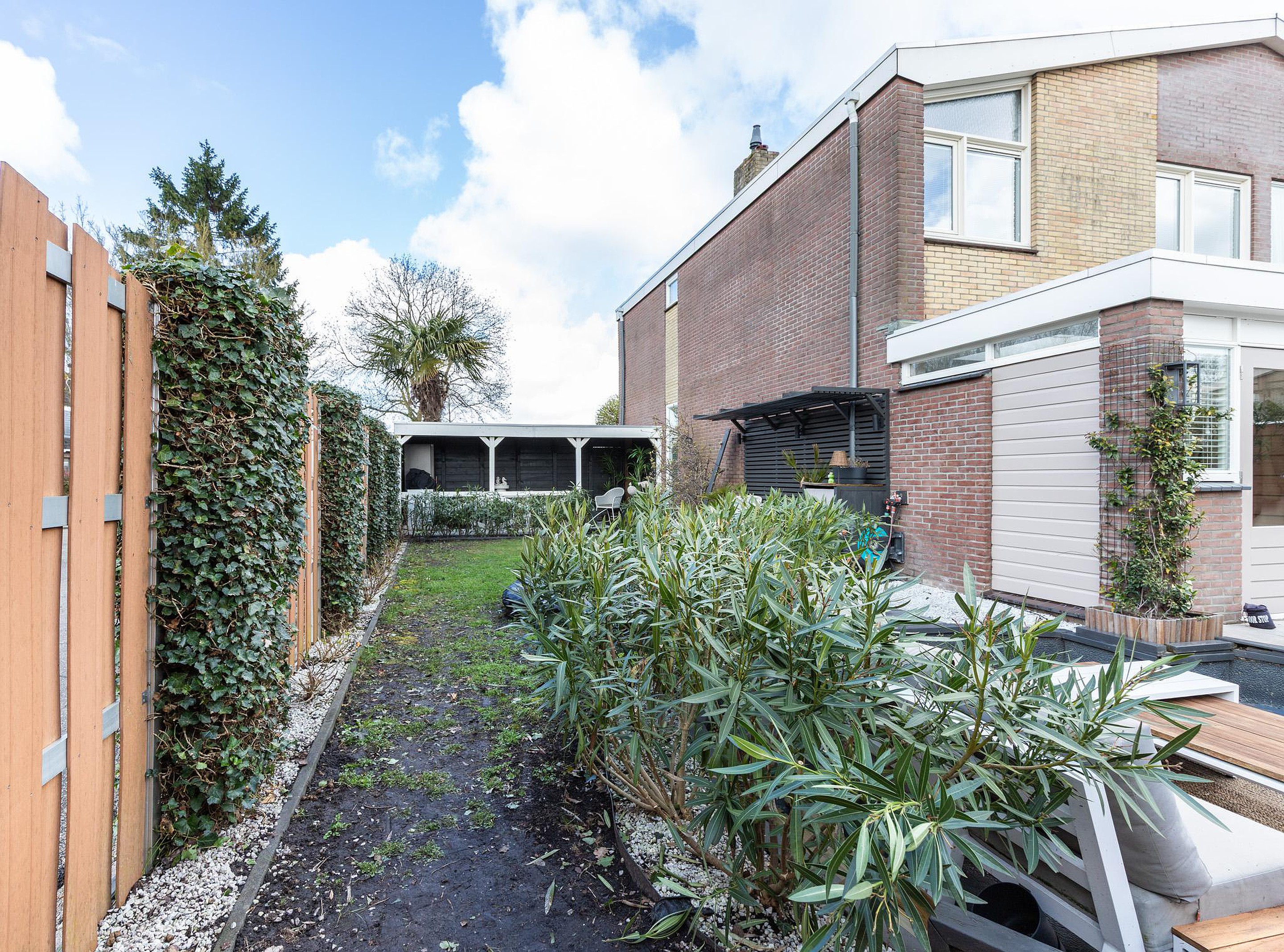 De achtertuin ligt op het zuiden en biedt volop ruimte om buiten te zitten. Achterin de tuin bevindt zich de ruime garage (9,50 x 2,63), bereikbaar vanuit de tuin en via de openbare weg. Aan de zijkant van de woning is een zitkuil en een overdekt terras, geschikt om buiten te koken en te eten.
