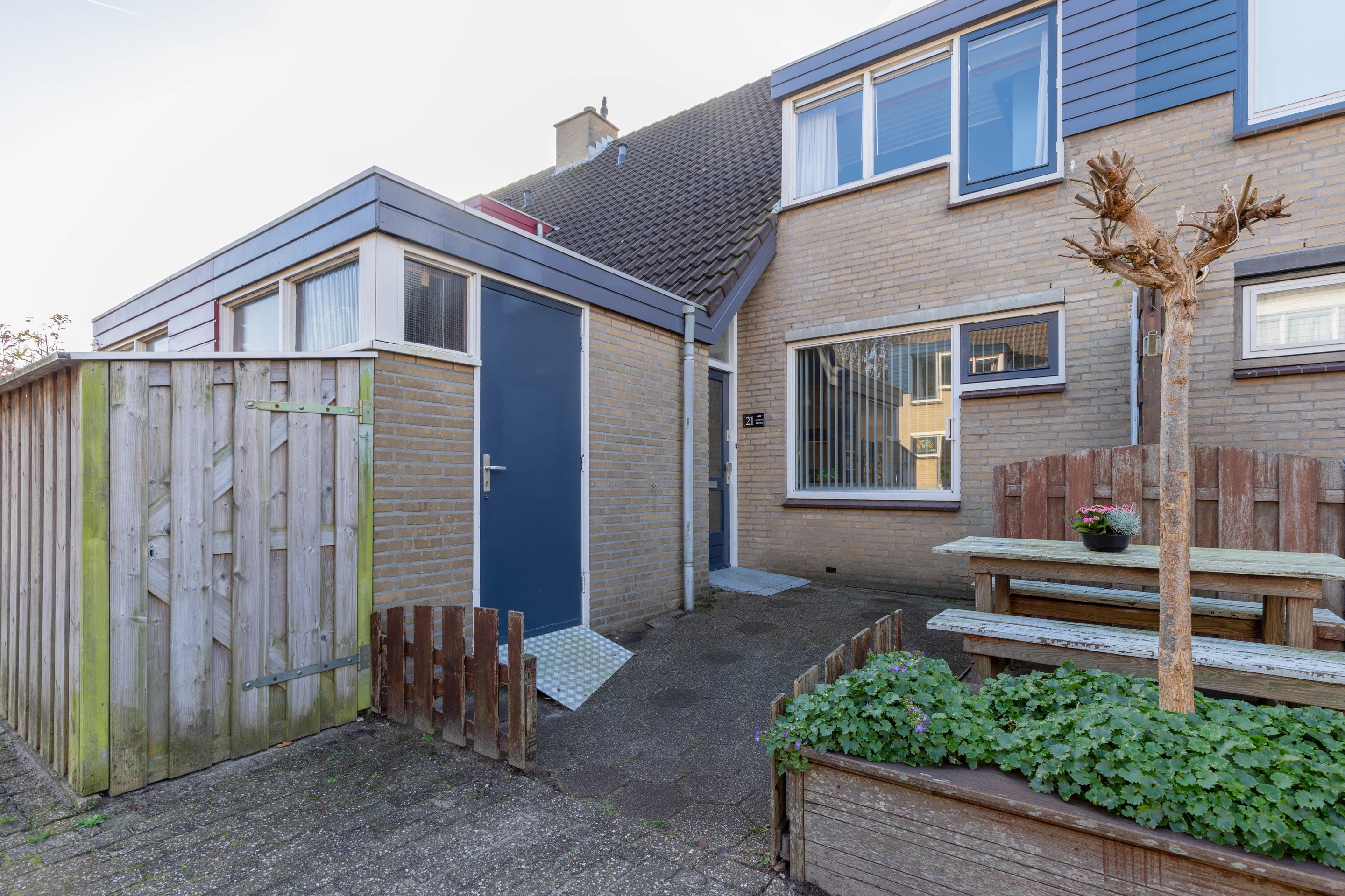 De tuin is speels en sfeervol ingericht met verhoogde borders, volwassen beplanting en een royale terrasruimte direct achter de woning. Dankzij de grote schuifpui vloeien binnen en buiten hier mooi in elkaar over, waardoor de tuin echt voelt als een verlengstuk van de woonkamer.