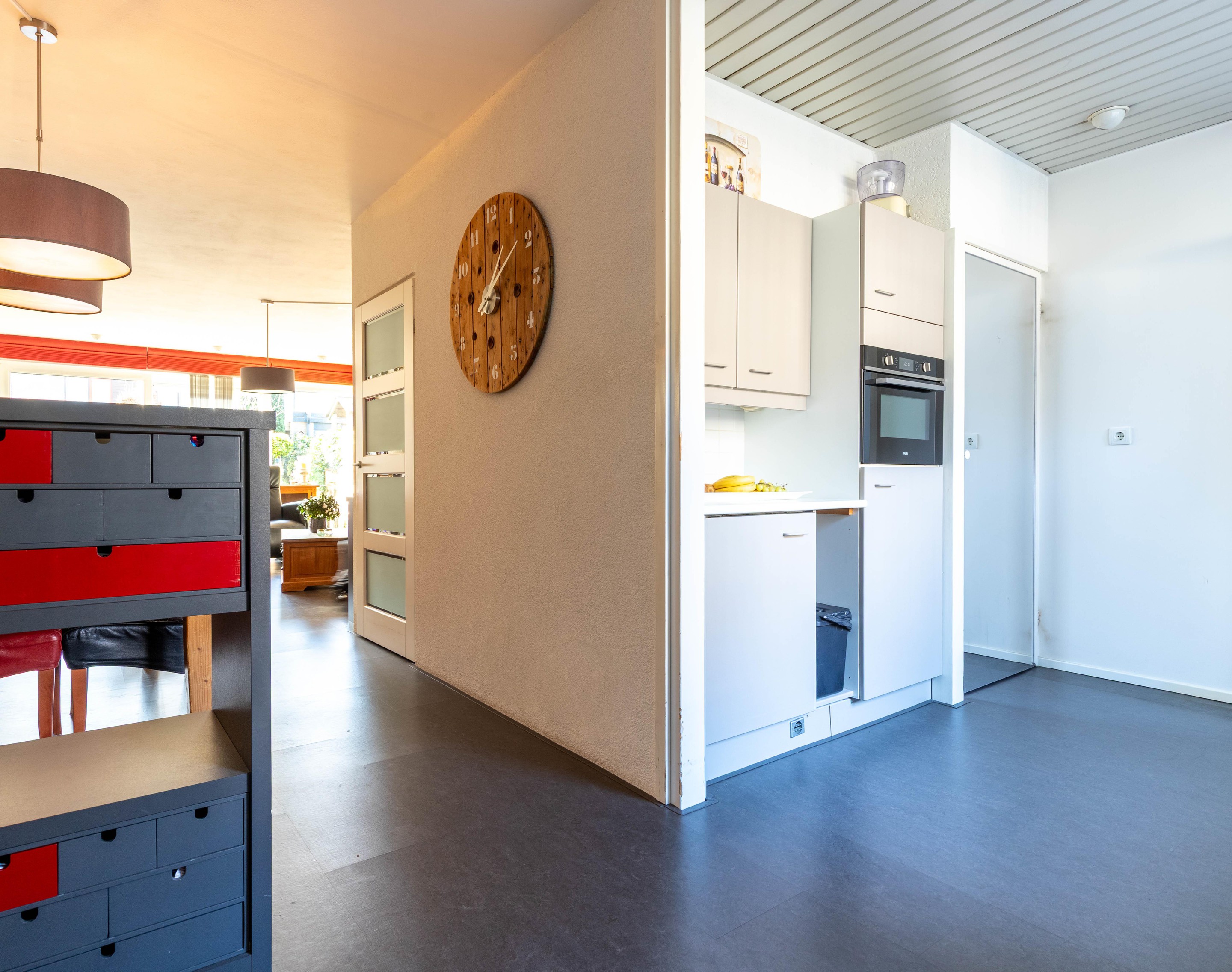Aan de voorzijde ligt de ruime half open keuken. Dankzij de strakke opstelling heb je veel werkblad, kastruimte en licht. Daarbij is er een grote inloopkast met veel bergruimte onder de trap en beschikt de keuken over diverse inbouwapparatuur.