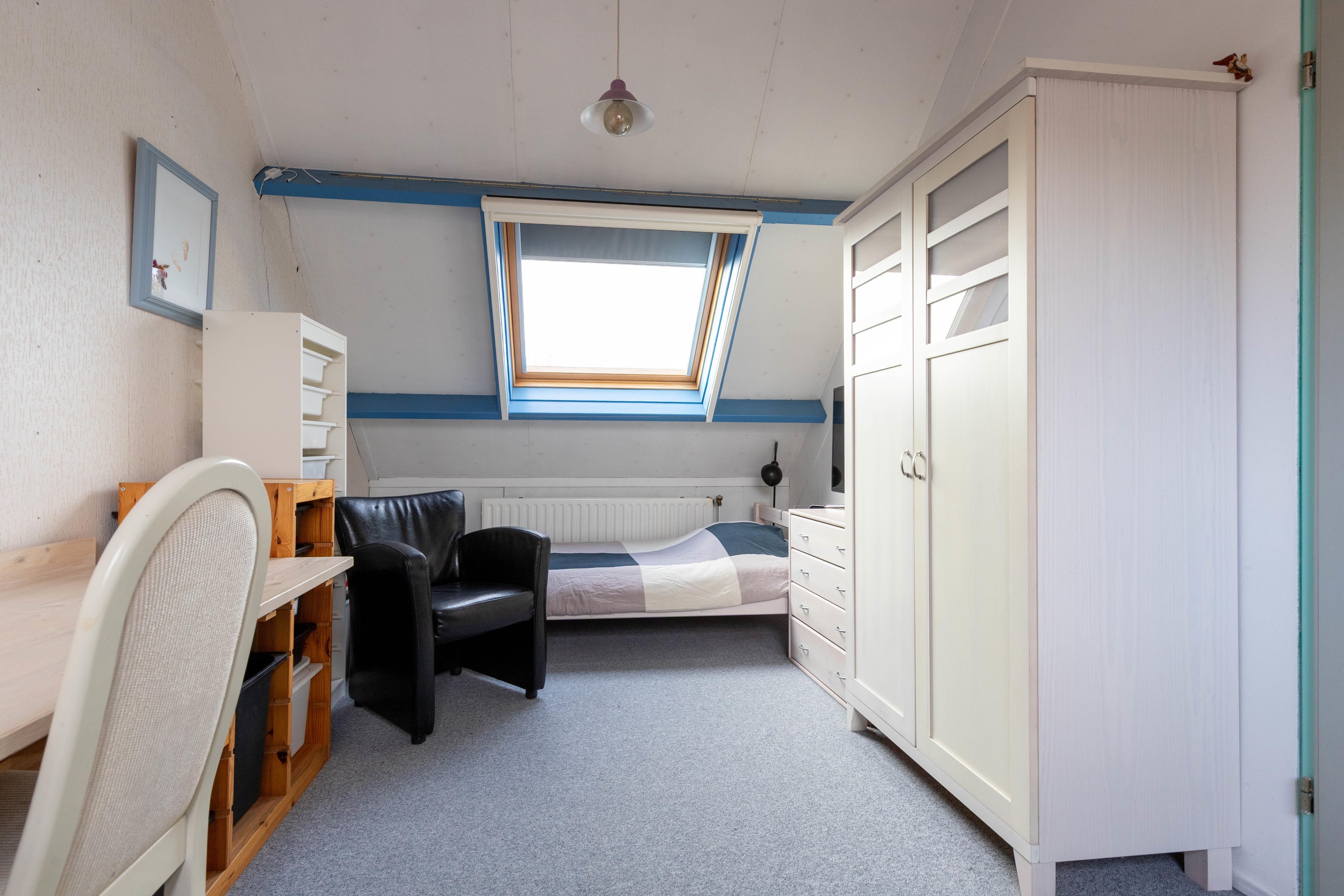 Vanuit de overloop is er toegang tot een ruime slaapkamer, die door de hoge nok en het goede lichtinval een fijne plek vormt als extra slaap-, werk- of hobbykamer. Bovendien beschikt deze verdieping over een handige bergvliering, ideaal voor het opbergen van seizoensspullen en andere zaken die je niet dagelijks nodig hebt.