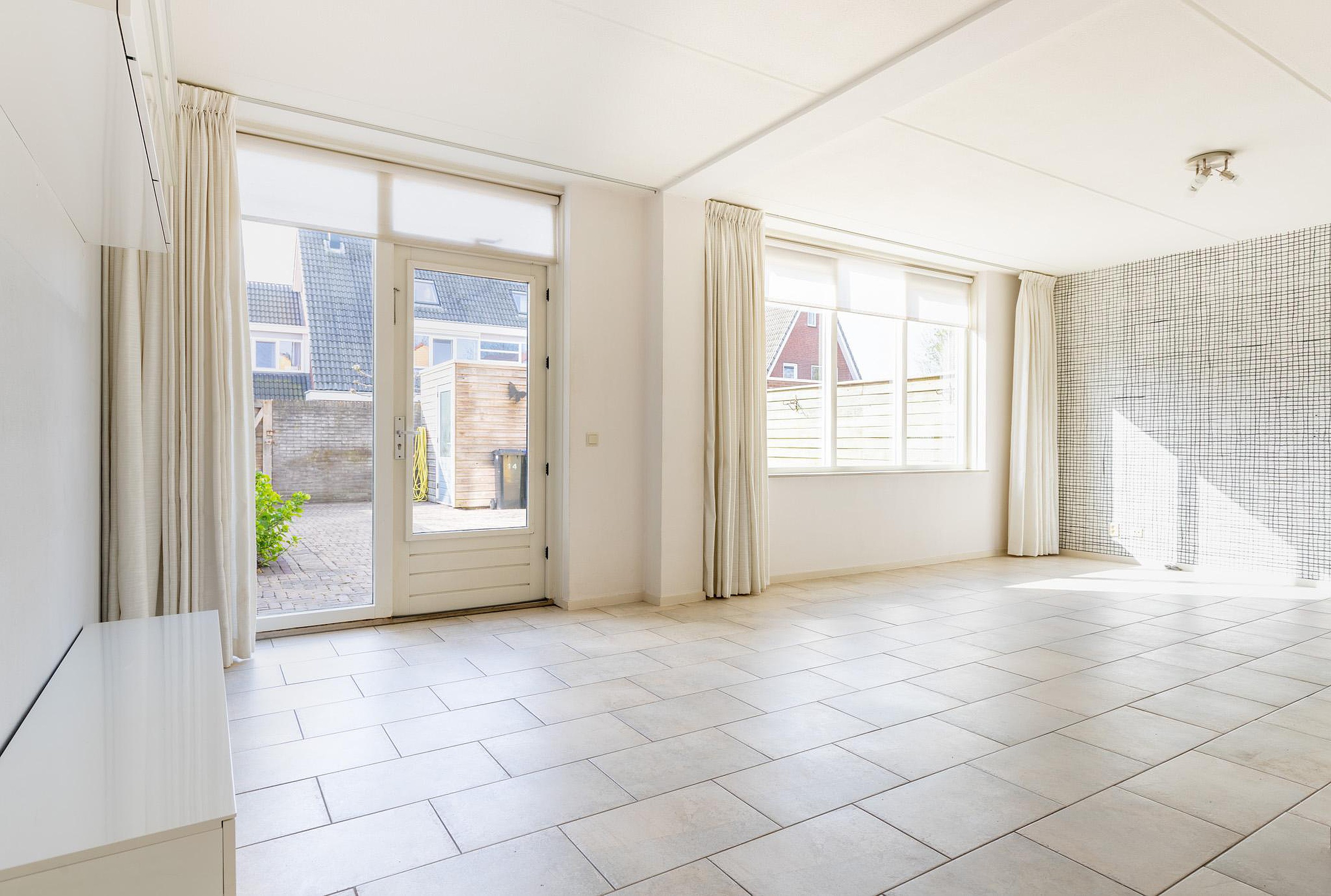 Vanuit de woonkamer is er directe toegang tot de achtertuin, wat zorgt voor een prettige verbinding tussen binnen en buiten.