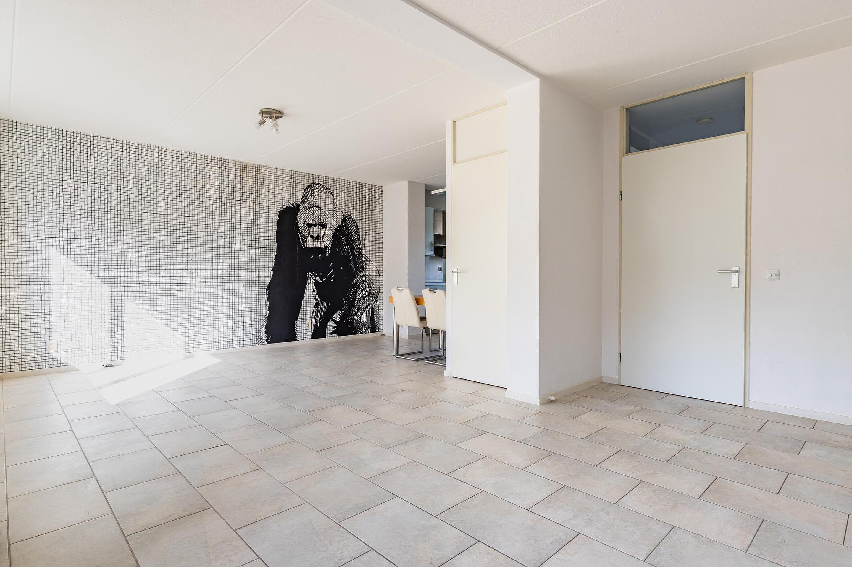Vanuit de hal betreed je de woonkamer, waar direct de fijne lichtinval opvalt dankzij de grote raampartijen aan de achterzijde. De woonkamer is ruim opgezet en biedt voldoende plaats voor een comfortabele zithoek en een royale eettafel. De praktische, ruimtelijke indeling maakt het mogelijk om de ruimte geheel naar eigen smaak en wens in te richten.