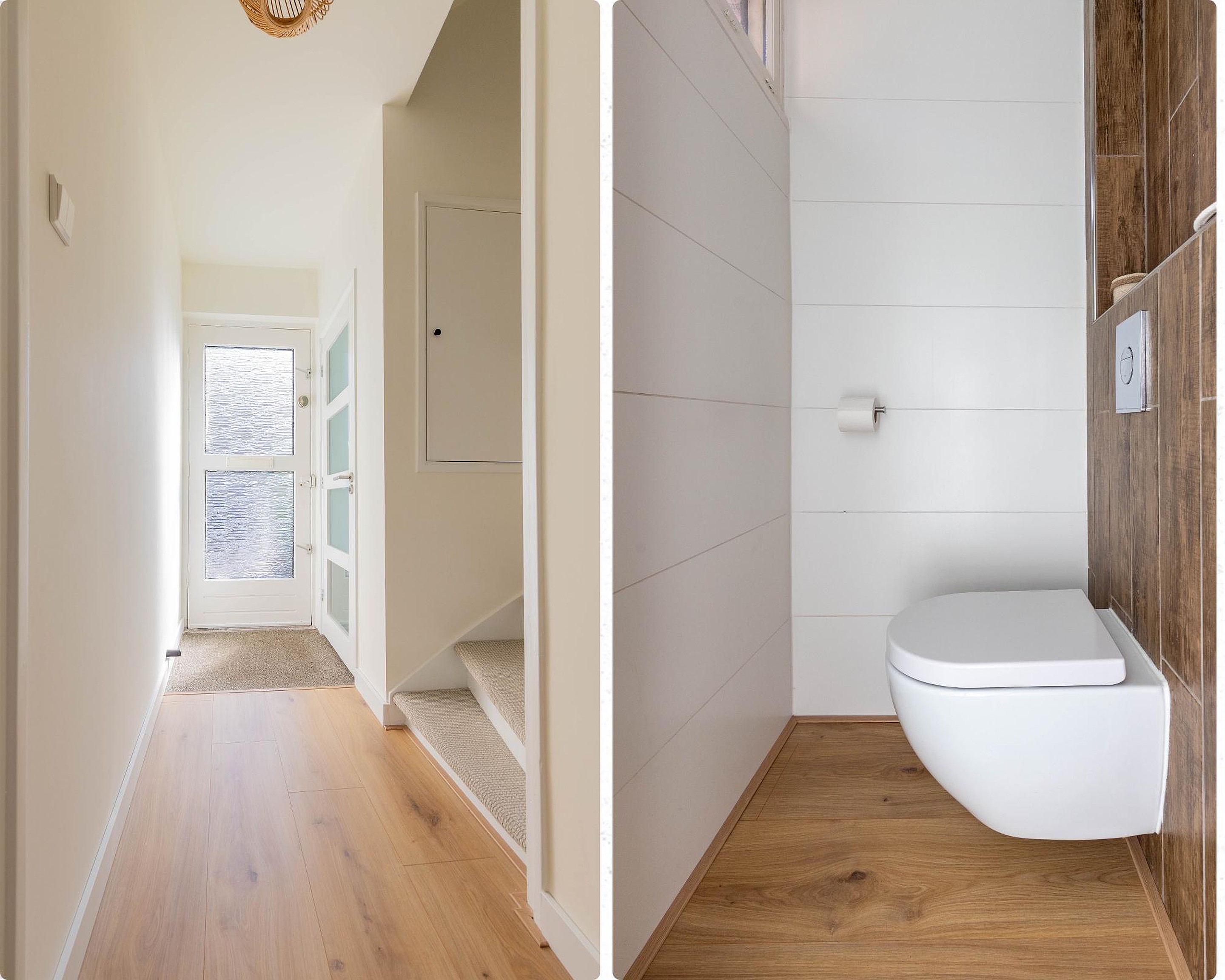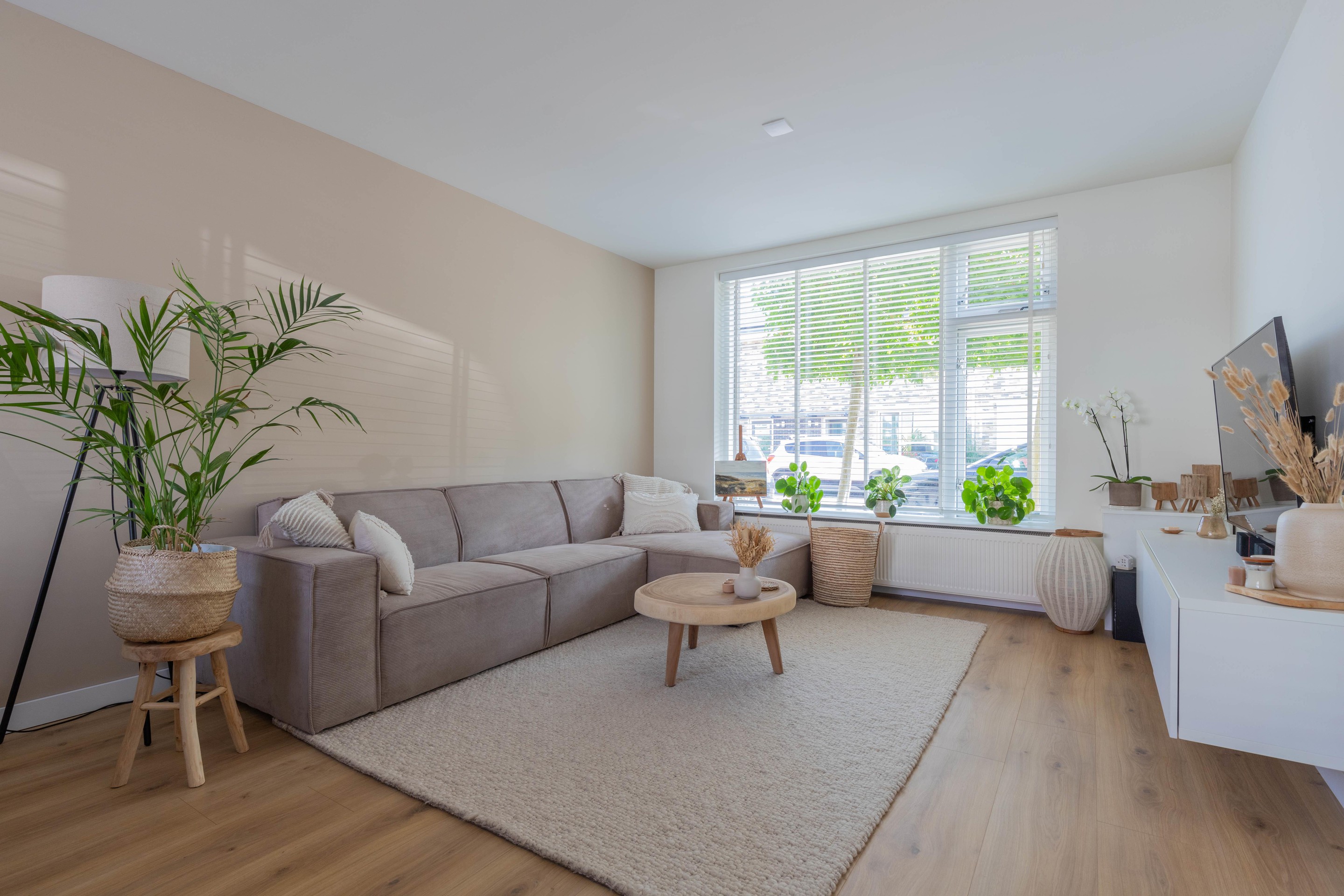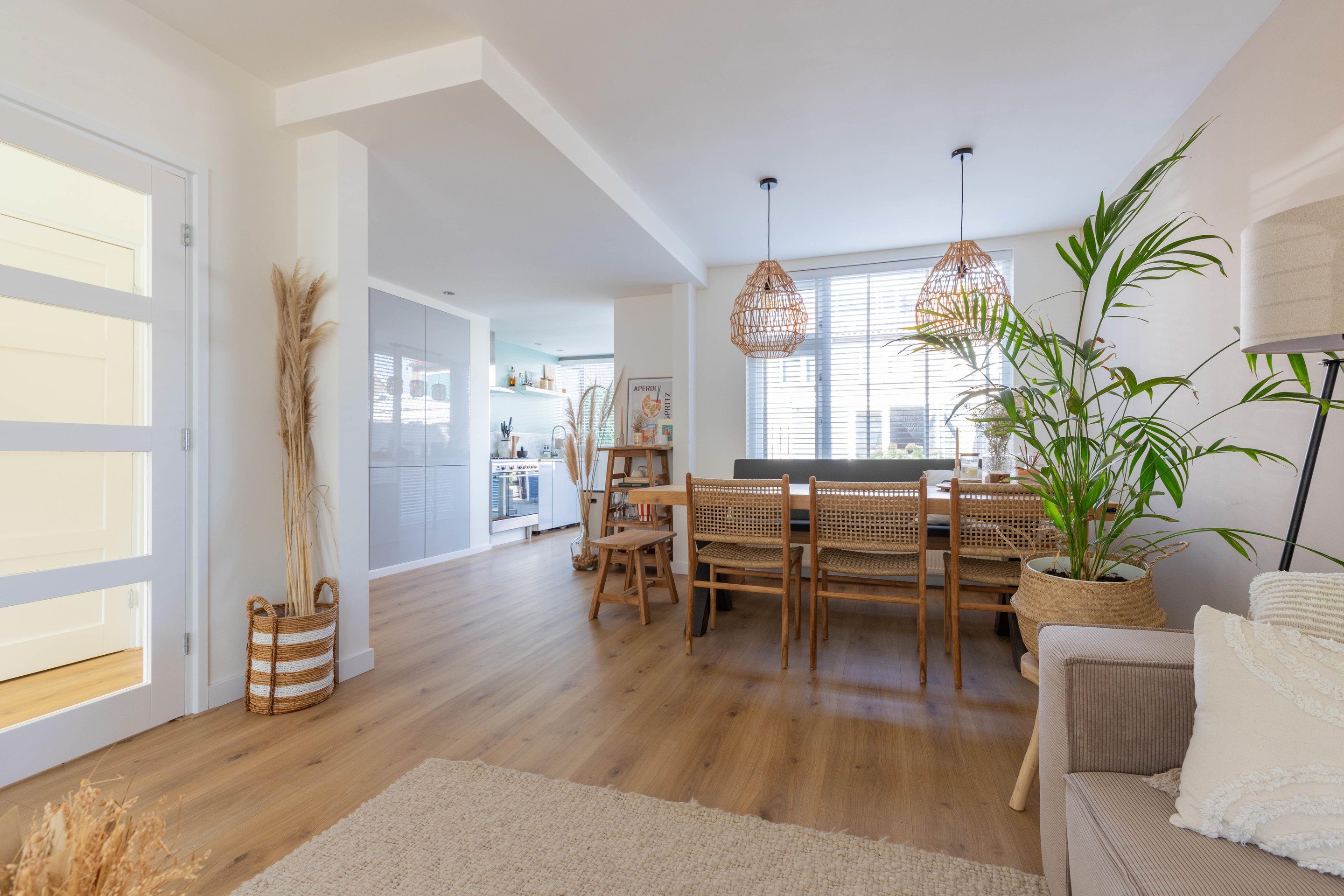 Entree woning: Je komt binnen in een lichte hal met moderne toiletruimte en handige trapkast. De lichte woonkamer heeft een fijne breedte en grote raampartijen, waardoor er volop daglicht naar binnen valt.