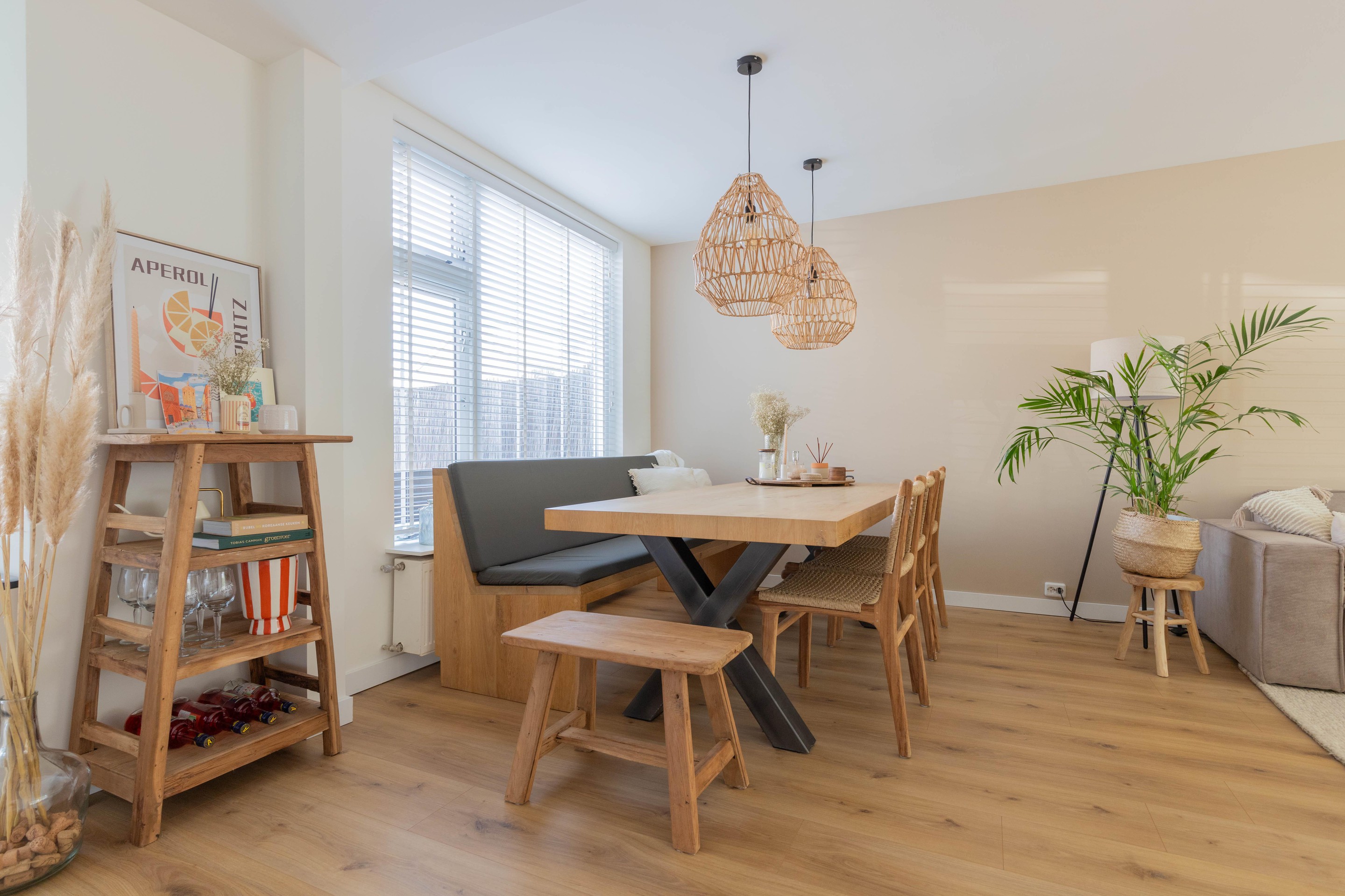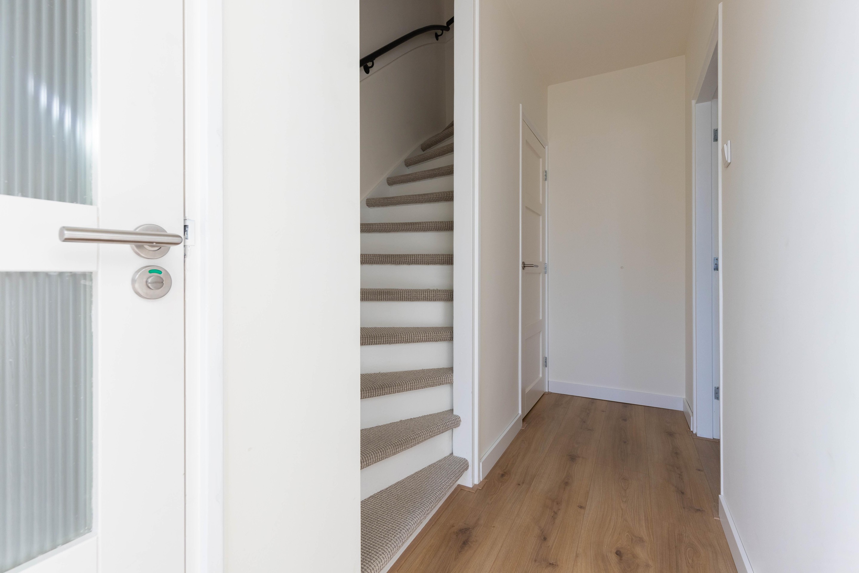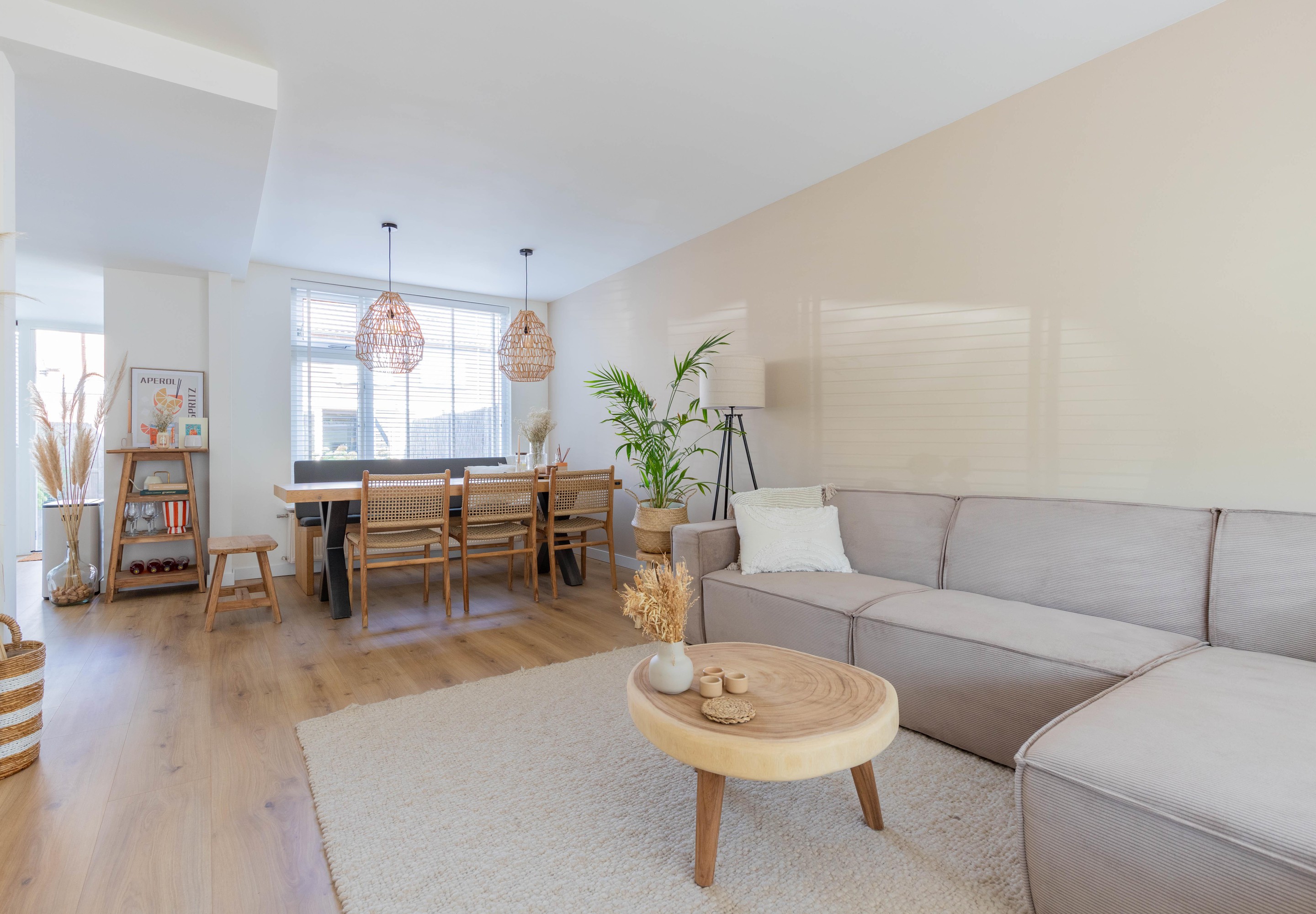 Entree woning: Je komt binnen in een lichte hal met moderne toiletruimte en handige trapkast. De lichte woonkamer heeft een fijne breedte en grote raampartijen, waardoor er volop daglicht naar binnen valt.