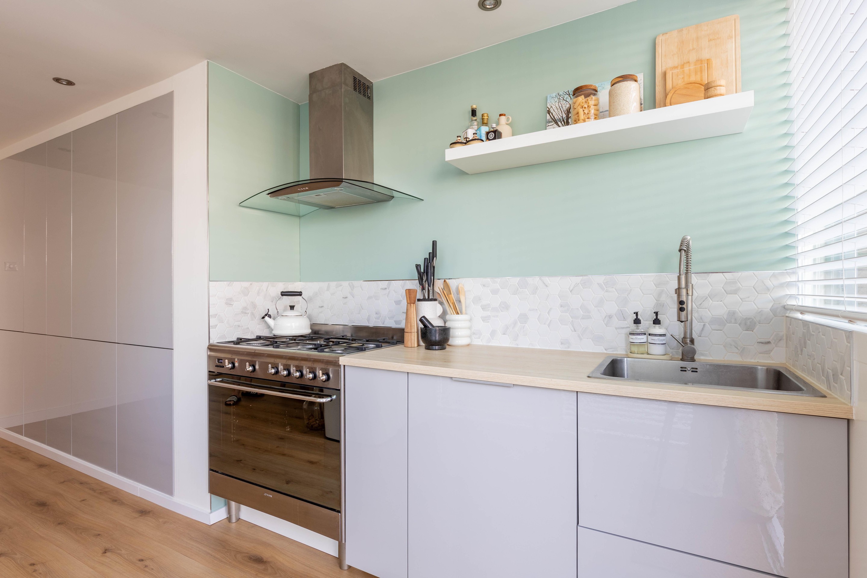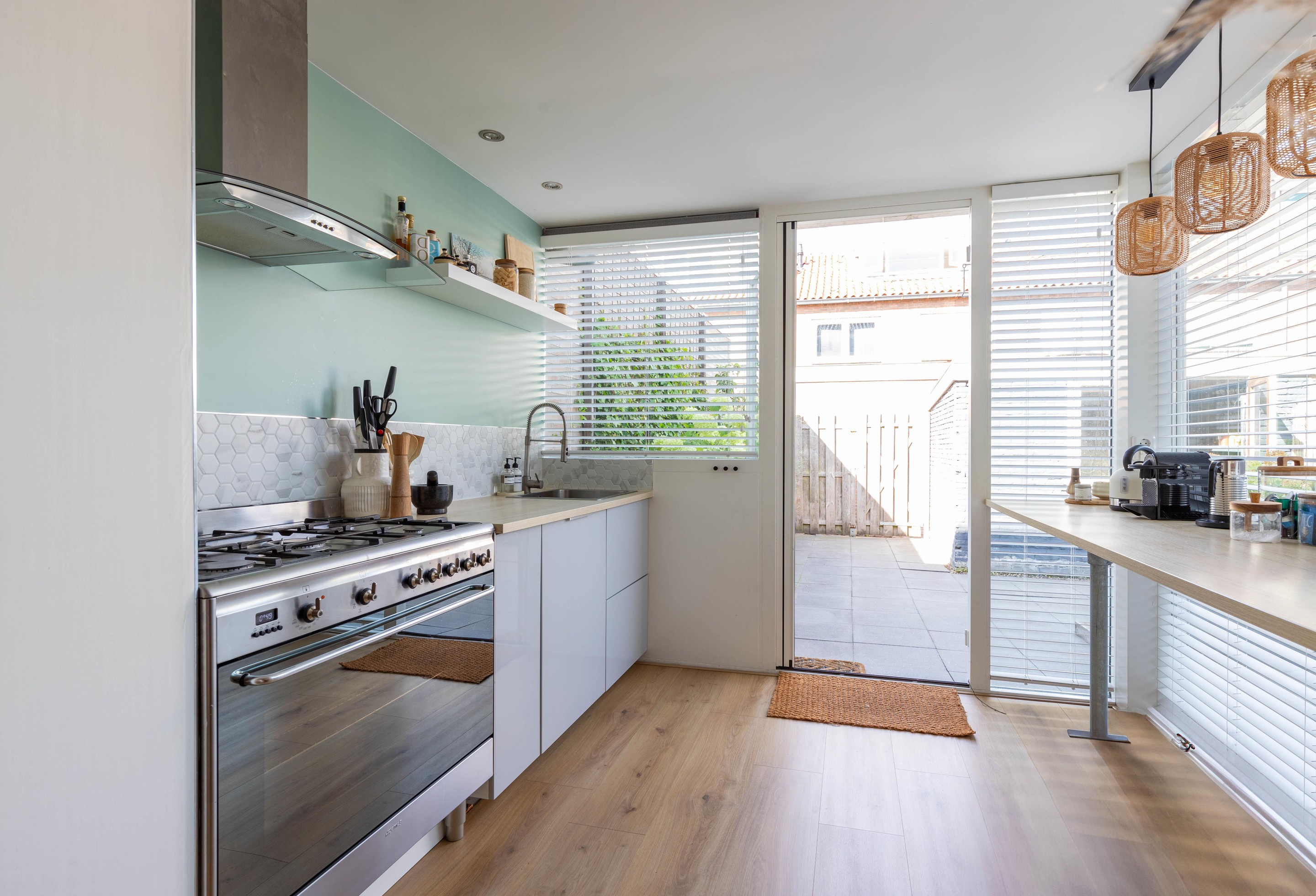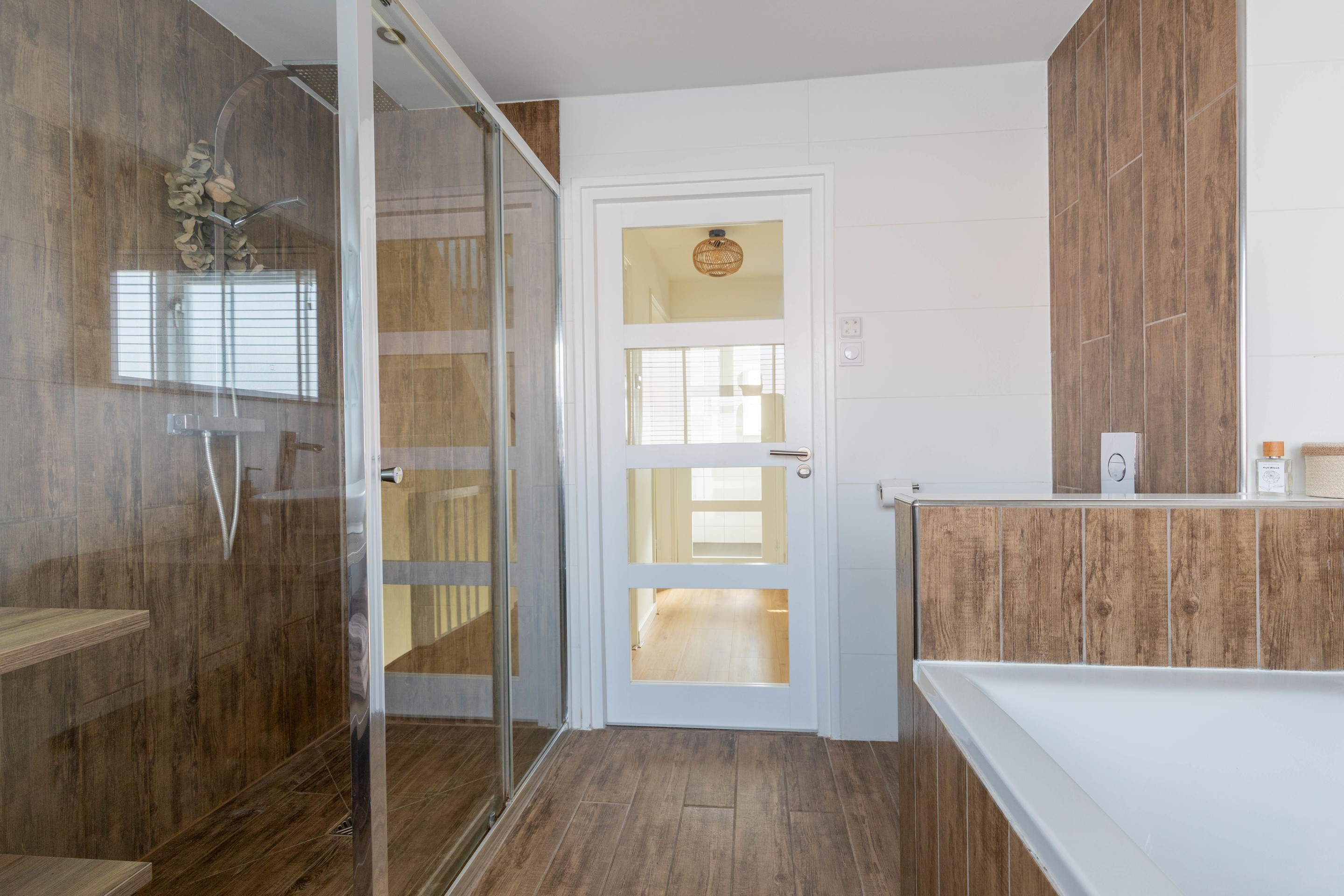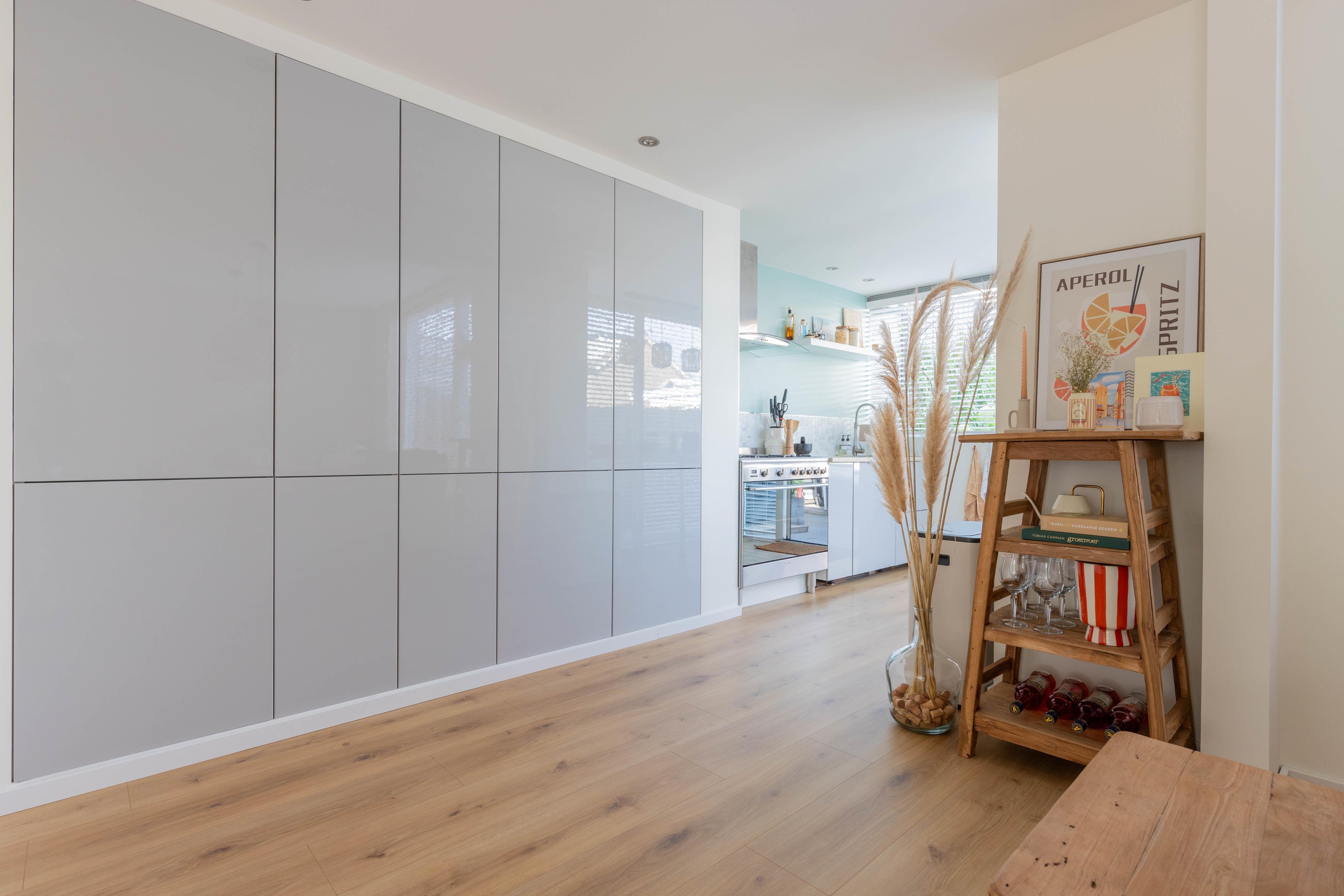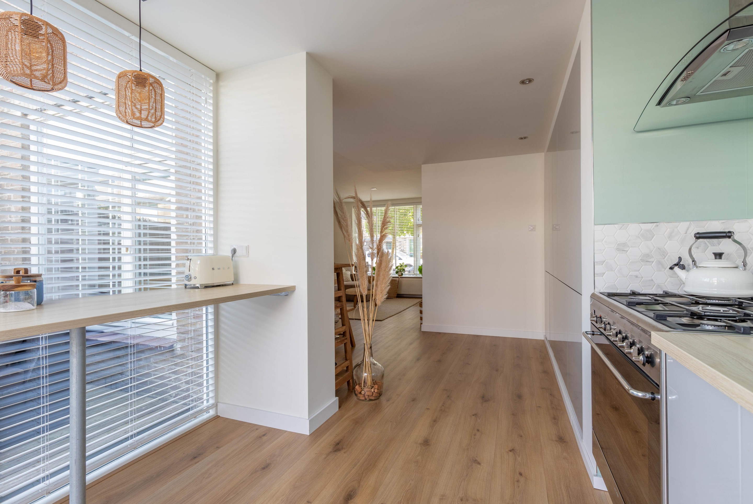 Aan de achterzijde bevindt zich de moderne keuken, slim geplaatst in de uitbouw. Deze keuken is voorzien van diverse inbouwapparatuur en een praktische kastenwand met veel bergruimte. Dankzij de open verbinding met de woonkamer geniet je hier van een ruimtelijk geheel, perfect om te koken en tegelijkertijd gezellig contact te houden met het gezin of gasten.