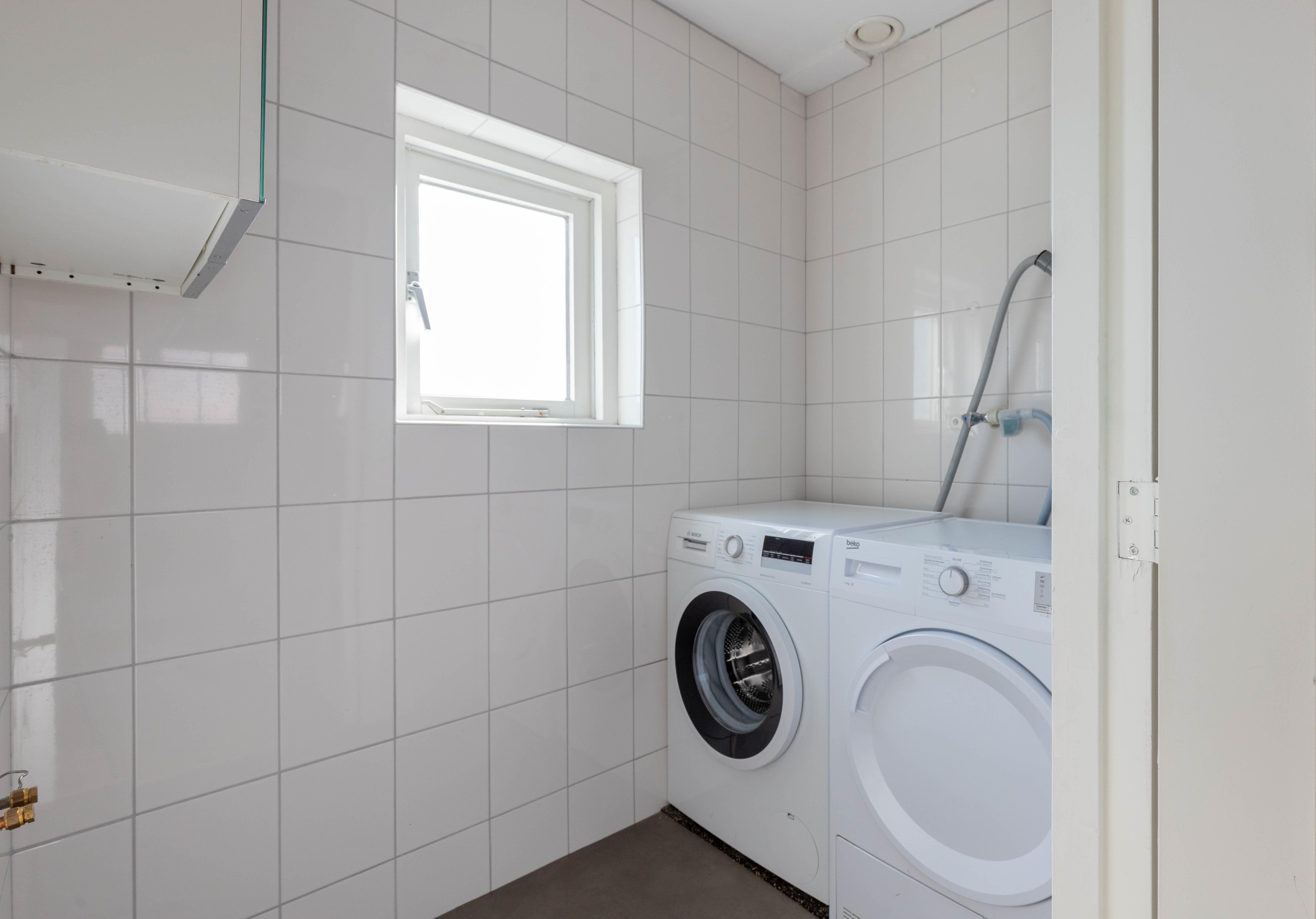 De voormalige kleine badkamer aan de voorzijde van de woning is slim omgetoverd tot praktische waskamer met aansluitingen voor wasmachine en droger.